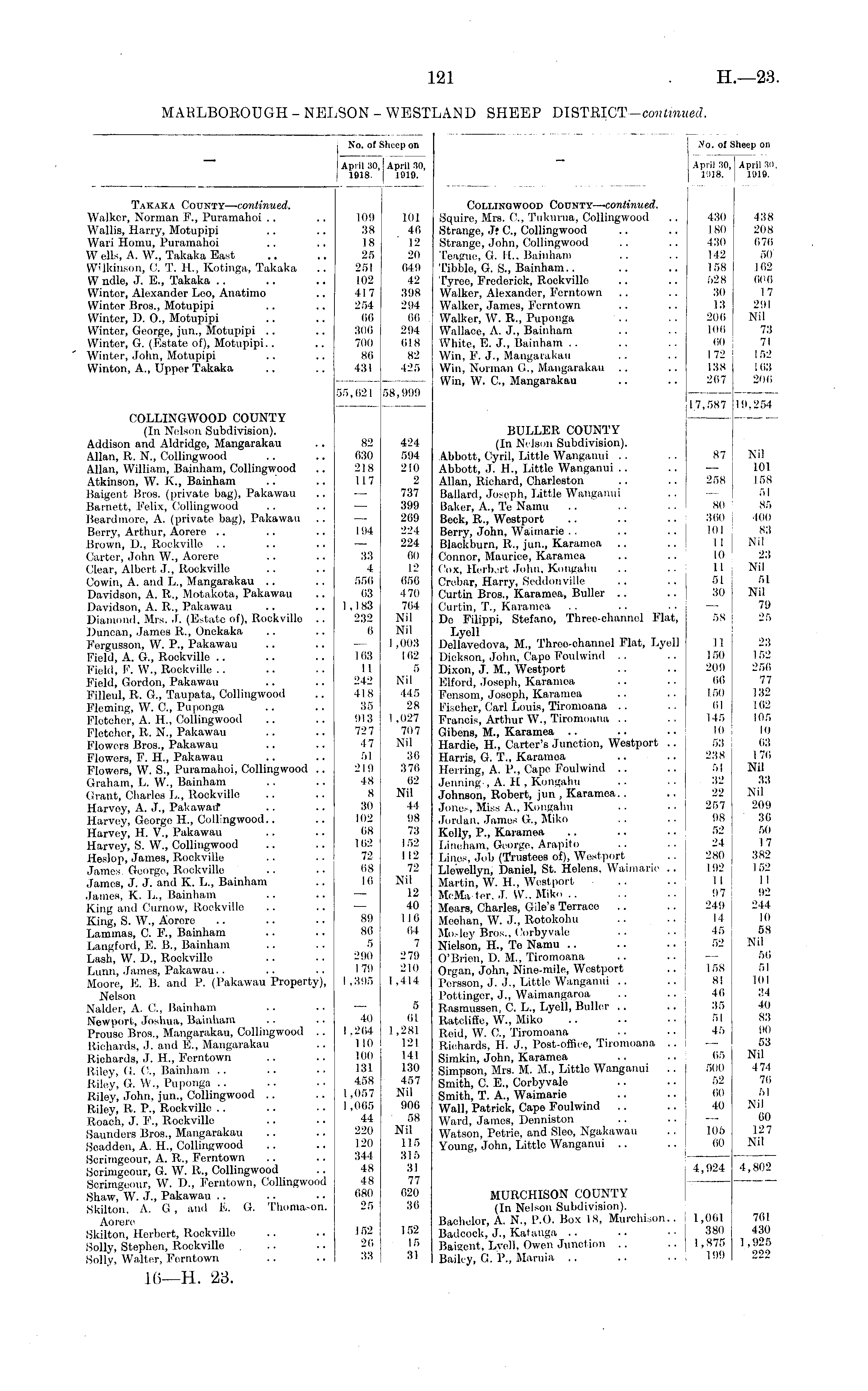 No. of Sheep on April 30, April 30, 1918. 1919. No. ol _ jheep on April 30, 1018. April 30 1!I19. Takaka County— continued. Walker, Norman F., Puramahoi Wallis, Harry, Motupipi Wari Homu, Puramahoi W ells, A. W., Takaka East Wilkinson, ('. T. H., Kotinga, Takaka W ndle, J. E., Takaka Wintor, Alexander Leo, Anatimo Wintor Bros., Motupipi Winter, D. 0., Motupipi Wintor, George, jun., Motupipi Winter, G. (Estate of), Motupipi.. Winter, John, Motupipi Winton, A., Upper Takaka 109 38 18 25 251 102 417 254 66 306 700 80 431 101 40 12 20 049 42 308 294 66 294 618 82 425 Collingwood County— continued. Squire, Mrs. ('., Tiikurua, Collingwood Strange, Jf C, Collingwood Strange, John, Collingwood Teague, G. II.. Bainham Tibbie, G. S., Bainham.. Tyroe, Frederick, Rockvillo Walker, Alexander, Ferntown Walker, James, Ferntown Walker, W. R., Puponga Wallace, A. J., Bainham White, E. J., Bainham Win, F. J., Mangarakau Win, Norman O., Mangarakau Win, W. G, Mangarakau 430 180 430 142 158 528 30 13 200 100 (i() 172 138 207 438 208 670 50 102 606 17 2!) I Nil 73 71 I 52 103 200 55,021 58,999 COLLINGWOOD COUNTY (In Nelson Subdivision). Addison and Aldridge, Mangarakau Allan, R. N., Collingwood Allan, William, Bainham, Collingwood Atkinson, W. K., Bainham Baigent Bros, (private bag), Pakawau Barnett, Felix, Collingwood Beardmore, A. (private bag), Pakawau Berry, Arthur, Aorere Brown, D., Rockville Carter, John W., Aorere Clear, Albert J., Rockville Cowin, A. and L., Mangarakau Davidson, A. R., Motakota, Pakawau Davidson, A. R., Pakawau Diamond. Mrs. J. (Estate of), Rockvillo .. Duncan, James R., Onekaka Fergusson, W. P., Pakawau Field, A. G., Rockville Field, I'. W., Rockville Field, Gordon, Pakawau Filleul, It. G., Taupata, Collingwood Fleming, W. G, Puponga Plotchor, A. H., Collingwood Fletchor, R. N., Pakawau Flowers Bros., Pakawau Flowers, F. H., Pakawau Flowers, W. S., Puramahoi, Collingwood .. Graham, L. W., Bainham Grant, Charles L., Rockvillo Harvey, A. J., Pakawaif Harvey, George H., Collingwood.. Harvey, H. V., Pakawau Harvey, S. W., Collingwood Heslop, James, Rockville Jamos. George, Rockville James, J. J. and K. L., Bainham James, K. L., Bainham King and Curnow, Rockvillo King, S. W., Aorere Lammas, G F, Bainham Langford, E. B., Bainham Lash, W. D., Rockville Lunn, James, Pakawau.. Moore, E. B. and P. (Pakawau Property), Nelson Nalder, A. C, Bainham Newport, Joshua, Bainham Prouse Bros., Mangarakau, Collingwood .. Richards, J. and E., Mangarakau Richards, J. H., Ferntown Riley, G. G, Bainham .. .. Riley, G. W., Puponga Riley, John, jun., Collingwood Riley, It. P., Rockville Roach, J. P., Rockville Saunders Bros., Mangarakau Scadden, A. H., Collingwood Sorimgeour, A. R., Ferntown Scrimgeour, G. W. It., Collingwood Scrimgeour, W. D., Ferntown, Collingwood Shaw, W. J., Pakawau Skilton, A. G , and E. G. Thomason, Aorere Skilton, Herbert, Rockville Solly, Stephen, Rockville Solly, Walter, Ferntown 82 030 218 117 104 33 4 556 63 1,183 232 6 163 II 242 418 35 913 727 47 51 219 48 8 30 102 68 I 62 72 68 16 424 594 210 2 737 399 269 224 224 60 12 656 470 764 Nil Nil I ,003 162 5 Nil 445 28 1,027 707 Nil 30 376 62 Nil 44 98 73 152 112 72 Nil 12 40 I 16 64 7 279 210 1,414 BULLER COUNTY (In Nelson Subdivision). Abbott, Cyril, Little Wanganui Abbott, J. H., Little Wanganui Allan, Richard, Charleston Ballard, Joseph, Little Wanganui Baker, A., To Namu Beck, R., Westport Berry, John, Waimarie Blackburn, It., jun., Karamoa Connor, Maurice, Karamea Cox, Herbert John, Kongahu Crebar, Harry, Seddonville Curtin Bros., Karamea, Buller Curtin, T., Karamea De Filippi, Stefano, Three-channel Flat, Lyell Dellavedova, M., Throe-channel Flat, Lyell Dickson, John, Capo Foulwind Dixon, J. M., Westport Elford, Joseph, Karamea Fensom, Joseph, Karamea Fischer, Carl Louis, Tiromoana Francis, Arthur W., Tiromoana .. Gibena, M., Karamea Hardie, H., Carter's Junction, Westport .. Harris, G. T., Karamea Herring, A. P., Cape Foulwind Jenning-, A. H , Kongahu Johnson, Robert, jun , Karamea.. Jones, Miss A., Kongahu Jordan, James G, Miko Kelly, P., Karamea I.ineham. George, Arapito Lines, Job (Trustees of), Westport Llewellyn, Daniel, St. Helens. Waimarie .. Martin, W. H., Westport MeMa tor. J. W.. Miko .. Mears, Charles, Gile's Terrace Median, W. J., Rotokohu Mo.-ley Bros.. Corby vale Nielson, H., Te Namu O'Brion, D, M., Tiromoana Organ, John, Nine-mile, Westport Persson, J. J., Little Wanganui Pottinger, J., Waimangaroa Rasmussen, C. L., Lyell, Buller Ratcliffe, W., Miko Reid, W. G, Tiromoana Richards, H. J., Post-office, Tiromoana .. Simkin, John, Karamea Simpson, Mrs. M. M„ Littlo Wanganui Smith, C. E., Corbyvale Smith, T. A., Waimarie Wall, Patrick, Capo Foulwind Ward, James, Denniston Watson, Petrie, and Slco, Ngakawau Young, John, Little Wanganui 17,587 87 258 80 360 101 11 10 11 51 30 58 I 1 150 209 00 150 01 145 10 53 238 51 32 22 257 98 52 24 280 I 92 I I 97 249 14 45 52 19,254 Nil 101 158 51 85 400 83 Nil 23 Nil 51 Nil 79 25 23 152 256 77 132 162 105 10 63 176 Nil 33 Nil 209 36 50 17 382 152 II 92 244 10 58 Nil 56 51 101 34 40 83 90 53 Nil 474 70 51 Nil 60 127 Nil 89 86 5 290 179 1,395 5 (il 1,281 121 141 130 457 Nil 900 58 Nil 11 5 315 31 77 020 30 158 81 40 35 51 45 40 1.264 I 10 100 131 458 1,057 I ,065 44 220 120 344 48 48 680 25 65 500 52 00 40 105 00 4,924 4,802 152 26 33 152 15 31 MURCHISON COUNTY (In Nelson Subdivision). Bachelor, A. N., P.O. Box 18, Murchison.. Badoock, J., Katanga Baigent, Lvell. Owen Junction Bailey, G. P., Maruia 1,061 380 1,875 199 701 430 1,925 222
