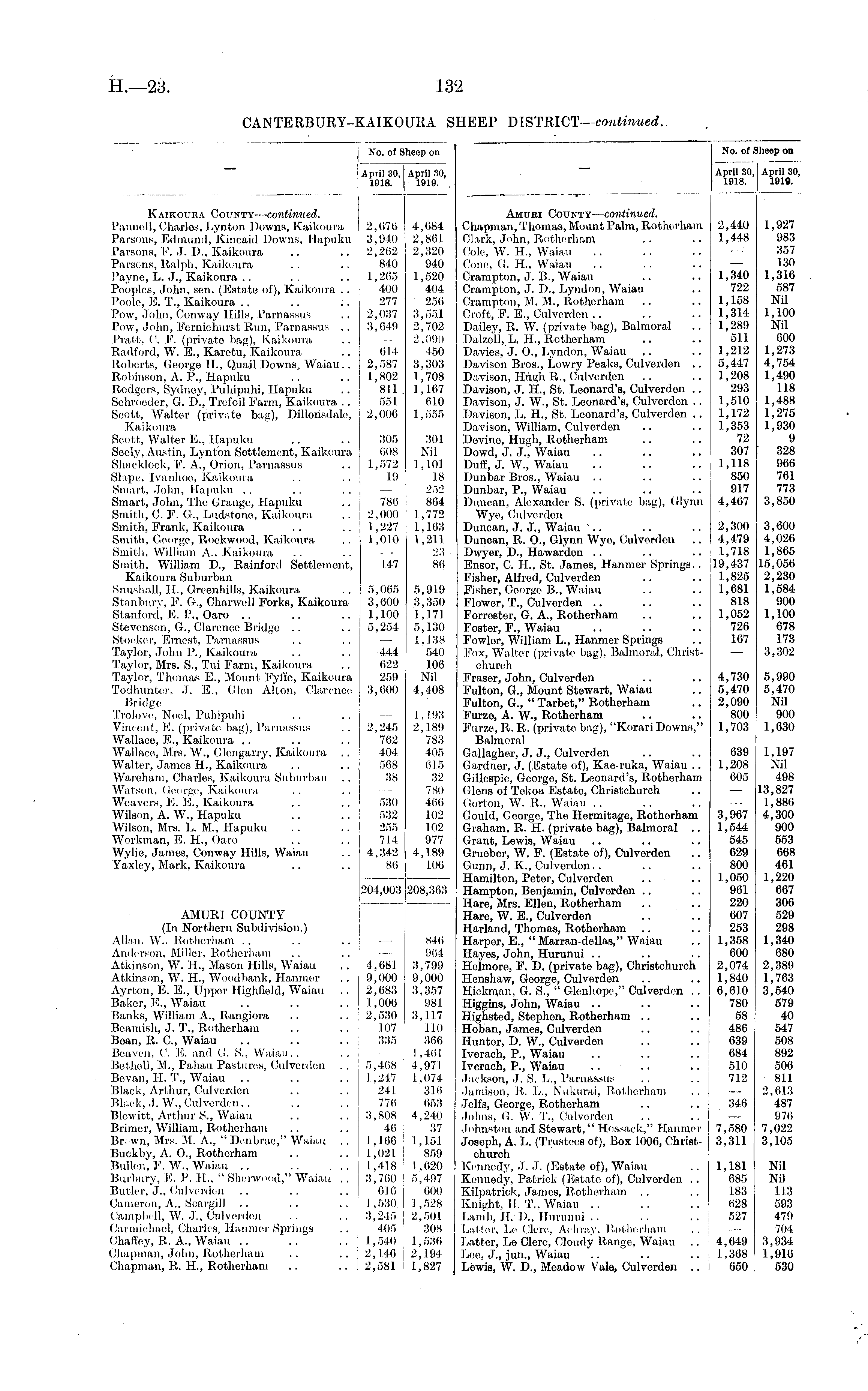 No. of Sheep on No. of J April 39, 1918. i heep on April 30, 1910. April 39, 1918. April 39, 1919. Kaikouea County-— continued. Pannell, Charlos, Lynton Downs, Kaikoura Parsons, Edmund, Kincaid Downs, Hapuku Parsons, F. J. D., Kaikoura Parsons, Ralph, Kaikoura Payne, L. J., Kaikoura Peoples, John, sen. (Estate of), Kaikoura .. Poole, E. T., Kaikoura Pow, John, Conway Hills, Parnassus Pow, John, Ferniehurst Run, Parnassus .. Pratt, C. P. (private bag), Kaikoura Radford, W. E., Karetu, Kaikoura Roberts, George H., Quail Downs, Waiau.. Robinson, A. P., Hapuku Rodgers, Sydne}', Puhipuhi, Hapuku Schroeder, G. D., Trefoil Farm, Kaikoura .. Seott, Walter (private bag), Dillonsdale, Kaikoura Scott, Walter E., Hapuku Secly, Austin, Lynton Sottloment, Kaikoura Shacklock, F. A., Orion, Parnassus Slape. Ivanhoe, Kaikoura Smart, John, Hapuku Smart, John, The Grange, Hapuku Smith, C. F. G., Ludstone, Kaikoura Smith, Frank, Kaikoura Smith, George, Rockwood, Kaikoura Smith, William A., Kaikoura Smith. William D., Rainford Settlement, Kaikoura Suburban Snushall, H., GreenhiUs, Kaikoura Stanbury, F. G., Charwcll Forks, Kaikoura Stanford, E. P., Oaro Stevenson, G., Clarence Bridge .. Stoeker, Ernest, Parnassus Taylor, John P., Kaikoura Taylor, Mrs. S., Tui Farm, Kaikoura Taylor, Thomas E., Mount Fyffe, Kaikoura Todhunter, J. E.,. Glen Alton, Clarence Bridge Trolove, Noel, Puhipuhi Vincent, E. (private bag), Parnassus Wallace, E., Kaikoura Wallace, Mrs. W., Glengarry, Kaikoura .. Walter, James H., Kaikoura Wareham, Charles, Kaikoura Suburban . . Watson, George, Kaikoura Weavers, E. E., Kaikoura Wilson, A. W., Hapuku Wilson, Mrs. L. M., Hapuku Workman, E. H., Oaro Wylie, James, Conway Hills, Waiau Yaxle)', Mark, Kaikoura 2,676 3,940 2,262 840 1,265 400 277 2,037 3,649 614 2,587 1,802 811. 551 2,000 305 008 1,572 10 786 2,000 1,227 1,010 4,084 2,861 2,320 940 1,520 404 250 3,55.1 2,702 2,090 450 3,303 1,708 1,167 610 1,555 301 Nil 1,101 18 252 864 1,772 1,103 1,211 23 86 Amuei County— continued. Chapman, Thomas, Mount Palm, Rotherham Clark, John, Rotherham Cole, W. H., Waiau Cone, G. H., Waiau Crampton, J. B., Waiau Crampton, J. D., Lyndon, Waiau Crampton, M. M., Rotherham Croft, F. E., Culverden Dailey, R. W. (private bag), Balmoral Dalzell, L. H., Rotherham Davies, J. ()., Lyndon, Waiau Davison Bros., Lowry Peaks, Culverden .. Davison, Hugh It., Culverden Davison, J. H., St. Leonard's, Culverden .. Davison, J. W., St. Leonard's, Culvorden .. Davison, L. H., St. Leonard's, Culverden .. Davison, William, Culvorden Devino, Hugh, Rothorham Dowd, J. J., Waiau Duff, J. W., Waiau Dunbar Bros., Waiau .. ... Dunbar, P., Waiau Duncan, Alexander S. (private bag), Glynn Wye, Culverden Duncan, J. J., Waiau Duncan, R. O., Glynn Wye, Culvorden Dwyer, D., Hawarden Ensor, G H., St. James, Hanmer Springs.. Fisher, Alfred, Culverden Fisher, George B., Waiau Flower, T., Culverden Forrester, G. A., Rotherham Foster, F., Waiau Fowler, William L., Hanmer Springs Fox, Walter (private bag), Balmoral, Christchurch Eraser, John, Culvorden Fulton, G., Mount Stewart, Waiau Fulton, G., " Tarbet," Rotherham Furze, A. W., Rotherham Furze, It. R. (private bag), "Korari Downs," Balmoral Gallagher, J. J., Culvorden Gardner, J. (Estate of), Kae-ruka, Waiau .. Gillespie, George, St. Leonard's, Rotherham Glens of Tckoa Estate, Christchurch Gorton, W. It.. Waiau .. Gould, George, The Hermitage, Rotherham Graham, It. H. (private bag), Balmoral .. Grant, Lewis, Waiau Grueber, W. F. (Estato of), Culverden Gunn, J. K., Culverden.. Hamilton, Peter, Culverden Hampton, Benjamin, Culverden Hare, Mrs. Ellon, Rotherham Hare, W. E., Culverden Harland, Thomas, Rotherham Harper, E., " Marran-dcllas," Waiau Hayes, John, Hurunui Helmore, F. D. (privato bag), Christchurch Honshaw, Georgo, Culvorden Hickman, G. S., " Glenhope," Culverden .. Higgins, John, Waiau Highsted, Stephen, Rothorham Hoban, James, Culverden Hunter, D. W., Culvorden Ivcrach, P., Waiau Iveraoh, P., Waiau Jackson, J. S. L., Parnassus Jamison. It. L., Nukiirai, Rotherham Jelfs, George, Rothorham Johns, (I. W. T., Culverden Johnston and Stewart." Hossack," Hanmer Joseph, A. L. (Trustees of), Box 1006, Christchurch Kennedy, J. J. (Estate of), Waiau Kennedy, Patrick (Estate of), Culverden .. Kilpatriek, James, Rotherham Knight, H. T., Waiau .. Lamb, II. I).. Hurunui .. Lattor, Le Clerc, Achray. Rotherham Latter, Le Clerc, Cloudy Range, Waiau Lee, J., jun., Waiau Lewis, W. D., Meadow Vale, Culverden .. 2,440 1,448 1,340 722 1,158 1,314 1,289 511 1,212 5,447 1,208 293 1,510 1,172 1,353 72 307 1,118 850 917 4,407 2,300 4,479 1,718 19,437 1,825 1,081 818 1,052 720 107 1,927 983 357 130 1,316 587 Nil 1,100 Nil 000 1,273 4,754 1,490 118 1,488 1,275 1,930 9 328 906 761 773 3,850 3,600 4,026 1,865 15,056 2,230 1,584 900 1,100 078 173 3,302 147 5,065 3,600 1,100 5,254 444 622 259 3,600 5,919 3,350 1,171 5,130 1,138 540 106 Nil 4,408 4,730 5,470 2,090 800 1,703 5,990 5,470 Nil 900 1,630 2.215 762 404 568 38 1,193 2,189 783 405 015 32 780 400 102 102 977 4,189 106 639 1,208 005 1,197 Nil 498 13,827 1,886 4,300 900 553 oes 461 1,220 667 300 529 298 1,340 680 2,389 1,703 3,540 579 40 547 508 892 506 811 2,613 487 976 7,022 3,105 530 532 255 714 4,342 86 3,967 1,544 545 629 800 1,050 961 220 607 253 1,358 600 2,074 1,840 6,610 780 58 486 039 684 510 71.2 204,003 208,363 AMURICOUNTY (In Northern Subdivision.) Allan. W.. Rotherham Anderson, Miller, Rotherham Atkinson, W. H., Mason Hills, Waiau Atkinson, W. H., Woodbank, Hanmer Ayrton, E. E., Upper Highfield, Waiau Baker, E., Waiau Banks, William A., Rangiora Beamish, J. T., Rotherham Boan, R. G, Waiau Beavcn, G. E. and G. S.. Waiau.. Bethell, M., Pahau Pastures, Culverden Bevan, II. T., Waiau Black, Arthur, Culverden Black, J. W., Culverden.. Blcwitt, Arthur S., Waiau Brimcr, William, Rotherham Br to, Mrs. M. A., " Denbrae," Waiau .. Buckby, A. 0., Rotherham Bullcn. F. W., Waiau .. Burbury, E. P. H., " Sherwood," Waiau . . Butler, J., Culverden Cameron, A.. 