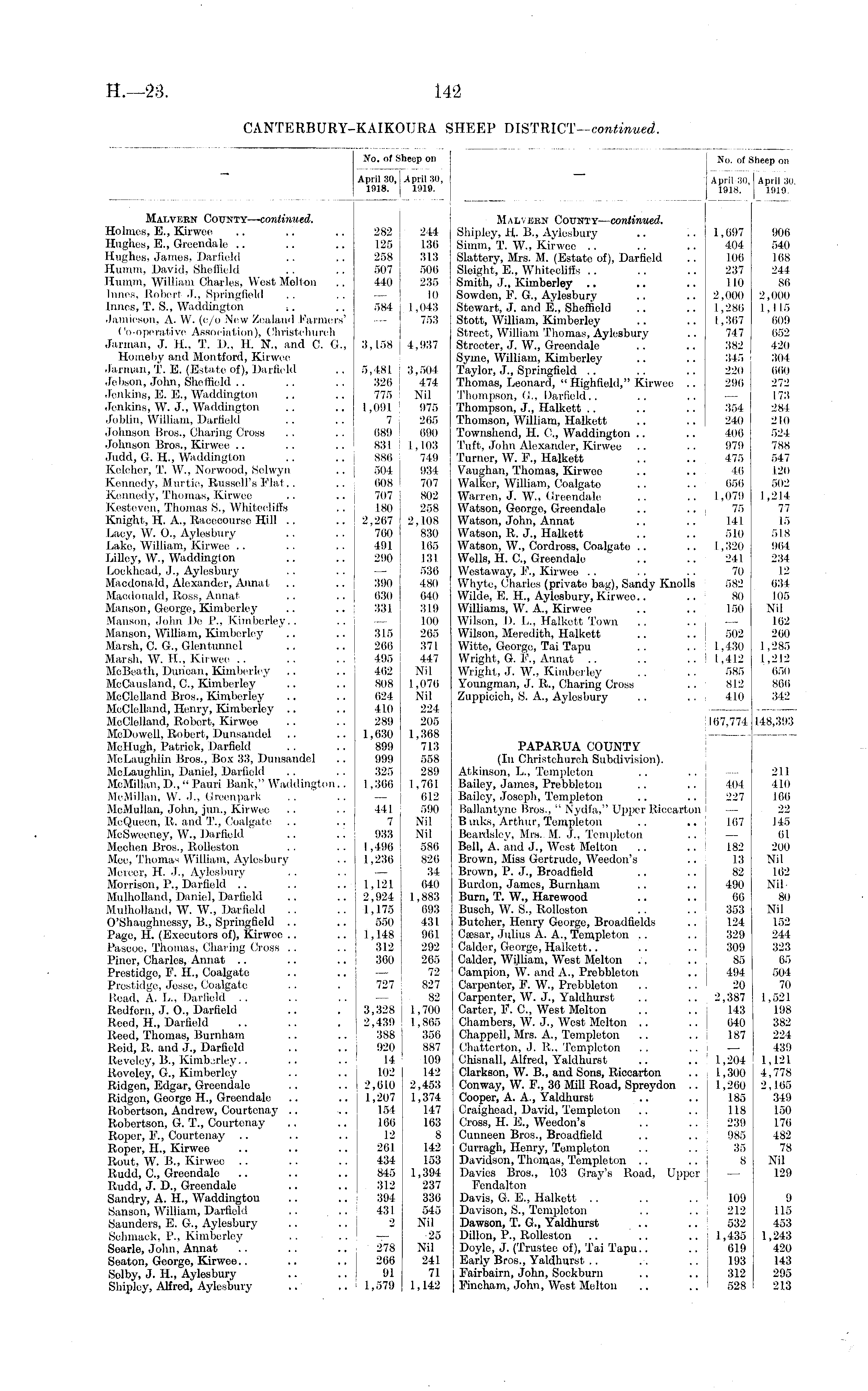 No. of S iheep on No. of Sheep on April 30,1 1918. j 1 April 30, 1919. ■ April SO, April 30, 1918. 1019. __l Malvern County— continued. Holmes, E., Kirwee Hughes, E., Greendale Hughes, James, Darfield Humm, David, Sheffield Humm, WiUiam Charles, West Molton Innes, Robert J., Springfield Innes, T. S., Waddington -.. Jamieson, A. W. (c/o New Zealand Farmers' Co-operative Association), Christchurch Jarman, J. H., T. I)., H. N., and C. G., Homeby and Montford, Kirwee Jarman, T. E. (Estate of), Darfield Jebson, John, Sheffield Je.nking, E. E., Waddington Jenkins, W. J., Waddington Joblin, William, Darfield Johnson Bros., Charing Cross Johnson Bros., Kirwee Judd, G. H-, Waddington Kelcher, T. W., Norwood, Selwyn Kennedy, Murtie, Russell's Flat.. Kennedy, Thomas, Kirwee Kesteven, Thomas S., Whiteeliffs Knight, H. A., Racecourse Hill Lacy, W. O., Aylesbury Lake, William, Kirwee Lilley, W., Waddington Lockhead, J., Aylesbury Macdonald, Alexander, Annat Macdonald, Ross, Annat Manson, George, Kimberley Manson, John De P., Kimberley.. Manson, William, Kimberley Marsh, C. G., Glentunnel Marsh. W. H., Kirwee McBeath, Duncan, Kimberley McCausiand, C, Kimberley McCleUand Bros., Kimberley McClelland, Henry, Kimberley McClelland, Robert, Kirwee McDowell, Robert, Dunsandel McHugh, Patrick, Darfield McLaughlin Bros., Box 33, Dunsandel McLaughlin, Daniel, Darfield McMillan, D.," Pauri Bank," Waddington.. McMillan, W. J., Greenpark McMullan, John, jun., Kirwee McQueen, It. and T., Coalgate McSweeney, W., Darfield Mechen Bros., Rolleston Mee, Thomas WiUiam, Aylesbury Mercer, H. J., Aylesbury Morrison, P., Darfield Mulholland, Daniel, Darfield Mulholland, W. W., Darfield O'Shaughnessy, B., Springfield Page, H. (Executors of), Kirwoc Paseoe. Thomas, Charing Cross Pinor, Charles, Annat Prestidgo, F. H., Coalgate Prestidgc, Jesse, Coalgate Read, A. L., Darfield Redfern, J. 0., Darfield Reed, H., Darfield Reed, Thomas, Burnham Reid, R. and J., Darfield iteveloy, B., Kimberley.. Roveley, G., Kimberley Ridgen, Edgar, Greendale Ridgon, George H., Greendale Robertson, Andrew, Courtenay Robertson, G. T., Courtenay Roper, P., Courtenay Roper, H., Kirwee Rout, W. B., Kirwee Rudd, G, Greendale Rudd, J. D., Greendale Sandry, A. H., Waddington Sanson, William, Darfield .. ....•■ Saunders, E. G., Aylesbury Schmack, P., Kimberley Searle, John, Annat Seaton, George, Kirwee Selby, J. H., Aylesbury Shipley, Alfred, Aylesbury 282 125 258 507 440 584 3,158 5,481 : 320 775 1,091 7 { 089 831 | 880 504 (108 707 180 2,207 700 491 290 244 136 313 506 235 10 1,043 753 4,937 3,504 474 Nil 975 265 690 j 1,103 749 934 707 802 258 2,108 830 165 131 536 480 040 319 100 265 371 447 Nil 1,076 Nil 224 205 1,368 713 558 289 1,761 612 590 Nil Nil 586 826 34 640 1,883 693 431 961 292 265 72 827 82 1,700 1,865 356 887 109 142 2,453 1,374 147 163 8 142 153 1,394 237 336 545 Nil 25 Nil 241 71 1,142 M a lv urn County— continued. Shipley, H. B„ Aylesbury .. .. 1,697 906 Simm, T. W., Kirwee .. .. .. 404 540 Slattery, Mrs. M. (Estate of), Darfield .. 106 168 Sleight, E., Whiteeliffs .. .. .. 237 244 Smith, J., Kimberley .. .. .. 110 86 Sowden, P. G., Aylesbury .. .. 2,000 2,000 Stewart, J. and E., Sheffiold .. .. 1,286 1,115 Stott, William, Kimberley .. .. 1,367 609 Street, William Thomas, Aylesbury .. 747 652 Streeter, J. W., Greendale .'. .. 382 420 Syme, William, Kimberley .. .. 345 304 Taylor, J., Springfield .. .. .. 220 660 Thomas, Leonard, " Highfield," Kirwee .. 296 272 Thompson, C. Darfield.. .. .. — 173 Thompson, J., Halkett .. .. .. 354 284 Thomson, William, Halkett .. .. 240 210 Townshend, H. 0., Waddington .. .. 406 524 Tuft, John Alexander, Kirwee .. .. 979 788 Turner, W. P., Halkett .. .. 475 547 Vaughan, Thomas, Kirwee .. .. 46 120 Walker, William, Coalgate .. .. 656 502 Warren, J. W., Greendale .. .. 1,079 1,214 Watson, George, Greendale .. . ■ j 75 77 Watson, John, Annat .. .. 141 15 Watson, R. J., Halkett .. .. 510 518 Watson, W., Cordross, Coalgate .. .. 1,320 964 Wells, H. C, Greendale .. .. 241 234 Westaway, P., Kirwee .. .. .. 70 12 Whyte, Charles (private bag), Sandy Knolls 582 634 Wilde, E. H., Aylesbury, Kirwee.. .. 80 105 Williams, W. A., Kirwee .. .. 150 Nil Wilson, I). L., Halkett Town .. .. —- 162 Wilson, Meredith, Halkett .. .. | 502 260 Witte, George, Tai Tapu .. ..! 1.430 1,285 Wright, G. P., Annat .. .. ,. I 1,412 1,212 Wright, J. W., Kimberley .. .. 585 650 Youngman, J. It., Charing Cross . . 812 866 Zuppieich, S. A., Aylesbury . . .. 410 342 390 630 331 315 266 495 462 808 624 410 289 1,630 899 999 325 1,366 167,774 148,393 441 7 933 1,496 1,236 1,121 2,924 1,175 550 1,148 312 360 727 3,328 2,439 388 920 14 102 2,610 1,207 154 166 12 261 434 845 312 394 431 PAPARUA COUNTY (In Christchurch Subdivision). Atkinson, L., Templeton .. .. 211 Bailey, James, Prebbleton .. .. 404 410 Bailey, Joseph, Templeton .. .. j 227 166 Ballantyne Bros., " Nydf'a," Upper Riccarton — 22 B inks, Arthur, Templeton .. .. 167 145 Beardsley, Mrs. M. J., Templeton .. 61 Bell, A. and J., West Melton .. .. 182 200 Brown, Miss Gertrude, Weedon's .. 13 Nil Brown, P. J., Broadfield .. .. 82 162 Burdon, James, Bumham .. .. 490 NilBurn, T. W., Harewood .. .. 06 80 Busch, W. S., Rolloston .. .. 353 Nil Butcher, Henry George, Broadfields .. 124 152 Caesar, Julius A. A., Templeton .. .. 329 244 Calder, George, Halkett.. .. .. 309 323 Calder, William, West Melton ., .. 85 65 Campion, W. and A., Prebbleton .. j 494 504 Carpenter, F. W., Prebbleton .. .. i 20 70 Carpenter, W. J., Yaldhurst .. .. 2,387 1,521 Carter, F. C, West Melton .. .. ; 143 198 Chambers, W. J., West Melton .. .. j 640 382 Chappell, Mrs. A., Templeton .. .. I 187 224 Chatterton, J. R., Templeton .. .. I 439 Chisnall, Alfred, Yaldhurst .. .. 1,204 1,121 Clarkson, W. B., and Sons, Riccarton .. 1,300 4,778 Conway, W. P., 30 MiU Road, Spreydon .. 1,260 2,165 Cooper, A. A., Yaldhurst .. .. 185 349 Craighead, David, Templeton .. .. 118 150 Cross, H. E., Weedon's .. .. 239 176 