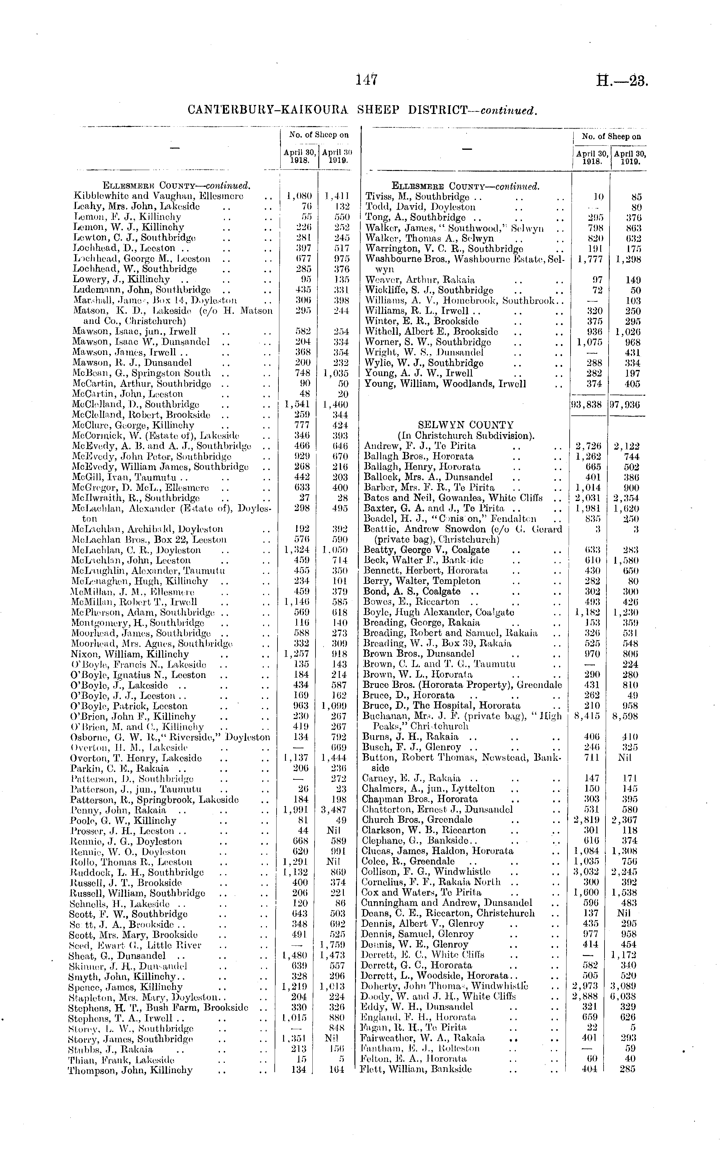 No. of! iheep on ' No. of Sheep on April 30, 1918. April 3(1 1919. i April 39, April i)0, j 1918. 1919. Ellesmekio County— continued. Kibblewhitc and Vaughan, Ellesmere Leahy, Mrs. John, LakesideLemon, F. J., Killinchy Lemon, W. J., Killinchy Lowton, C. J., Southbridge Loohhead, D., Leeston Loohhead, George M., Leeston Loohhead, W., Southbridge Lowery, J., Killinchy Ludemann, John, Southbridge Marshall, James Box 14, Doyleston Matson, K. D., Lakeside (c/o H. Matson and Co., Christchurch) Mawson, Isaac, jun., Irwell Mawson, Isaac W., Dunsandel Mawson, James, Irwell .. Mawson, It. J., Dunsandel McBean, G., Springston South .. McCartin, Arthur, Southbridge McCartin, John, Leeston McClelland, D„ Southbridge McClelland, Robert, Brookside McClure, George, Killinchy McCormick, W. (Estate of), Lakeside McEvedy, A. B. and A. J., Southbridge .. McEvedy, John Peter, Southbridge McEvedy, William James, Southbridge McGill, Ivan, Taumutu McGregor, D. McL., Ellesmere Mollwraith, It., Southbridge McLachlan, Aloxander (Estate of), Doyleston McLachlan, Archibald, Doyleston McLachlan Bros., Box 22, Leeston McLachlan, C. R,, Doyleston McLachlan, John, Leeston McLaughlin, Alexander, Taumutu MoLenaghen, Hugh, Killinchy McMillan, J. M., Ellesmi re McMillan, Robert T., Irwell McPherson, Adam, Southbridge Montgomery, H., Southbridge Moorhead, James, Southbridge Moorhead, Mrs. Agnes, Southbridgo Nixon, William, Killinchy O'Boyle, Francis N., Lakeside O'Boyle, Ignatius N., Leeston O'Boyle, J., Lakeside O'Boyle, J. J., Leeston O'Boyle, Patrick, Leeston O'Brion, John P., Killinchy ()' Brien, M. and (!., Killinchy Osborne, G. W. It.," Riverside," Doyleston Overton, II. M., Lakeside . . Overton, T. Henry, Lakeside Parkin, C. E., Itakaia ... Patterson, D., Southbridge Patterson, J., jun., Taumutu Patterson, It., Springbrook, Lakeside Penny, John, Rakaia Poole, G. W., Killinchy Prosser, J. IL, Leeston Rennio, J. G., Doyleston Itcnnie, W. O., Doyleston itollo, Thomas R., Leeston Ruddock, L. H., Southbridge Russell, J. T., Brookside Russell, William, Southbridge ... Schnells, IT., Lakeside Scott, P. W., Southbridge So tt, J. A., Brookside Scott, Mrs. Mary, Brookside Seed, Ewart G., Little River Sheat, G, Dunsandel .. Skinner, J. IL, Dunsandel Smyth, John, Killinchy.. S pence, James, Killinchy Stapleton, Mrs. Mary, Doyleston.. Stephens, H. T., Bush Farm, Brookside .. Stephens, T. A„ Irwell Sl.oi-ey, L. W., Southbridge Storey, James, Southbridge Stubbs, J., Rakaia Thian, Prank, Lakeside Thompson, John, Killinchy 1,080 76 55 226 281 397 677 285 95 435 306 295 582 204 368 200 748 90 48 1,541 25!) 777 346 466 929 268 442 633 27 298 192 576 1,324 459 455 234 459 1,146 569 I 16 588 332 1,257 135 184 434 16!) 963 230 419 134 1,411 132 550 252 245 517 975 376 135 331 398 244 254 334 554 232 1,035 50 20 1,460 344 424 393 646 670 216 203 400 28 496 392 590 1.050 714 350 KM 379 585 618 140 373 309 918 143 214 587 163 1,0!)!) 267 267 792 669 1,444 236 272 23 198 3,487 49 Nil 589 991 Nil 869 374 221 86 503 692 525 1,759 1,473 557 296 1,013 234 326 880 818 Nil 156 5 Kit Ellesmebe County— continued. Tiviss, M., Southbridge Todd, David, Doyleston Tong, A., Southbridgo Walker, James, " Southwood,' Selwvn Walker, Thomas A., Selwyn Warrington, V. 0. R., Southbridgo Washbourne Bros., Washbourne Estate, Selwyn Weaver, Arthur, Rakaia Wicklifie, S. J., Southbridge Williams, A. V., Homebrook, Southbrook.. Williams, R. L., Irwell Wintor, E. R., Brookside Withell, Albert E„ Brookside Worner, S. W., Southbridgo Wright, W. S., Dunsandel Wylio, W. J., Southbridgo Young, A. J. W., Irwell Young, William, Woodlands, Irwell SELWYN COUNTY (In Christchurch Subdivision). Andrew, P. J., Te Pirita Ballagh Bros., Hororata Ballagh, Honry, Hororata Ballock, Mrs. A, Dunsandel Barber, Mrs. P. R., Te Pirita Bates and Neil, Gowanlea, White Cliffs .. Baxter, G. A. and J., To Pirita Beadcl, H. J., "C mis on," Pendalton Beat lie, Andrew Snowdon (e/o G. Gerard (private bag), Christchurch) Beatty, Georgo V., Coalgate Beck, Walter F., Bank-ide Bennett, Herbert, Hororata Berry, Walter, Templeton Bond, A. S., Coalgate Bowcs, E., Riccarton Boyle, Hugh Alexander, Coalgate Breading, George, Itakaia Breading, Robert and Samuel, Itakaia Breading, W. J., Box 39, Rakaia Brown Bros., Dunsandel Brown, C. L. and T. G, Taumutu Brown, W. L., Hororata Bruce Bros. (Hororata Property), Greendale Bruce, D., Hororata Bruce, D., The Hospital, Hororata Buchanan, Mrs. J. P. (private bag), "High Peaks," Chri-tohuroh Burns, J. H., Rakaia Busch, F. J., Glenroy Button, Robert Thomas, Newstoad, Bankside 10 295 798 820 l!)l 1,777 97 72 330 375 936 1,075 388 282 374 93,838 2,726 1,262 665 401 1,014 2,031 1,981 835 633 610 130 282 302 493 1,182 153 326 535 970 85 SO 376 863 632 175 1,298 149 50 103 250 295 1,020 968 431 331 197 405 97,936 2,122 744 502 386 900 2,354 1,620 250 3 2S2 1,580 (.50 80 300 426 1,230 359 53 I 548 806 224 280 810 49 958 8,598 290 431. 262 210 8,415 1,137 206 ■ 100 216 711 410 325 Nil 26 184 1,9!) I 81 44 668 620 1,29.1 I., 132 400 206 120 043 348 491 Carney, E. J., Rakaia Chalmers, A., jun., Lyttelton Chapman Bros., Hororata Chattorton, Ernest J., Dunsandel Church Bros., Greendale Clarkson, W. B., Riccarton Clephane, G, Bankside.. .. Clucas, James, Haldon, Hororata Colcc, R., Greendale Collison, F. G., Windwhistle Cornelius, I 1 . P., Rakaia North Cox and Waters, Te Pirita Cunningham and Andrew, Dunsandel Deans, C, E., Riccarton, Christchurch Dennis, Albert V., Glenroy Dennis, Samuel, Glenroy Dennis, W. E., Glenroy Derrett, E. G, White Cliffs Derrett, G. C, Hororata Derrett, L., Woodside, Hororata.. Doherty, John Thomas Windwhistle Doody, W. and J. IL, White Cliffs Eddy, W. H., Dunsandel England, F. !L, Hororata Pagan, R. IL, Te Pirita Fairwcatlier, W. A., Itakaia .. Fantham, E. J., Rolleston .. .. Felton, E. A., Hororata Flett, William, Bankside .147 150 303 53.1. 2,819 301 616 I ,084 1,035 3,032 300 1,600 596 137 435 977 414 171 II5 395 580 2,367 118 374 1.308 756