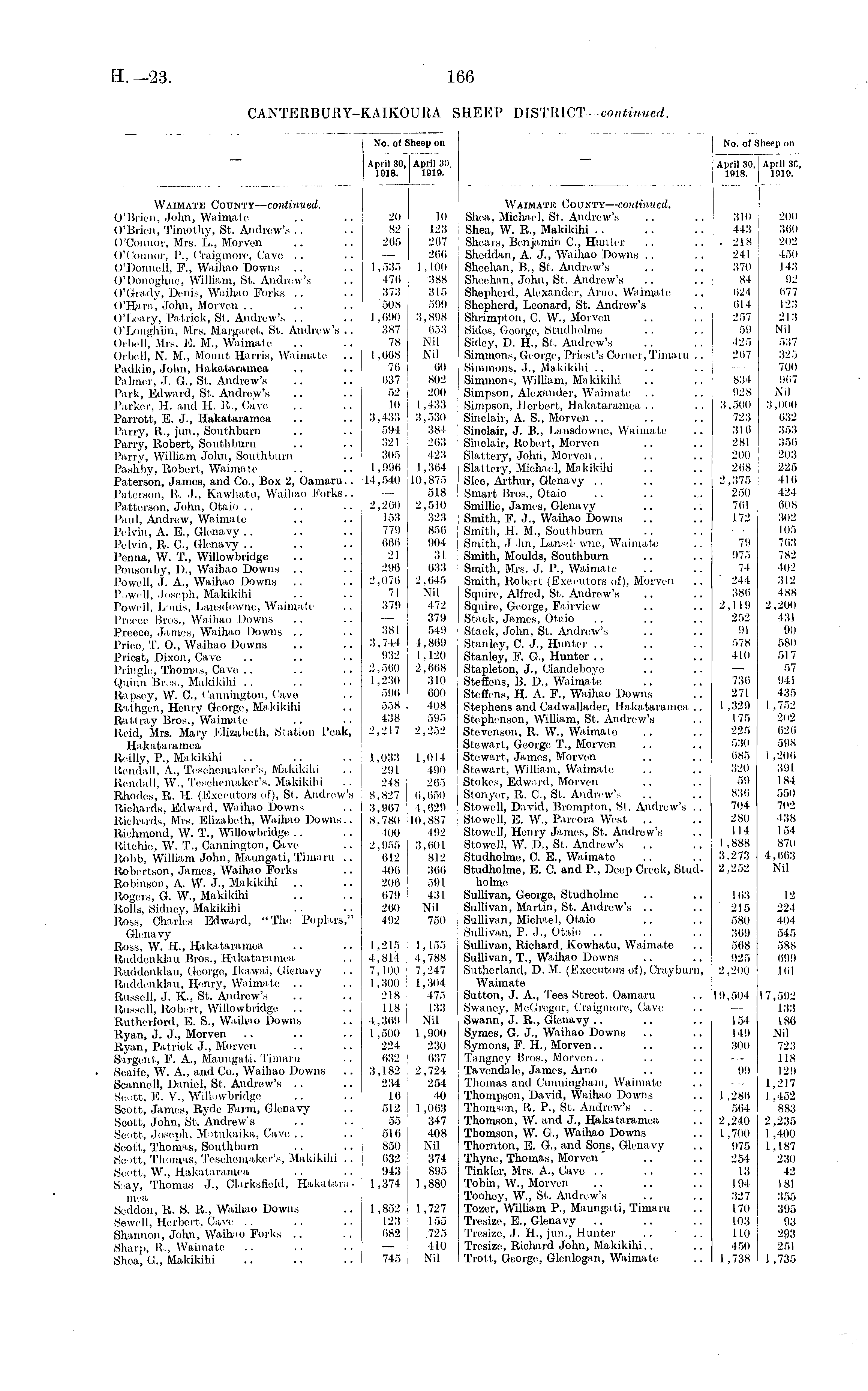 No. of S April 30, 1918. Sheep on , I April 30 1919. No, of Sheep on April 30, April 3C, 1918. 1919. Waimate County— continued. O'Brien, John, Waimate .. .. 20 O'Brien, Timothy, St. Andrew's .. .. 82 O'Connor, Mrs. L., Morven .. .. 265 O'Connor, P., Craigmore, Cave .. .. —■ O'Donneli, P., Waihao Downs .. .. 1.535 O'Donoghiie, William, St. Andrew's .. 476 i O'Grady, Denis, Waihao Forks .. .. 37.'! O'Hara, John, Morven .. .. .. 508 O'Leary, Patrick, St. Andrew's .. .. 1,690 O'Loughlin, Mrs. Margaret. St. Andrew's .. 387 Orbell, Mrs. E. M., Waimate .. .. 78 Orbell, N. M., Mount Harris, Waimale .. 1,668 Padkin, John, Hakataramea .. .. 76 Palmer, J. G., St. Andrew's .. .. 637 Park, Edward, St. Andrew's .. .. 52 Parker, H. and H. R., Care .. . . ID Parrott, E. J., Hakataramea .. .. 3,433 Parry, It., jun., Southburn .. .. 594 Parry, Robert, Southburn .. .. 321 Parry, William John, Southburn .. 305 Pashby, Robert, Waimate .. .. 1,996 Paterson, James, and Co., Box 2, Oamaru. . 14,540 Paterson, R. J., Kawhatu, Waihao Forks.. — Patterson, John, Otaio .. .. .. 2,260 Paul, Andrew, Waimate .. .. 153 Pelvin, A. E., Glcnavv .. .. .. (V!) Pelvin, R. G, Glenavy .. .. .. 666 Penna, W. T., WiUowbridge .. .. 21 Ponsonby, D., Waihao Downs .. .. 296 Powell, J. A., Waihao Downs .. .. 2,076 Powell, Joseph. Makikihi .. .. Powell. L-iuis, Lansdowne, Waimale .. 379 Preeee Bros., Waihao Downs Preece, James, Wrihao Downs .. .. 381 Price, T. 0., Waihao Downs .. .. 3,744 Priost, Dixon, Cave .. .. .. 932 Pringle, Thomas, Cave .. .. .. 2,560 Quinn Bros., Makikihi .. .. .. 1,230 Rapsey, W. 0., Cannington, Cave .. - r > ! -6 Ralhgen, Henry George, Makikihi .. 558 I Rattray Bros., Waimate .. .. 438 Reid, Mrs. Mary Elizabeth, Station Peak, 2,217 Hakataramea Reilly, P., Makikihi .. .. .. 1,033 Itcmlall, ft-., Teschemaker's, Makikihi .. 291 Rendall, W., Teschemaker's. Makikihi . . 248 Rhodes, R. H. (Executors of), Si. Andrew's 8,827 Richards, Edward, Waihao Downs .. 3,907 Richards, Mrs. Elizabeth, Waihao Downs.. 8,780 Richmond, W. T., WiUowbridge .. .. 400 Ritchie, VV. T., Cannington, Cave .. 2,955 Robb, William John, Maungati, Timaru .. 612 Robertson, James, Waihao Forks .. 406 Robinson, A. W. J., Makikihi .. .. 206 Rogers, G. W., Makikihi .. .. 679 I Rolls, Sidney, Makikihi . . . . 260 Ross, Charles Edward, "The Poplars," 492 Glenavy Ross, W. H., Hakataramea .. .. 1.215 Ruddeiiklau Bros., Hakataramea .. 4,814 Ruddeiiklau, Goorgo, Ikawai, Glenavy . . 7,100 | Ruddeiiklau, Henry, Waimate .. .. 1,300 Russell, J. K, St. Andrew's .. .. 218 Russell, Robert, WiUowbridge .. .. 118 Rutherford, E. S., Wailvio Downs .. 4,369 Ryan, J. J., Morven .. .. .. 1,500 Ryan, Patrick J., Morvcn .. .. 224 Sargent, F. A., Maungati, Timaru . . 632 Seaife, W. A., and Co., Waihao Downs .. 3,182 Scanncll, Daniel, St. Andrew's .. .. 234 : Scott, E. V., Willowbridge .. .. 16 Scott, James, Ryde Farm, Glcnavy .. 512 I Scott, John, St. Andrew's . . . . 55 Scott, Joseph, Motukaika, Cave .. .. 516 Scott, Thomas, Southburn .. .. 850 Scott, Thomas, Teschemaker's, Makikihi . . 632 Scott, W., Hakataramea . . .. 943 ' Saay, Thomas J., ClarksUeld, Hakatara- 1,374 mea Seddon, It. S. It., Waihao Downs .. 1,852 i Sewell, Herbert, Cave .. .. .. 123 Shannon, John, Waihao Forks .. .. 682 Sharp, It., Waimate . . .. .. — | Shea, G., Makikihi .. .. .. 745 i 10 123 207 266 1,100 388 315 599 3,898 053 Nil Nil 60 802 200 1,433 3,530 384 263 423 1,364 10,875 518 2,510 323 856 904 31 633 2,645 Nil 472 379 549 4,869 1,120 2,668 310 600 J 408 595 2,252 Waimatj5 Cou nty— continued. Shea, Michael, St. Andrew's Shea, W. R., Makikihi Shears, Benjamin G, Hunter Sheddan, A. J., Waihao Downs Shechan, B., St. Andrew's Sheehnn, John, St. Andrew's Shepherd, Alexander, Arno, Waimate Shepherd, Leonard, St. Andrew's Shrimpton, G W., Morvcn Sides, George. Studholme Sidey, D. H, Si. Andrew's Simmons, George, Priest's Corner, Tima ru . . Simmons, J., Makikihi Simmons, William, Makikihi Simpson, Alexander, Waimate Simpson, Herbert, Hakataramea Sinclair, A. S., Morven Sinclair, J. B., Lansdowne. Waimate Sinclair, Robert, Morven Slattery, John, Morven.. Slattery, Michael, Makikihi Sice, Arthur, Glcnavy Smart Bros., Otaio Smillie, James, Glcnavy Smith, P. J., Waihao Downs Smith, II. M., Southburn Smith, J ;hn, Lansd' wnc, Waimato Smith, Moulds, Southburn Smith, Mrs. J. P., Waimate Smith, Robert (Exeoutors of), Morvcn Squire, Alfred, St. Andrew's Squire, George, Fairview Stack, James, Otaio Stack, John, St. Andrew's Stanley, C. J., Hunter Stanley, F. G., Hunter Stapleton, J., Clandeboye Steficns, B. D., Waimate Steflens, H. A. F., Waihao Downs Stephens and Cadwallader, Hakataramea .. Stephenson, William, St. Andrew's Stevenson, It. W., Waimate Stewart, George T., Morvcn Stewart, James, Morven Stewart, William, Waimate Stokes, Edward, Morven Stonycr, R. G, St. Andrew's Stowell, David, Brompton, St. Andrew's .. Stowell, E. W., Pareora West Stowell, Henry James, St. Andrew's Stowell, W. I)., St. Andrew's Studholme, C. E., Waimate Studholme, E. C. and P., Deep Creek, Studholme Sullivan, George, Studholme Sullivan, Martin, St. Andrew's .. Sullivan, Michael, Otaio Sullivan, .P. J., Otaio Sullivan, Richard, Kowhatu, Waimato Sullivan, T., Waihao Downs Sutherland, D. M. (Executors of), Grayburn, Waimate Sutton, J. A., 'lees Street, Oamaru Swancy, McGregor, Craigmore, Cave Swann, J. R., Glenavy Symes, G. J., Waihao Downs Symons, F. H., Morven.. Tangney Bros., Morvcn.. Tavcndale, James, Arno Thomas and Cunningham, Waimate Thompson, David, Waihao Downs Thomson, It. P., St. Andrew's Thomson, W. and J., Hakataramea Thomson, W. G., Waihao Downs Thornton, E. G., and Sons, Glenavy Thync, Thomas, Morvcn' Tinkler, Mrs. A., Cave Tobin, W., Morven Toohey, W., St. Andrew's Tozcr, William P., Maungati, Timaru Trcsize, E., Glenavy Tresizc, J. H., jun., Hunter Trcsize, Richard John, Makikihi.. Trott, George, Glenlogan, Waimate 310 200 443 360 - 218 202 241 150 370 143 84 92 621 677 614 123 257 213 59 Nil 425 537 26
