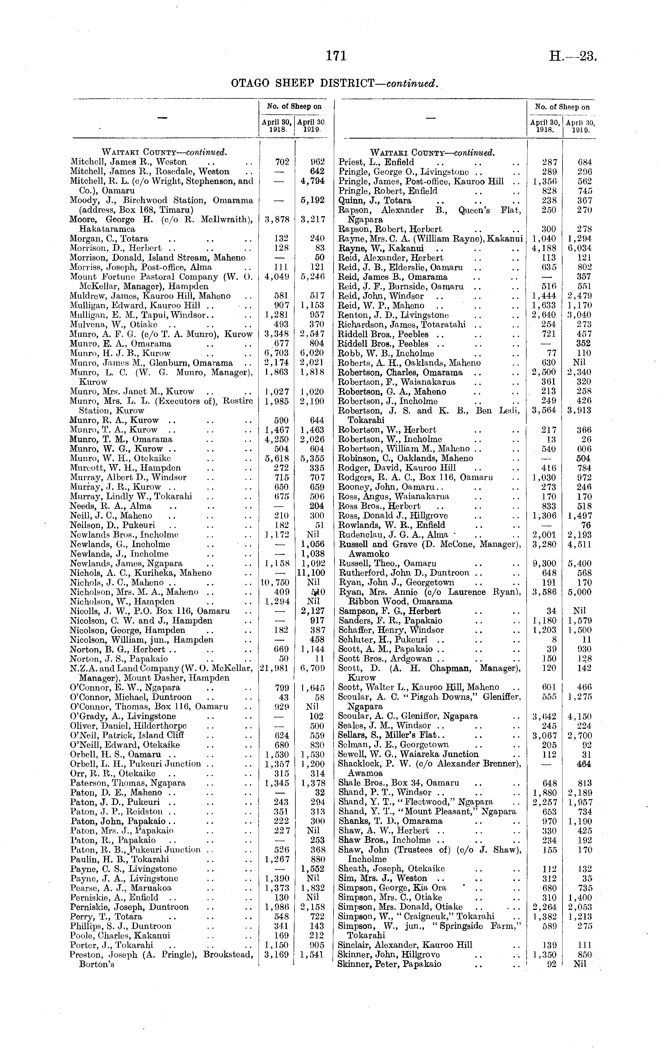 No. of Sheep on April 39, April 30. 1918. 1919. No. ot Sheep on April 30,1 April 30, 1918. 1919. Waitaki County— continued. Mitchell, James R., Weston Mitchell, James It., Itosedale, Weston Mitchell, R. L. (c/o Wright, Stophenson, and Co.), Oamaru Moody, J., Birchwood Station, Omarama (address, Box 168, Timaru) Moore, George H. (c/o It. Mcllwraith), Hakataramea Morgan, G, Totara Morrison, D., Herbert Morrison, Donald, Island Stream, Maheno Morriss, Joseph, Post-office, Alma Mount Fortune Pastoral Company (W. 0. MoKellar, Manager), Hampden Muldrow, Jamos, Kauroo Hill, Mahono Mulligan, Edward, Kauroo Hill .. Mulligan, E. M., Tapui, Windsor.. Mulvcna, W., Otiake Munro, A. F. G. (c/o T. A. Munro), Kurow Munro, E. A., Omarama Munro, IL J. B., Kurow Munro, James M., Glenburn, Omarama Munro, L. 0. (W. G. Munro, Managor), Kurow Munro, Mrs. Janet M., Kurow Munro, Mrs. L. L. (Exeoutors of), Rostire Station, Kurow Munro, R. A., Kurow Munro, T. A., Kurow Munro, T. M., Omarama Munro, W. G., Kurow Munro, W. IL, Otekaike Murcott, W. H., Hampden Murray, Albert D., Windsor Murray, J. R., Kurow Murray, Lindly W., Tokarahi Needs, It, A., Alma Neil), J. C, Maheno .. Neilson, D., Pukeuri Newlands Bros., Ineholme Newlands, G., Ineholme .. Newlands, J., Ineholme Newlands, James, Ngapara Nichols, A. G, Kuriheka, Maheno Nichols, J. G, Maheno Nicholson, Mrs. M. A., Maheno Nicholson, W., Hampden Nicolls, J. W., P.O. Box 116, Oamaru .. Nicolson, C. W. and J., Hampden Nicolson, George, Hampden Nicolson, William, jun., Hampden Norton, B. G., Herbert Norton, J. S., Papakaio N.Z.A. and Land Company (W. 0. McKellar, Manager), Mount Dasher, Hampden O'Connor, E. W., Ngapara O'Connor, Michael, Duntroon O'Connor, Thomas, Box 116, Oamaru O'Grady, A., Livingstone Oliver, Daniel, Hilderthorpe O'Noil, Patrick, Island Cliff O'Neill, Edward, Otekaike Orbell, H. S., Oamaru Orbell, L. IL, Pukeuri Junction Orr, R. R., Otekaike Paterson, Thomas, Ngapara Paton, D. E., Maheno Paton, J. D., Pukeuri Paton, J. P., ltoidston Paton, John, Papakaio Paton, Mrs. J., Papakaio Paton, It., Papakaio Paton, R. B.,I?ukeuri Junction PauUn, H. B., Tokarahi Payne, G S., Livingstone Payne, J. A., Livingstone Pearse, A. J., Maruakoa Perniskie, A., Enfield Perniskie, Joseph, Duntroon Porry, T., Totara Phillips, S. J., Duntroon Poole, Charles, Kakanui Porter, J., Tokarahi Preston, Joseph (A. Pringle), Brookstead, Borton's 702 3,878 .132 128 111 4,049 581 907 1,28.1 493 3,348 077 6,703 2,174 1,863 1,027 1,985 590 1,407 4,250 504 5,618 272 715 650 675 210 182 1,1.72 .1,158 902 642 4,794 5,192 3,217 240 83 50 121 5,246 517 1,1.53 957 370 2,547 804 6,020 2,021 1,818 1,020 2,190 644 1,463 2,020 004 5,355 335 707 059 500 204 300 51 Nil 1,056 1,038 1,092 11,100 Nil f*1.0 Nil 2,127 917 387 458 1,144 II 6,709 Waitaki County— continued. Priest, L., Enfield Pringle, George 0., Livingstone Pringle, James, Post-office, Kauroo Hill .. Pringle, Robert, Enfield Quinn, J., Totara Rapson, Alexander B., Queen's Flat, Ngapara Rapson, Robert, Herbert Rayne, Mrs. G A. (William Rayne), Kakanui Rayne, W., Kakanui Reid, Alexander, Herbert Reid, J. B., Elderslio, Oamaru Reid, James B., Omarama Reid, J. F., Burnside, Oamaru Reid, John, Windsor Reid, W. P., Maheno Ronton, J. D., Livingstone Richardson, James, Totaratahi Riddell Bros., Peebles Riddell Bros., Peebles Robb, W. B., Ineholme Roberts, A. H., Oaklands, Maheno Robertson, Charles, Omarama Robertson, F., Waianakarua Robertson, G. A., Maheno Robertson, J., Ineholme Robertson, J. S. and K. B., Ben Ledi, Tokarahi Robertson, W., Horbcrt Robertson, W-> Ineholme Robertson, William M., Maheno Robinson, G, Oaklands, Maheno Rodgor, David, Kauroo Hill Rodgcrs, R. A. C, Box 116, Oamaru Rooney, John, Oamaru Ross, Angus, Waianakarua Ross Bros., Herbert Ross, Donald J., Hillgrove Rowlands, W. R., Enfield Rudenclau, J. G. A., Alma ■ RusseU and Grave (D. McCone, Manager), Awamoko RusseU, Thoo., Oamaru Rutherford, John D., Duntroon Ryan, John J., Georgetown Ryan, Mrs. Annie (c/o Laurence Ryan), Ribbon Wood, Omarama Sampson, F. G., Herbert Sanders, F. It., Papakaio Schaffer, Henry, Windsor Schlutor, H., Pukouri Scott, A. M., Papakaio Scott Bros., Ardgowan Scott, D. (A. H. Chapman, Manager), Kurow Scott, Walter L., Kauroo HiH, Maheno Scoular, A. C. " Pisgah Downs," Gleniffer, Ngapara Scoular, A. G, Gieniflor, Ngapara Sealcs, J. M., Windsor SeUars, S., Miller's Flat.. Selman, J. E., Georgetown Sewell, W. G., Waiareka Junction Shaddock, P. W. (c/o Alexander Brenner), Awamoa Shale Bros., Box 34, Oamaru Shand, P. T., Windsor .. Shand, Y. T., " Fleetwood," Ngapara Shand, Y. T,, " Mount Pleasant," Ngapara Shanks, T. D., Omarama Shaw, A. W., Herbert Shaw Bros., Ineholme Shaw, John (Trustees of) (c/o J. Shaw), Ineholme Sheath, Joseph, Otekaike Sim, Mrs. J., Weston Simpson, George, Kia Ora Simpson, Mrs. G, Otiake Simpson, Mrs. Donald, Otiake .. ... Simpson, W., " Craigneuk," Tokarahi Simpson, W., jun., " Springsido Farm," Tokarahi Sinclair, Alexander, Kauroo Hill Skinnor, John, Hillgrovo Skinner, Peter, Papakaio 287 289 1,350 828 238 250 300 1,040 4,188 113 035 516 1,444 1,633 2,640 254 721 77 630 2,500 361 213 249 3,564 217 13 . 540 416 1,030 273 170 833 1,306 2,001 3,280 9,300 648 191 3,586 684 296 562 745 367 270 278 1,294 6,034 121 802 357 551 2,479 1,170 3,040 273 457 352 110 Nil 2,340 320 258 426 3,913 366 26 606 504 784 972 246 170 518 1,497 76 2,193 4,511 5,400 568 170 5,000 10,750 409 1,294 182 669 50 21,981 34 1,180 1,203 8 39 150 120 Nil 1,579 1 ,500 11 930 12,8 142 799 43 929 1,045 58 Nil 102 500 559 830 1,530 1,200 314 1,378 32 294 313 300 Nil 253 368 880 1,552 Nil 1,832 Nil 2,158 722 143 212 905 1,541 601 555 466 1,275 624 680 1,530 1,357 315 1,345 3,642 245 3,067 205 112 4,150 224 2,700 92 31 464 243 351 222 22 7 648 1,880 2,257 653 970 330 234 155 813 2,189 1,957 734 1,190 425 192 170 526 1,267 1,390 1,373 130 1,980 548 341 169 1,150 3,109 112 312 080 310 2,264 1,382 589 1.32 35 735 1,400 2,053 1,213 275 139 1,350 92 III 850 Nil