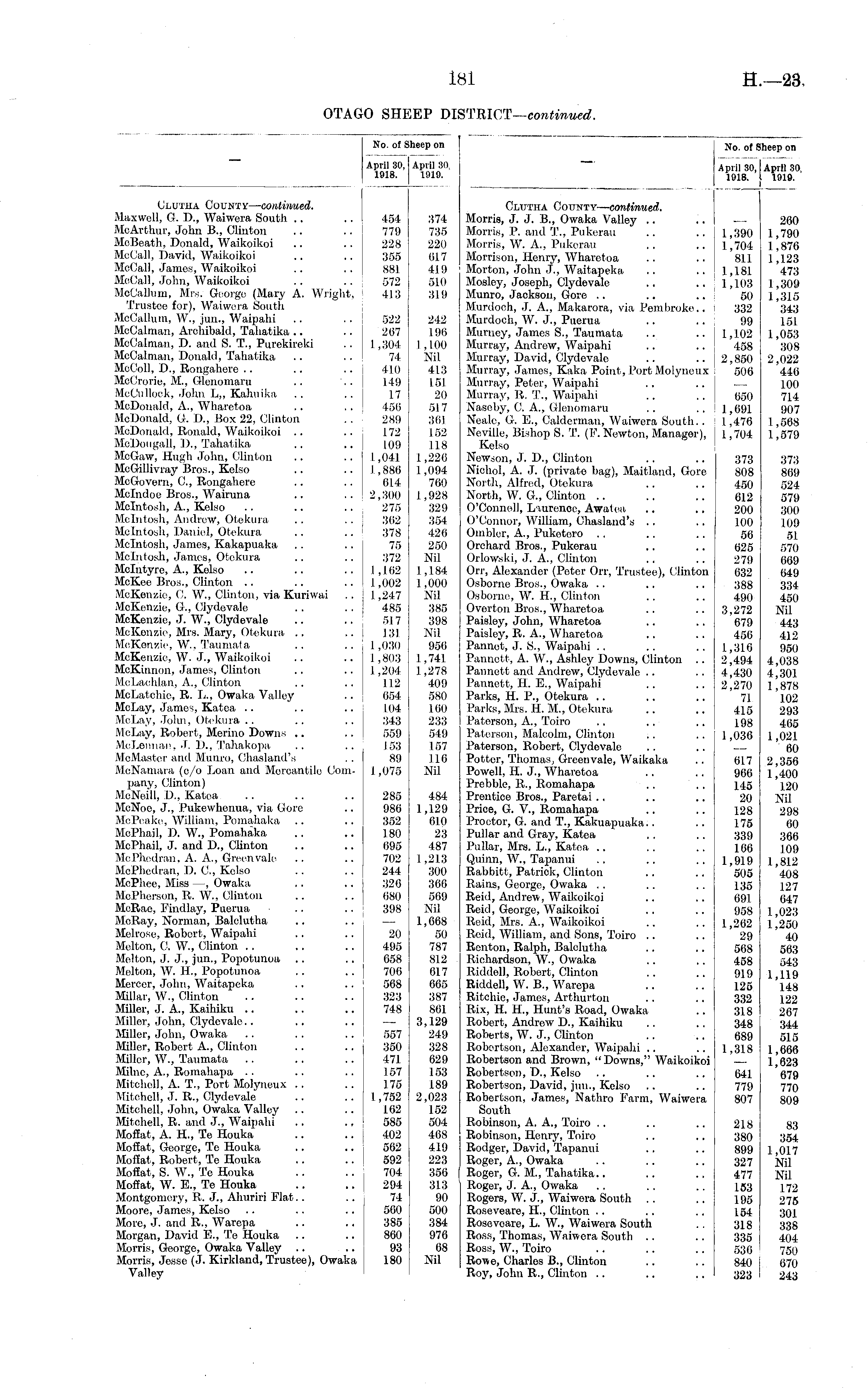 No. of Sheep on April 30, April 30 1918. 1919. No. of f April 30, 1918. Iheep on I April 30, t 1919. i Clutha County— continued. Maxwell, G. D., Waiwera South McArthur, John B., Clinton McBeath, Donald, Waikoikoi McCall, David, Waikoikoi McCall, James, Waikoikoi McCall, John, Waikoikoi McCallum, Mrs. George (Mary A. Wright, Trustee for), Waiwera South McCallum, W., jun., Waipahi McCalman, Archibald, Tahatika McCalman, D. and S. T., Purekireki McCalman, Donald, Tahatika McColl, D., Rongahere McCrorie, M., Glenomaru McCuUook, John L„ Kahuika McDonald, A., Wharetoa McDonald, G. D., Box 22, Clinton McDonald, Ronald, Waikoikoi McDougall, D„ Tahatika McGaw, Hugh John, Clinton McGillivray Bros., Kelso McGovern, G, Rongahere Mclndoe Bros., Wairuna Mcintosh, A., Kelso Mcintosh, Andrew, Otekura Mcintosh, Daniel, Otekura Mcintosh, James, Kakapuaka Mcintosh, James, Otekura Mclntyre, A., Kelso McKee Bros., Clinton McKenzie, C. W., Clinton, via Kuriwai McKenzie, G., Clydevale McKenzie, J. W., Clydevale McKenzie, Mrs. Mary, Otekura McKenzie, W., Taumata McKenzie, W. J., Waikoikoi McKinnon, James, Clinton McLachlan, A., Clinton McLatchio, R. L., Owaka Valley McLay, James, Katea McLay, John, Otekura .. McLay, Robert, Merino Downs McLennan, J. D., Tahakopa McMaster and Munro, Chasland's McNamara (c/o Loan and Mercantile Company, Clinton) McNeill, D., Katea McNoc, J., Pukewhonua, via Gore McPcake, William, Pomahaka McPhail, D. W., Pomahaka McPhail, J. and D., CUnton McPhedran, A. A., Greenvale McPhedran, D. G, Kelso McPhee, Miss —, Owaka MoPherson, R. W., Clinton McRae, Findlay, Puerua Meltay, Norman, Balclutha Melrose, Robert, Waipahi Melton, G W., Clinton Melton, J. J., jun., Popotunoa Melton, W. IT., Popotunoa Mercer, John, Waitapeka Millar, W-, Clinton Miller, J. A., Kaihiku Miller, John, Clydevale.. Miller, John, Owaka Miller, Robort A., Clinton Miller, W., Taumata Milne, A., Romahapa Mitchell, A. T., Port Molyneux Mitchell, J. R., Clydevale Mitchell, John, Owaka Valley Mitchell, R. and J., Waipahi Moffat, A. H., Te Houka Moffat, George, Te Houka Moffat, Robert, Te Houka Moffat, S. W., Te Houka Moffat, W. E., Te Houka Montgomery, R. J., Ahuriri Flat.. Moore, James, Kelso More, J. and R., Warepa Morgan, David E., To Houka Morris, George, Owaka Valley Morris, Jesse (J. Kirkland, Trustee), Owaka Valley 454 374 779 735 228 220 355 017 881 419 572 510 413 319 522 242 207 190 1,304 1,100 74 Nil 410 413 149 151 17 20 450 517 289 301 172 152 109 118 1,041 1,226 1,886 1,094 614 760 2,300 1,928 275 329 302 354 378 420 75 250 372 Nil 1,162 1,184 J,002 1,000 1,247 Nil 485 385 517 398 131 Nil 1,030 950 1,803 1,741 1,204 1,278 112 409 054 580 1.04 100 343 233 559 549 153 157 89 no 1,075 Nil Clutha County— continued. Morris, J. J. B., Owaka Valley Morris, P. and T., Pukerau Morris, W. A., Pukerau Morrison, Henry, Wharetoa Morton, John J., Waitapeka Mosley, Joseph, Clydevale Munro, Jackson, Goro Murdoch, J. A., Makarora, via Pembroke.. Murdoch, W. J., Puerua Muruey, James S., Taumata Murray, Andrew, Waipahi Murray, David, Clydevale Murray, James, Kaka Point, Port Molyneux Murray, Peter, Waipahi Murray, It. T., Waipahi Naseby, C. A., Glenomaru Neale, G. E., Calderman, Waiwera South.. Neviile, Bishop S. T. (F. Newton, Manager), Kelso Newson, J. D., Clinton Nichol, A. J. (private bag), Maitland, Gore North, Alfred, Otekura North, W. G, Clinton O'Connell, Laurence, Awatea O'Connor, William, Chasland's Ombler, A., Puketero Orchard Bros., Pukerau Orlowski, J. A., Clinton Orr, Alexander (Peter Orr, Trustee), Clinton Osborne Bros., Owaka Osborne, W. H, Clinton Overtoil Bros., Wharetoa Paisley, John, Wharetoa Paisley, R. A., Wharetoa Pannot, J. S., Waipahi Pannett, A. W., Ashloy Downs, Clinton .. Pannett and Andrew, Clydevale Pannett, H. E., Waipahi Parks, H. P., Otekura Parks, Mrs. H. M., Otekura Paterson, A., Toiro Paterson, Malcolm, CUnton Paterson, Robert, Clydevale Potter, Thomas, Greenvale, Waikaka Powell, H. J., Wharetoa Prebble, R., Romahapa .. Prentice Bros., Paretai Price, G. V., Romahapa Proctor, G. and T., Kakuapuaka.. Pullar and Gray, Katea Pullar, Mrs. L., Katea .. Quinn, W., Tapanui Rabbitt, Patrick, Clinton Rains, George, Owaka Reid, Andrew, Waikoikoi Reid, George, Waikoikoi Reid,, Mrs. A., Waikoikoi Reid, William, and Sons, Toiro Renton, Ralph, Balclutha Richardson, W., Owaka Riddoll, Robert, Clinton Riddoll, W. B., Warepa Ritchie, James, Arthurton Rix, H. H., Hunt's Road, Owaka Robert, Andrew D., Kaihiku Roberts, W. J., Clinton Robertson, Alexander, Waipahi Robertson and Brown, "Downs," Waikoikoi Robertson, D., Kelso Robertson, David, jun., Kelso Robertson, James, Nathro Farm, Waiwera South Robinson, A. A., Toiro Robinson, Homy, Toiro Rodger, David, Tapanui Roger, A., Owaka Roger, G. M., Tahatika.. Roger, J. A., Owaka Rogers, W. J., Waiwera South Roseveare, H., Clinton Rosevoare, L. W., Waiwera South Ross, Thomas, Waiwera South Ross, W., Toiro Roue, Charles B., Clinton Roy, John R., Clinton 1,390 1,704 811 1,181 1,103 50 332 99 1,102 458 2,850 506 650 1,091 1,470 1,704 373 808 450 612 200 100 56 625 279 632 388 490 3,272 679 456 1,316 2,494 4,430 2,270 71 415 198 1,036 260 1,790 1,870 1,123 473 1,309 1,315 343 151 1,053 308 2,022 440 100 714 907 1,568 1,579 373 869 524 579 300 109 51 570 669 049 334 450 Nil 443 412 950 4,038 4,301 1,878 102 293 405 1,021 60 2,356 1,400 120 Nil 298 00 300 109 1,812 408 127 047 1,023 1,250 40 503 543 1,119 148 122 207 344 515 1,606 1,623 679 770 809 285 484 980 1,129 352 010 180 23 095 487 702 1,213 244 300 320 30(> 080 509 898 Nil — 1,008 20 50 495 787 058 812 700 017 508 665 323 387 748 861 — 3,129 557 249 350 328 471 629 157 153 175 189 1,752 2,023 1.02 152 585 504 402 408 562 419 592 223 704 350 294 313 74 90 500 500 385 384 860 976 93 68 180 Nil 617 900 145 20 128 175 339 166 1,919 505 135 691 958 1,262 29 568 458 919 125 332 318 348 689 1,318 641 779 807 218 380 899 327 477 153 195 154 318 335 536 840 323 83 354 1,017 Nil Nil 172 275 301 338 404 750 070 I 2