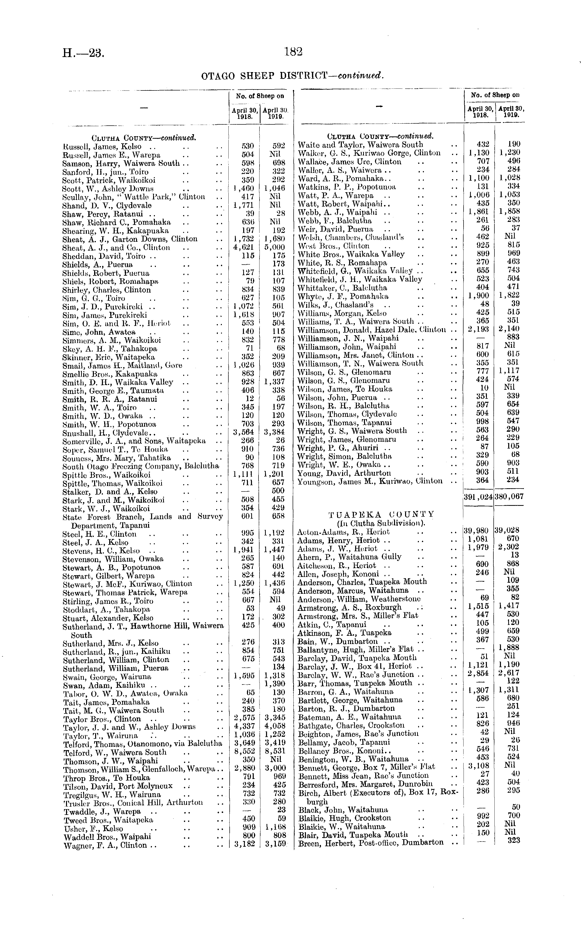 No. of Sheep on April 39,1 April 30 1918. 1019. No. of Sheep on April 3C,| April 30, 1918. 1919. Clutha County— continued. RusseU, Jamos, Kolso Russell, James E., Warepa Samson, Harry, Waiwera South Sanford, il., jun., Toiro Scott, Patrick, Waikoikoi Scott, W., Ashley Downs Scullay, John, " Wattle Park," Clinton Shand, D. V., Clydevale Shaw, Percy, Ratanui Shaw, Richard G, Pomahaka Shearing, W. H., Kakapuaka Sheat, A. J., Garton Downs, Clinton Sheat, A. J., and Co., Clinton Sheddan, David, Toiro Shields, A., Puerua Shields, Robert, Puerua Shiels, Robort, Romahapa Shirley, Charles, Clinton Sim, G. G.. Toiro Sim, J. D., Purekireki Sim, James, Purekireki Sim, O. E. and It. P., Heriot Sime, John, Awatea Simmers, A. M., Waikoikoi Skcy, A. 11. P., Tahakopa Skinner, Eric, Waitapeka Smail, James H., Maitland, Gore Smellie Bros., Kakapuaka Smith, D. IL, Waikaka Valley Smith, Georgo E., Taumata Smith, It. R. A., Ratanui Smith, W. A., Toiro Smith, W. D., Owaka Smith, W. IL, Popotunoa Snushall, H., Clydo vale.. Somorville, J. A., and Sons, Waitapeka .. Soper, Samuel T., Te Houka Soilness, Mrs. Mary, Tahatika South Otago Freezing Company, Balclutha Spittle Bros., Waikoikoi Spittle, Thomas, Waikoikoi Stalker, D. and A., Kelso Stark, J. and M., Waikoikoi Stark, W. J., Waikoikoi State Forest Branch, Lands and Survey Department, Tapanui Steel, H. E., Clinton Steel, J. A., Kelso Stevens, H. G, Kelso Stevenson, WiUiam, Owaka Stewart, A. B., Popotunoa Stewart, Gilbert, Warepa Stewart, J. McF., Kuriwao, Clinton Stewart, Thomas Patrick, Warepa Stirling, James R., Toiro Stoddart, A., Tahakopa Stuart, Alexander, Kelso Sutherland, J. T., Hawthorne Hill, Waiwera South Sutherland, Mrs. J., Kelso Sutherland, R., jun., Kaihiku Sutherland, WilUam, Clinton Sutherland, William, Puerua Swain, George, Wairuna Swan, Adam, Kaihiku Tabor, O. W. D., Awatea, Owaka Tait, James, Pomahaka Tait, M. G., Waiwera South Taylor Bros., Clinton Taylor, J. J. and W., Ashley Downs Taylor, T., Wairuna Telford, Thomas, Otanomono, via Balclutha Telford, W., Waiwera South Thomson, J. W., Waipahi Thomson, William S., Glcnfalloch, Warepa .. Throp Bros., Te Houka Tilson, David, Port Molyneux Trcgilgus, W. H., Wairuna Truster Bros., Conical Hill, Arthurton Twaddle, J., Warepa Tweed Bros., Waitapeka Usher, P., Kelso Waddell Bros., Waipahi Wagner, F. A., Clinton 530 504 598 220 859 I ,400 417 1,771 39 03!) 197 1,732 4,021 115 127 79 834 027 1 ,072 1,018 553 140 832 71 352 1,026 863 928 406 12 345 120 703 3,564 206 910 90 768 1,111 711 592 Nil 098 322 292 1,040 Nil Nil 28 Nil 192 1,080 5,000 175 173 131 107 839 105 501 907 504 116 778 08 209 939 007 1,337 338 50 197 120 293 3,384 20 730 108 719 1,201 057 500 455 429 058 Clutha County— continued. Waite and Taylor, Waiwera South Walker, G. S., Kuriwao Gorge, Clinton Wallace, James Ure, Clinton Waller, A. S., Waiwera Ward, A. R., Pomahaka.. Watkins, P. P., Popotunoa Watt, P. A., Warepa Watt, Robert, Waipahi.. Webb, A. J., Waipahi Webb, P., Balclutha Weir, David, Puerua Welsh, Chambers, Chasland's West Bros., Clinton White Bros., Waikaka Valley White, R. S., Romahapa Whitefield, G., Waikaka Valley Whitefield, J. 11., Waikaka Valley Whittaker, G, Balclutha Whyte, J. P., Pomahaka Wilks, J., Chasland's Williams, Morgan, Kelso Williams, T. A, Waiwera South Williamson, Donald, Hazel Dale, Clinton .. Williamson, J. N., Waipahi Williamson, John, Waipahi Williamson, Mrs. Janet, Clinton Williamson, T. N., Waiwora South Wilson, G. S., Glenomaru Wilson, G. S., Glenomaru Wilson, James, To Houka Wilson, John, Puerua Wilson, It. H., Balclutha Wilson, Thomas, Clydevalo Wilson, Thomas, Tapanui Wright, G. S., Waiwera South Wright, Jamos, Glenomaru Wright, P. G., Ahuriri Wright, Simon, Balclutha Wright, W. E., Owaka Young, David, Arthurton Youngson, James M., Kuriwao, Clinton .. 432 1,130 707 234 1,100 131 1,006 435 1,801 201 50 462 925 899 270 655 523 404 1,900 48 425 365 2,193 190 1,230 496 284 1,028 334 1,053 350 1,858 283 37 Nil 815 909 463 743 504 471 1,822 39 515 351 2,140 883 Nil 615 351 1,117 574 Nil 339 654 639 547 290 229 105 68 903 511 234 817 000 355 777 424 10 351 597 504 998 503 204 87 329 590 903 304 508 354 601 TUAPEKA COUNTY (In Clutha Subdivision). Acton-Adams, It., Heriot Adams, Henry, Heriot Adams, J. W., Heriot Ahern, P., Waitahuna Gully Aitcheson, it., Heriot Allen, Joseph, Kononi Anderson, Charles, Tuapeka Mouth Anderson, Marcus, Waitahuna Anderson, William, Weatherstone Armstrong, A. S., Roxburgh .; Armstrong, Mrs. S., Miller's Flat Atkin, O, Tapanui Atkinson, F. A., Tuapeka Bain, W., Dumbarton .. Ballantyne, Hugh, Miller's Flat Barclay, David, Tuapeka Mouth Barclay, J. W., Box 41, Heriot Barclay, W. W., Rae's Junction Barr, Thomas, Tuapeka Mouth Barron, G. A., Waitahuna Bartlott, George, Waitahuna Barton, R. J., Dumbarton Bateman, A. E., Waitahuna Bathgate, Charles, Crookston Beighton, James, Rao's Junction Bellamy, Jacob, Tapanui Bellaney Bros., Kononi.. Bonington, W. B., Waitahuna Bennett, George, Box 7, Miller's Flat Bennett, Miss Jean, Rae's Junction Berresford, Mrs. Margaret, Dunrobin Birch, Albert (Executors of), Box 17, Roxburgh Black, John, Waitahuna Blaikie, Hugh, Crookston Blaikie, W., Waitahuna .. Blair, David, Tuapeka Mouth Breen, Herbert, Post-oHice, Dumbarton .. 391,024 380,007 995 342 1,941 265 587 824 1,250 551 067 53 172 425 I , I 92 331 1,447 140 091 442 I ,430 594 Nil 49 302 400 39,980 1,081 1,979 690 240 39,028 670 2,302 13 868 Nil 109 355 82 1,417 530 120 659 530 1,888 Nil 1,190 2,017 122 1,311 080 251 124 940 Nil 20 731 524 Nil 40 504 295 69 1,515 447 105 499 367 276 854 675 1,595 65 240 385 2,575 4,337 1,036 3,649 8,552 350 2,880 791 234 732 330 313 751 543 134 1,318 1,390 130 370 180 3,345 4,058 1,252 3,419 8,531 Nil 3,000 909 425 732 280 23 59 1,108 808 3,159 51 1,121 2,854 1,307 586 121 826 42 29 546 453 3,108 27 423 286 450 909 800 3,182 992 202 150 50 700 Nil Nil 323