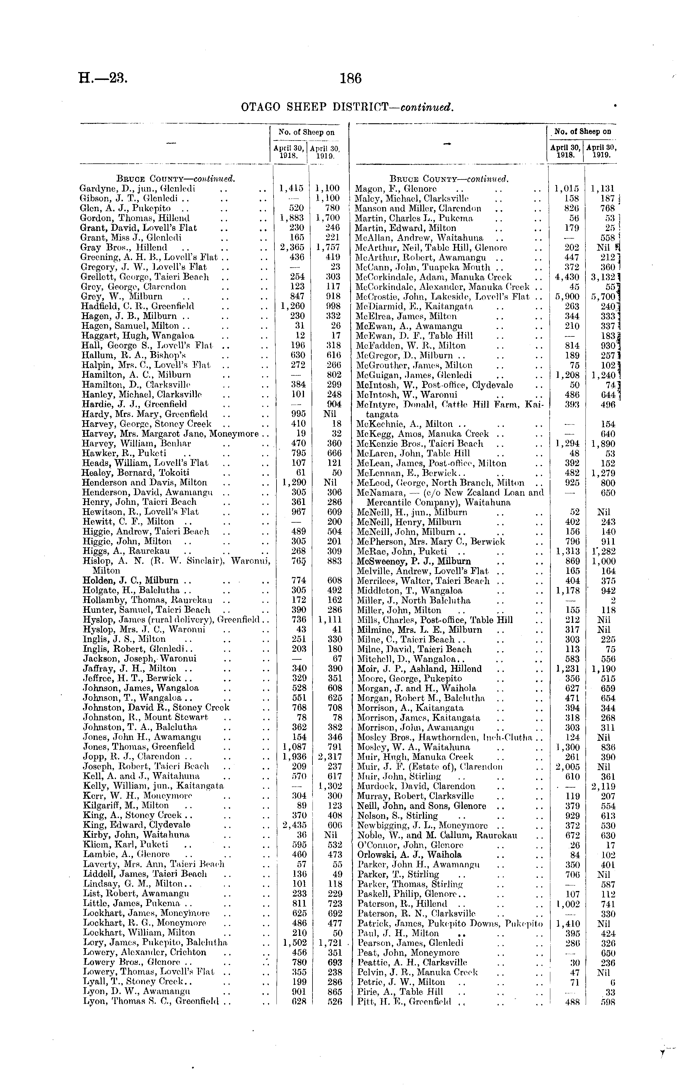 No. of SI April 30,1 1918. deep on April 30, 1919. No. of Sheep on April 39, | April 30, 1918. 1919. Bruce County— continued. Gardyne, D., jun., Glenledi Gibson, J. T., Glenledi Glen, A. J., Pukepito Gordon, Thomas, Hillend Grant, David, Lovcll's Flat Grant, Miss J., Glenledi Gray Bros., Hillend Greening, A. H. B., Lovell's Flat Gregory, J. W., Lovell's Flat Grellett, George, Taieri Beach Grey, George, Clarendon Grey, W., Milburn Hadfield, C. It., Greenfield Hagen, J. B., Milburn Hagen, Samuel, Milton Haggart, Hugh, Wangaloa Hall, Georgo S., Lovell's Flat Hallum, It. A., Bishop's Halpin, Mrs. C, Lovell's Flat Hamilton, A. G, Milburn Hamilton, D., Clarksville Hanley, Michael, Clarksville Hardie, J. J., Greenfield Hardy, Mrs. Mary, Greenfield Harvey, George, Stoney Creek Harvey, Mrs. Margarot Jano, Moneymore .. Harvey, William, Bcnhar .. Hawker, R., Puketi Heads, William, Lovell's Flat Hoaley, Bornard, Tokoiti Henderson and Davis, Milton Henderson, David, Awamangu .. .. . Henry, John, Taieri Beach Hewitson, R., Lovell's Flat Hewitt, C. F., Milton Higgie, Andrew, Taieri Beach Higgie, John, Milton Higgs, A., Raurekau Hislop, A. N. (R. W. Sinclair), Waronui, Milton Holden, J. G, MUburn .. Holgate, H., Balclutha Hollamby, Thomas, Raurekau Hunter, Samuel, Taieri Beach Hyslop, James (rural delivery), Greenfield .. Hyslop, Mrs. J. C, Waronui Inglis, J. S., Milton Inglis, Robert, Glenledi Jackson, Joseph, Waronui Jaffray, J. H., Milton Jeffree, H. T\, Berwick Johnson, James, Wangaloa Johnson, T., Wangaloa Johnston, David R., Stoney CreelJohnston, It., Mount Stewart Johnston, T. A., Balclutha Jones, John H., Awamangu Jones, Thomas, Greenfield Jopp, It. J., Clarendon Joseph, Robert, Taieri Beach Kell, A. and J., Waitahuna Kelly, William, jun., Kaitangata Kerr, W. IL, Moneymore Kilgariff, M., Milton King, A., Stoney Creek King, Edward, Clydevale Kir by, John, Waitahuna Kliem, Karl, Puketi .. Lambie, A., Glenore Laverty, Mrs. Ann, Taieri Beach Liddoll, James, Taieri Beach Lindsay, G. M., Milton.. List, Robert, Awamangu Little, James, Pukema Lockhart, James, Moneymore Lockhart, It. Or., Moneymore Lockhart, William, Milton Lory, James, Pukepito, Balclutha Lowery, Alexander, Crichton Lowery Bros., Glenore Lowery, Thomas, Lovell's Flat Lyall, T., Stoney Creek.. Lyon, D. W., Awamangu Lyon, Thomas S. G, Greenfield 1,415 520 1,883 230 105 2,305 430 254 123 847 1,200 230 31 12 190 030 272 384 101 995 410 19 470 795 107 01 1,290 305 301 907 489 305 208 70§ 774 305 172 390 730 43 251 203 1,100 1,100 780 1,700 246 221 1,757 419 23 303 117 918 998 332 20 17 318 616 266 802 299 248 904 Nil 18 32 360 600 121 50 Nil 806 280 009 200 504 201 309 883 608 492 162 286 1,111 41 330 180 67 390 351 608 025 708 78 382 346 791 2,317 237 617 1,302 300 123 408 000 Nil 532 473 55 49 118 229 723 092 477 50 1,721 351 093 238 280 805 520 BRUOB County— continued. Magon, P., Glenore Maley, Michael, Clarksville Manson and Miller, Clarendon Martin, Charles L., Pukema Martin, Edward, Milton McAllan, Andrew, Waitahuna McArthur, Neil, Table Hill, Glenore MoArthur, Robert, Awamangu McCann, John, Tuapeka Mouth McCorkindalc, Adam, Manuka Creek McCorkindalc, Alexander, Manuka Creek .. McCrostie, John, Lakeside, Lovell's Flat .. McDiarmid, E., Kaitangata McElrca, James, Milton McEwan, A., Awamangu McEwan, D. P., Table HUI McFadden, W. It., Milton -McGregor, D., Milburn McGrouther, James, Milton McGuigan, James, Glenledi Mcintosh, W., Post-office, Clydevalo Mcintosh, W., Waronui Mclntyre, Donald, Cattle Hill Farm, Kaitangata McKechnie, A., Milton McKegg, Amos, Manuka Creek McKenzie Bros., Taieri Beach McLaren, John, Table Hill McLean, James, Post-office, Milton McLennan, E., Berwick.. MoLeod, George, North Branch, Milton MoNamara, — (c/o Now Zealand Loan and Mercantile Company), Waitahuna McNeill, II., jun., Milburn McNeill, Henry, Milburn McNeill, John, Milburn McPherson, Mrs. Mary G, Berwick McRae, John, Puketi McSweeney, P. J., MUburn Melville, Andrew, Lovcll's Flat Merrilecs, Walter, Taieri Beach Middleton, T., Wangaloa Miller, J., North Balclutha Miller, John, Milton Mills, Charles, Post-office, Table Hill Milmine, Mrs. L. E., Milburn Milne, G, Taieri Beach Milne, David, Taieri Beach Mitchell, D., Wangaloa.. Moir, J. P., Ashland, Hillend Monro, George, Pukepito Morgan, J. and H., Waihola Morgan, Robert M., Balclutha Morrison, A., Kaitangata Morrison, James, Kaitangata Morrison, John, Awamangu Moslev Bros., Hawthornden. Ineli-Clulhn .. Mosley, W. A., Waitahuna Muir, Hugh, Manuka Creek Muir. J. F. (Estate of), Clarendon .Muir, John, Stirling Murdoek, David, Clarendon Murray, Itobert, Clarksville Neill, John, and Sons, Glenore Nelson, S., Stirling Newbigging, J. L., Moneymore Noble, W., and M. Galium, Raurekau O'Connor, John, Glenore Orlowski, A. J., Waihola Parker, John II., Awamangu Parkor, T., Stirling Parker, Thomas, Stirling Paskell. Philip. Glenore.. Paterson, R., Hillend Paterson, R. N., Clarksville Patrick, James, Pukepito Downs, Pukepito Paul, J. H„ Milton Pearson, James, Glenledi Peat, John, Moneymore Peattio, A. H„ Clarksville Pelvin, J. It., Manuka Creek Pctric, J. W., Milton Pirie, A., Table Hill Pjlt, II. E., Greenfield ,. 1,015 1.58 820 50 179 202 447 372 4,430 45 5,900 203 344 210 814 189 75 1,208 50 480 393 1,294 48 392 482 925 52 402 150 790 1,313 809 105 404 1,178 1,131 187 j 708' 53 1 25 ! 558 j Nil n 2.12] 300 1 3,132^ 55] 5,700] 240.1 333] 337 . 183 J 930] 2571 102? 1,240] '*] 044] 490 154 040 1,890 53 152 1,279 800 050 Nil 243 140 911 1", 282 1,000 104 375 942 2 118 Nil Nil 225 75 550 1,190 515 059 054 344 208 311 Nil 830 390 Nil 301 2,119 207 554 013 530 030 17 102 401 Nil 587 112 741 330 Nil 424 320 050 230 Nil 0 33 598 340 329 528 551 708 78 302 154 1,087 1,930 209 570 155 212 317 303 113 583 1,231 350 027 471 394 318 303 124 1,300 201 2,005 610 304 89 370 2,435 36 595 460 57 130 101 233 811 025 486 210 1,502 456 780 355 199 901 628 119 379 929 372 672 26 84 350 700 107 1,002 1,410 395 280 30 47 71 488