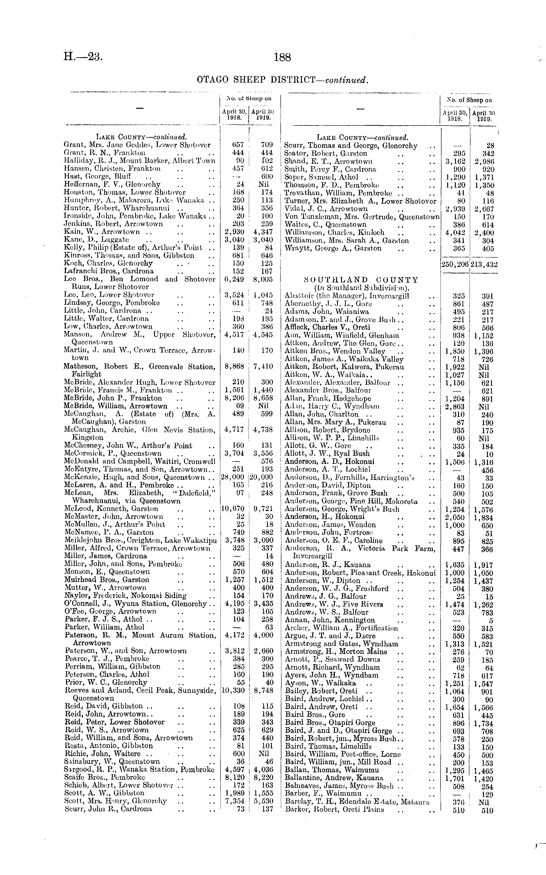 No. ot 8!)--p on April 30,1 April 30 1918. | 1919. Lake County— continued. Grant, Mrs. Jane Geddes, Lower Shotover 057 709 Grant, It. N., Frankton .. .. 444 j 414 Halliday, It. J., Mount Barkor, Albert Town 90 | 102 Hansen, Christen, Frankton .. .. 457 012 Hast, George, Bluff .. .. .. 000 Heffernan, P. V., Glenorchy .. .. 24 Nil Houston, Thomas, Lower Shotover .. 108 174 Humphrey, A., Makarora, Lake Wanaka .. 250 113 Hunter, Itobert, Wharehuanui .. .. 304 350 Ironside, John, Pembroke, Lake Wanaka .. 20 : 100 Jenkins, Robert, Arrowtown .. .. 203 259 Kain, W., Arrowtown .. .. .. 2,930 4,347 Kane, D., Luggate .. .. .. 3,040 3,040 Kelly, Philip (Estate of), Arthur's Point .. 139 84 Kinross, Thomas, and Sons, Gibbston .. 081 040 Koch, Charles, Glenorchy .. ■ .. 150 125 Lafranehi Bros., Cardrona .. .. j 152 107 Loo Bros., Ben Lomond and Shotover 0,249 8,005 Runs, Lower Shotovor Loo, Leo, Lower Shotover .. .. 3,524 ! 1,045 Lindsay, Goorgo, Pombroko .. .. Oil 748 Little, John, Cardrona .. .. .. — I 24 Little, Walter, Cardrona .. .. 198 195 Low, Charles, Arrowtown .. .. 300 380 Manson, Andrew M., Upper Shotover, 4,517 4,545 Quocnstown Martin, J. and W., Crown Terrace, Arrow- 140 ! 170 town Matheson, Itobert E., Greenvale Station, 8,808 I 7,410 Fairlight MoBride, Alexander Hugh, Lower Shotover 210 : 300 MoBride, Francis M., Frankton .. .. 1,501 i 1,440 McBride, John P., Frankton .. .. 8,206 8,058 MoBride, William, Arrowtown .. .. 69 Nil McCaughan, A. (Estato of) (Mrs. A. 489 599 McCaughan), Garston McCaughan, Archie, Glen Nevis Station, 4,717 4,738 Kingston McChesney, John W., Arthur's Point .. 100 131 McCormick, P., Queenstown .. .. 3,704 3,550 McDonald and Campboll, Waitiri, Cromwell — 570 McEntyre, Thomas, and Son, Arrowtown.. 251 193 McKenzie, Hugh, and Sons, Queenstown .. 28,000 20,000 McLaron, A. and IL, Pembroke .. .. 105 216 McLean, Mrs. Elizabeth, -'Dalefield," 97 , 248 Wharohuanui, via Queenstown MoLeod, Kenneth, Garston .. .. 10,070 19,721 McMaster, John, Arrowtown .. .. 32 30 McMullen, J., Arthur's Point .. .. 25 I 18 McNamee, P. A., Garston .. .. 749 i 882 Meiklejohn Bros., Creighton, Lake Wakatipu 3,748 j 3,090 Miller, Alfred, Crown Terrace, Arrowtown 325 337 Miller, James, Cardrona .. .. 14 Miller, John, and Sons, Pembroke .. 506 480 Monson, E., Queenstown .. .. 570 604 Muirhoad Bros., Garston .. .. 1,257 1,512 Mutter, W., Arrowtown .. .. 400 400 Naylor, Frederick, Nokomai Siding .. 154 170 O'Connell, J., Wyuna Station, Glonorchy .. 4,195 ' 3,435 O'Foo, George, Arrowtown .. .. 123 105 Parker, F. J. S., Athol .. .. .. 104 258 Parker, William, Athol .. .. — 63 Paterson, R. M., Mount Aurum Station, 4,172 4,000 Arrowtown Paterson, W., and Son, Arrowtown .. 3,812 2,660 Pearce, T. J., Pembroke .. .. 384 300 Pcrriani, William, Gibbston .. .. 285 295 Peterson, Charles, Athol .. .. 160 190 Prior, W. G, Glenorchy .. .. 55 j 40 Itooves and Acland, Cecil Peak, Sunnyside, .10,330 j 8,748 Queenstown Roid, David, Gibbston .. .. .. 108 115 Reid, John, Arrowtown.. .. .. 189 194 Reid, Peter, Lowor Shotovor .. .. 339 343 Roid, W. S., Arrowtown .. .. 625 629 Reid, William, and Sons, Arrowtown .. 374 440 ltosta, Antonio, Gibbston ".. .. 81 101 Richie, John, Waitere .. .. .. 600 Nil Siinsbury, W., Queenstown .. .. | 36 46 Sirgood, R. P., Wanaka Station, Pembroke 4,597 i 4,030 Scaife Bros., Pembroke .. .. 8,120 8,220 Schieb, Albert, Lower Shotover .. .. 172 \ 103 Scott, A. W., Gibbston ., .. 1,989 11,555 Scott, Mrs. Henry, Glenorchy .. .. 7,354 5,530 Sourr, John R., Cardrona .. .. 73 I 137 Lake County — continued. Scurr, Thomas and George, Glenorchy ... Seator, Robert, Garston Shand, E. T., Arrowtown Smith, Percy P., Cardrona Soper, Samuel, Athol Thomson, F. D., Pembroke Trovathan, William, Pembroke Tumor, Mrs. Elizabeth A., Lowor Shotovor Vidal, J. C, Arrowtown Von Tunzloman, Mrs. Gertrude, Queenstown Waitcs, G, Queenstown Williamson, Charles, Kinloch Williamson, Mrs. Sarah A., Garston Wraytt, Georgo A., Garston SOUTHLAND COUNTY (In Southland Subdivision). Abattoir (the Manager), Invcrcargill Abernethy, J. J. L., Gore Adams, John, Waianiwa Adamson, P. and J., Grove Bush Affleck, Charles V., Oreti Aim, William, Winfield, Glenham Aitken, Andrew, Tho Glen, Gore Aitken Bros., Wendon Valley Aitkon, James A., Waikaka Valley Aitken, Robort, Kaiwera, Pukerau Aitken, W. A., Waikaia.. Alexander, Alexander, Balfour Alexander Bros., Balfour Allan, Frank, Hedgehope Ail m, Harry C, Wyndham Allan, John, Charlton Allan, Mrs. Mary A., Pukerau Allison, Robert, Brydone Allison, W. P. P., Limehills Allott, G. W., Gore Allott, J. W., Ryal Bush Anderson, A. D., Hokonui Anderson, A. T., Lochiel Anderson, D., FernhUls, Harrington's Anderson, David, Dipton Anderson, Frank, Grove Bush Anderson, George, Pino Hill, Mokoreta Anderson, George, Wright's Bush Anderson, H., Hokonui Anderson, Jamos, Wendon Anderson, John, Fortrose Anderson, O. E. F,, Caroline Anderson, It. A., Victoria Park Farm, Invcrcargill Anderson, R. J., Kauana Anderson, Itobert, Pleasant Crook, Hokonui Anderson, W., Dipton Anderson, W. J. G., Freshford Andrews, J. G., Balfour Andrews, W. J., Five Rivers Andrew.., W. S., Balfour Annan, John, Kennington Archer, William A., Fortification Argue, J. T. and J., Dacre Armstrong and Gates, Wyndham Armstrong, II., Morton Mains Arnott, P., Seaward Downs Arnott, Richard, Wyndham Ayors, John H., Wyndham Ayson, W., Waikaka Bailey, Robert, Oreti Baird, Andrew, Lochiel Baird, Andrew, Oreti Baird Bros., Gore Baird Bros., Otapiri Gorgo Baird, J. and D., Otapiri Gorge Baird, Robert, jun., Myross Bush Baird, Thomas, Limehills Baird, William, Post-office, Lome Baird, William, jun., Mill Road Ballan, Thomas, Waimumu Ballantino, Andrew, Kauana Babieaves, James, Myross Bush Barber, F,, Waimumu Barclay, T. II., Edendale Estate, Mataura, Barker, Robert, Oreti Plains -\'o. of Sheep on April 30,1 April 30 1918. 1919. 295 3,1.02 900 1,290 1,120 41 80 2,939 150 380 4,042 341 305 250,200 i _.. ! 325 801 495 221 800 938 120 1,850 718