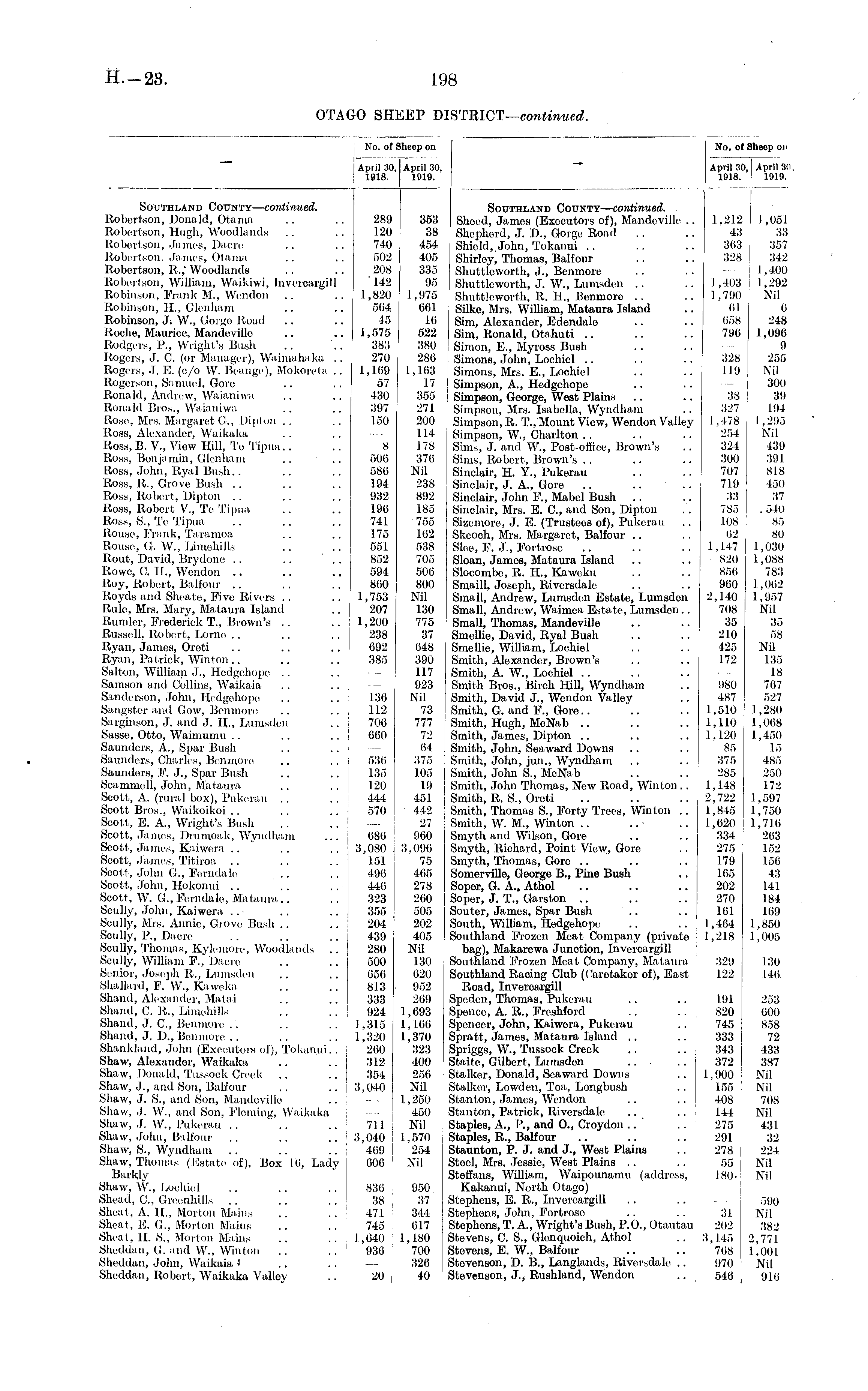 No. of Sheep on April 30, April 30, 1918. 1919. No. of 8 April 30, 1918. Sheep on , April 3d 1919. Southland County— continued. Robertson, Donald, Otama Robertson, Hugh, Woodlands Robertson, James, Dacre Robertson. James, Otama Robertson, It.,* Woodlands Robertson, William, Waikiwi, Invcrcargill Robinson, Frank M., Wendon Robinson, H., Glenham Robinson, J; W., Gorgo Road Roche, Maurice, Mandeville Rodgcrs, P., Wright's Bush Rogers, J. C. (or Manager), Waimahaka .. Rogers, J. E. (c/o W. Beangc), Mokoreta .. Rogerson, Samuel, Gore Ronald, Andrew, Waianiwa Ronald Bros., Waianiwa Rose, Mrs. Margaret G., Dipton .. .. Ross, Alexander, Waikaka Ross, B. V., View Hill, To Tipua.. Ross, Benjamin, Glenham Ross, John, Ryal Bush.. Ross, R., Grove Bush Ross, Robert, Dipton Ross, Robert V., Te Tipua Ross, S., Te Tipua Rouse, Frank, Taramoa Rouse, G. W., Limehills Rout, David, Brydone .. .. Rowe, C. 11., Wendon Roy, Itobert, Balfour Royds and Sheate, Five Rivers Rule, Mrs. Mary, Mataura Island Runiler, Frederick T., Brown's Russell, Robert, Lome Ryan, James, Oreti Ryan, Patrick, Winton Salton, William J., Hedgehope Samson and Collins, Waikaia Sanderson, John, Hedgehope Sangstcr and Gow, Benmore Sarginson, J. and J. IL, Lumsden Sasso, Otto, Waimumu Saunders, A., Spar Bush Saunders, Charles, Benmore Saundors, P. J., Spar Bush Scammell, John, Mataura Scott, A. (rural box), Pukerau Scott Bros., Waikoikoi Scott, E. A., Wright's Bush Scott, James, Drumoak, Wyndham Scott, James, Kaiwera Scott, James, Titiroa Scott, John Ot., Ferndale ... Scott, John, Hokonui .. .. ... Scott, W. Or., Ferndale, Mataura Scully, John, Kaiwera Scully, Mrs. Annie, Grove Bush Scully, P., Dacre Scully, Thomas, Kylemore, Woodlands Scully, William F., Dacre Senior, Joseph R., Lumsden Shalliud, F. W., Kaweka Shand, Alexander, Matai Shand, C. R., Limehills Shand, J. G, Benmore Shand, J. D., Benmore Shankland, John (Executors of), Tokanui.. Shaw, Aloxander, Waikaka Shaw, Donald, Tussock Creek Shaw, J., and Son, Balfour Shaw, J. S., and Son, Mandeville Shaw, J. W., and Son, Fleming, Waikaka Shaw, J. W., Pukerau .. Shaw, John, Balfour Shaw, S., Wyndham Shaw, Thomas (Estate of). Box 1(1, Lady Barkly Shaw, W., Lochiel Shead, C, Grccnhills Sheat, A. IL, Morton Mains Sheat, E. G., Morton Mains Sheat, H. S., Morton Mains Sheddan, G. and W., Winton Sheddan, John, Waikaia i Sheddan, Robert, Waikaka Valley 289 120 740 502 208 142 1,820 504 45 1,575 383 270 1,109 57 430 397 150 8 500 580 194 932 190 741 175 551 852 594 800 1,753 207 1,200 238 092 385 136 112 700 060 353 38 454 405 335 95 1,975 661 16 522 380 286 1,163 17 355 271 200 114 178 370 Nil 238 892 185 755 162 538 705 506 800 Nil 130 775 37 048 390 117 923 Nil 73 777 72 04 375 105 19 451 442 27 900 3,090 75 405 278 200 505 202 405 Nil 130 620 952 269 1,093 1,166 1,370 323 400 256 Nil 1,250 450 Nil 1,570 254 Nil Southland County— continued. Sheed, James (Executors of), Mandeville .. 1,212 Shepherd, J. D., Gorge Road .. .. 43 Shield, John, Tokanui .. .. .. 303 Shirley, Thomas, Balfour .. .. 328 Shuttleworth, J., Benmore .. .. — Shuttleworth, J. W., Lumsden .. .. 1,403 Shuttleworth, R. H., Benmore .. .. 1,790 Silke, Mrs. WiUiam, Mataura Island .. 01 Sim, Alexandor, Edendalo .. .. 058 Sim, Ronald, Otahuti .. .. .. 796 Simon, E., Myross Bush Simons, John, Lochiel .. .. .. 328 Simons, Mrs. E., Lochiel .. .. 119 Simpson, A., Hedgehope Simpson, George, West Plains .. .. 38 Simpson, Mrs. Isabella, Wyndham .. 327 Simpson, R. T., Mount Viow, Wendon Valloy 1,478 Simpson, W., Charlton .. .. .. 254 Sims, J. and W., Post-ofiice, Brown's .. 324 Sims, Robert, Brown's .. .. .. 300 Sinclair, H. Y., Pukerau .. .. 707 Sinclair, J. A., Gore .. .. .. 719 Sinclair, John P., Mabel Bush .. .. 33 Sinclair, Mrs. E. C, and Son, Dipton .. 785 Sizcmore, J. E. (Trustees of), Pukerau .. 108 Skeoch, Mrs. Margaret, Balfour .. .. 62 Sice, F. J., Fortrose .. .. ..1,147 i Sloan, James, Mataura Island .. .. 820 Slocombc, It. H., Kaweku .. .. 856 Smaill, Joseph, Riversdale .. .. 960 Small, Andrew, Lumsden Estate, Lumsden 2,140 Small, Andrew, Waimea Estate, Lumsden.. 708 Small, Thomas, Mandevillo .. .. 35 Smellie, David, Ryal Bush .. .. 210 Smellic, William, Lochiel .. . . 425 Smith, Alexander, Brown's .. .. 172 Smith, A. W., Lochiel Smith Bros., Birch Hill, Wyndham . . 980 Smith, David J., Wendon Valley .. 487 Smith, G. and P., Goro.. .. .. 1,510 Smith, Hugh, McNab .. .. .. J, 110 Smith, James, Dipton .. .. .. 1,120 Smith, John, Seaward Downs .. .. 85 Smith, John, jun., Wyndham .. .. 375 Smith, John S., McNab .. .. 285 Smith, John Thomas, New Road, Winton .. 1,148 Smith, R. S., Oreti .. .. ..2,722 Smith, Thomas S., Forty Trees, Winton .. 1,845 Smith, W. M., Winton .. .. • .. 1,620 Smyth and Wilson, Gore .. .. 334 Smyth, Richard, Point View, Gore .. 275 Smyth, Thomas, Goro .. .. .. 179 Somerville, George B., Pine Bush .. 165 Soper, G. A., Athol .. .. .. 202 Soper, J. T„ Garston .. .. .. 270 Souter, James, Spar Bush .. .. 161 South, WiUiam, Hedgehope .. .. 1,464 Southland Frozen Meat Company (private 1,218 1 bag), Makarewa Junction, Invcrcargill Southland Frozen Meat Company, Mataura : 329 Southland Racing Club (Caretaker of), East 122 Road, InvercargiU Speden, Thomas, Pukerau .. .. 191 Spence, A. R., Freshford .. ... 820 Spencer, John, Kaiwera, Pukerau .. 745 Spratt, James, Mataura Island .. .. j 333 Spriggs, W., Tussock Creek .. .. 343 Staite, Gilbert, Lumsden .. .. j . 372 Stalker, Donald, Seaward Downs .. I 1,900 Stalker, Lowden, Toa, Longbush .. 155 Stanton, James, Wendon .. .. 408 Stanton, Patrick, Riversdale .. .. 144 Staples, A., P., and 0., Croydon .. ' .. 275 Staples, R., Balfour .. .. .. 291 Staunton, P. J. and J., West Plains .. 278 Steel, Mrs. Jessie, West Plains .. .. 55 Steffans, WUliam, Waipounamu (address, I8(). Kakanui, North Otago) Stephens, E. R., Invcrcargill .. Stephens, John, Fortrose .. .. ■ 31 Stephens, T. A., Wright's Bush, P.O., Otautau 202 Stevens, C. S., Glenquoieh, Athol .. 3,145 S Stevens, E