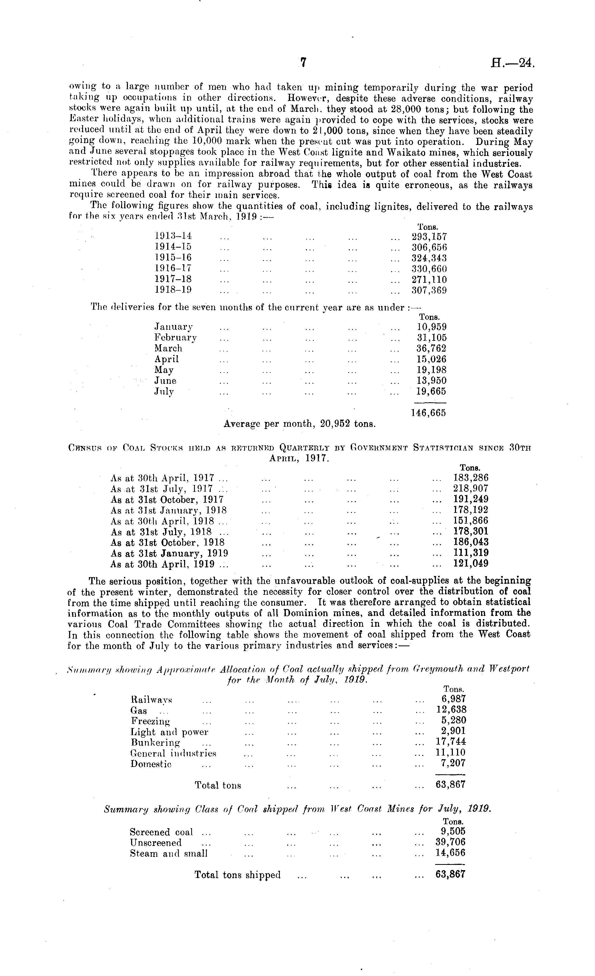 owing to a large number of men who had taken Up mining temporarily during the war period taking up occupations in other directions. However, despite these adverse conditions, railway stocks were again built up until, at the end of March, they stood at 28,000 tons; but following the Easter holidays, when additional trains were again provided to cope with the services, stocks were reduced until at tho end of April they were down to 2 1,000 tons, since when they have been steadily going down, reaching the 10,000 mark when the present cut was put into operation. During May and June several stoppages took place in the West Coast lignite and Waikato mines, which seriously restricted not only supplies available for railway requirements, but for other essential industries. There appears to be an impression abroad that the whole output of coal from the West Coast mines could be drawn on for railway purposes. This idea is quite erroneous, as the railways require screened coal for their main services. The following figures show the quantities of coal, including lignites, delivered to the railways for the six years ended 31st March, 1919 :-— Tons. 1913-14 ... ... ... ... ... 293,157 1914-15 ... ... ... ... ... 306,656 1915-16 ... ... ... ... ... 324,343 1916-17 ... ... ... ... ... 330,660 1917-18 ... ... ... ... 271,110 1918-19 ... ... ... 307,369 The deliveries for the seven months of the current year are as under :—■ Tons. January ... ... ... ... ... 10,959 February ... ... ... ... ... 31,105 March ' ... ... ... ... ... 36,762 April ... ... ... ... ... 15,026 May ... ... ... ... ... 19,198 June ... ... ... ... ... 13,950 July ... ... ... ... ... 19,665 146,665 Average per month, 20,952 tons. Chnsus of Coal Stocks held as returned Quarterly by Government Statistician since 30th April, 1917. Tons. As at 30th April, 1917 ... ... ... ... ... ... 183,286 As at 31st July, 1917 ... ... ... ... ... ... 218,907 As at 31st October, 1917 ... ... ... ... ... 191,249 As at 31st January, 1918 ... ... ... ... ... 178,192 As at 30th April, 1918 ... ... ... ... ... ... 151,866 As at 31st July, 1918 :... ... ... ... ... 178,301 As at 31st October, 1918 ... ... ... ... ... 186,043 As at 31st January, 1919 ... ... ... ... ... 111,319 As at 30th April, 1919 ... ... ... ... ... 121,049 The serious position, together with the unfavourable outlook of coal-supplies at the beginning of the present winter, demonstrated the necessity for closer control over the distribution of coal from the time shipped until reaching the consumer. It was therefore arranged to obtain statistical information as to the monthly outputs of all Dominion mines, and detailed information from the various Coal Trade Committees showing the actual direction in which the coal is distributed. In this connection the following table shows the movement of coal shipped from the West Coast for the month of July to the various primary industries and services: — Summary showing Approximate Allocation of Coal actually shipped from Greymouth and Westport for the Month of July,' 1919. Tons. Railways ... ... ... ... 6,987 Gas ..; ... ... ... ... .. 12,638 Freezing ... ... ... ... ... ... 5,280 Light and power ... ... ... ... ... 2,901 Bunkering ... ... ... ... ... ... 17,744 General industries ... ... ... ... ... 11,110 Domestic ... ... ... ... ... ... 7,207 Total tons ... ... ... ... 63,867 Summary showing Glass of Coal shipped from West Coast Mines for July, 1919. Tons. Screened coal ... ... ... ... ... ... 9,505 Unscreened ... ... ... ... ... ... 39,706 Steam and small ... ... ... ... ... 14,656 Total tons shipped ... ... ... .•• 63,867