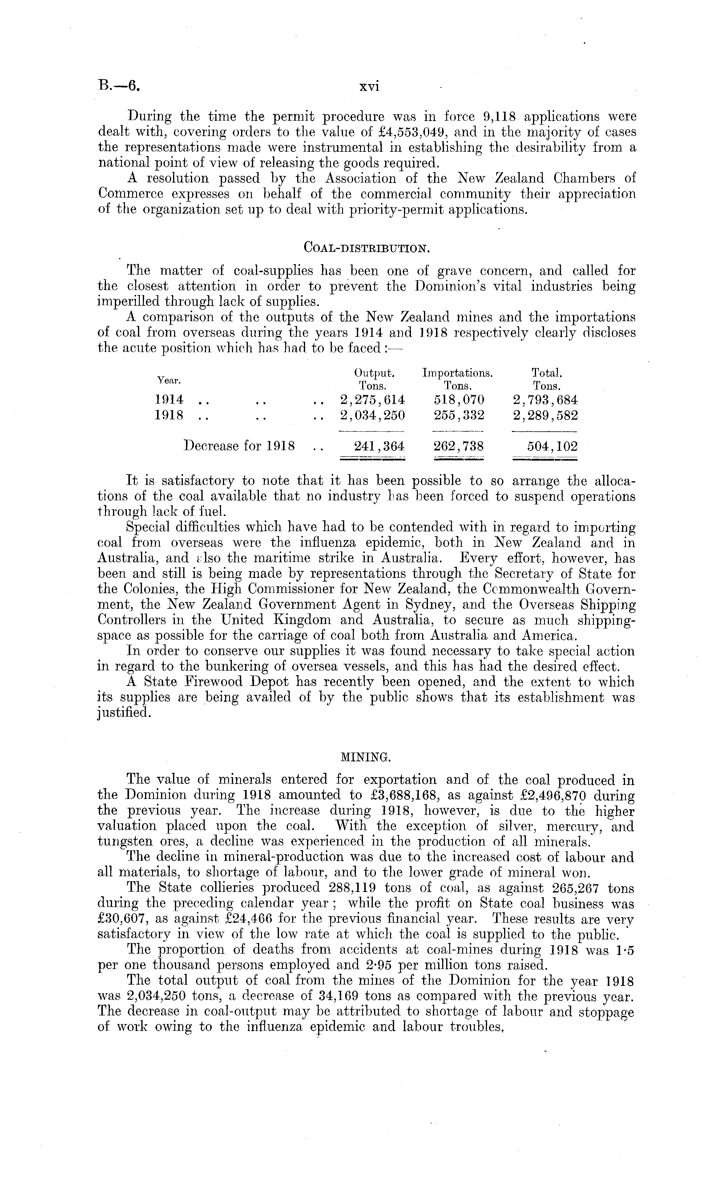 During the time the permit procedure was in force 9,118 applications were dealt with, covering orders to the value of £4,553,049, and in the majority of cases the representations made were instrumental in establishing the desirability from a national point of view of releasing the goods required. A resolution passed by the Association of the New Zealand Chambers of Commerce expresses on behalf of the commercial community their appreciation of the organization set up to deal with priority-permit applications. Coal-distribution. The matter of coal-supplies has been one of grave concern, and called for the closest attention in order to prevent the Dominion's vital industries being imperilled through lack of supplies. A comparison of the outputs of the New Zealand mines and the importations of coal from overseas during the years 1914 and 1918 respectively clearly discloses the acute position which has had to be faced : — Output. Importations. Total. Tons. Tons. Tons. 1914 .. .. .. 2,275,614 518,070 2,793,684 1918 .. .. .. 2,034,250 255,332 2,289,582 Decrease for 1918 . . 241 ,364 262,738 504,102 It is satisfactory to note that it has been possible to so arrange the allocations of the coal available that no industry has been forced to suspend operations through lack of fuel. Special difficulties which have had to be contended with in regard to importing coal from overseas were the influenza epidemic, both in New Zealand and in Australia, and dso the maritime strike in Australia. Every effort, however, has been and still is being made by representations through, the Secretary of State for the Colonies, the High. Commissioner for New Zealand, the Commonwealth Government, the New Zealand Government Agent in Sydney, and the Overseas Shipping Controllers in the United Kingdom and Australia, to secure as much shippingspace as possible for the carriage of coal both from Australia and America. In order to conserve our supplies it was found necessary to take special action in regard to the bunkering of oversea vessels, and this has had the desired effect. A State Firewood Depot has recently been opened, and the extent to which its supplies are being availed of by the public shows that its establishment was justified. MINING. The value of minerals entered for exportation and of the coal produced in the Dominion during 1918 amounted to £3,688,168, as against £2,496,870 during the previous year. The increase during 1918, however, is due to the higher valuation placed upon the coal. With the exception of silver, mercury, and tungsten ores, a decline was experienced in the production of all minerals. The decline in mineral-production was due to the increased cost of labour and all materials, to shortage of labour, and to the lower grade of mineral won. The State collieries produced 288,119 tons of coal, as against 265,267 tons during the preceding calendar year ; while the profit on State coal business was £30,607, as against £24,466 for the previous financial, year. These results are very satisfactory in view of the low rate at which the coal is supplied to the public. The proportion of deaths from accidents at coal-mines during .1.9.18 was .1-5 per one thousand persons employed and 2-95 per million tons raised. The total output of coal from the mines of the Dominion for the year 1918 was 2,034,250 tons, a decrease of 34,169 tons as compared with the previous year. The decrease in coal-output may be attributed to shortage of labour and stoppage of work owing to the influenza epidemic and labour troubles,