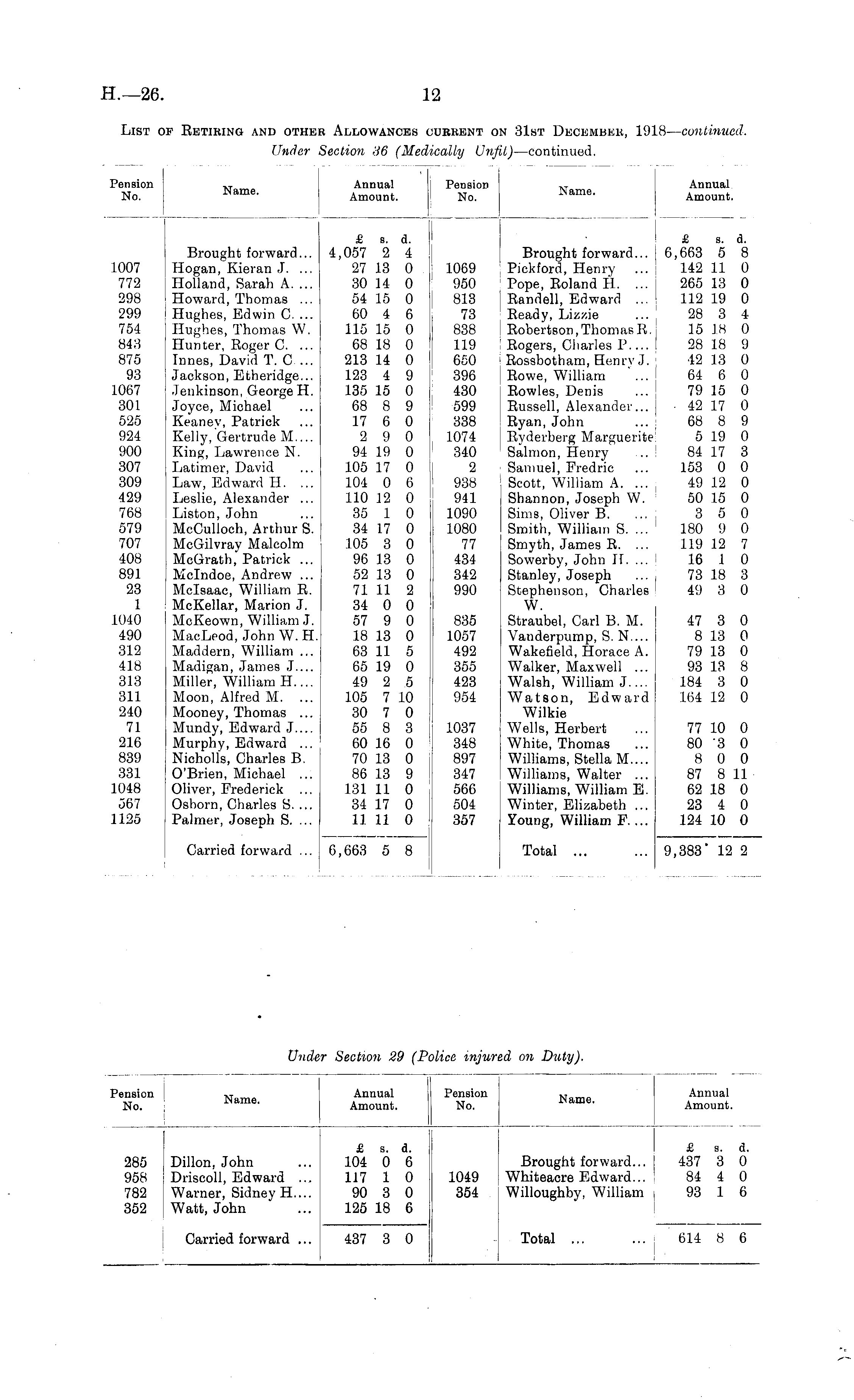 Pe £ sion Name. No. Annual Amount. I Pension No. Name. Annual Amount. 285 Dillon, John 958 Driscoll, Edward ... 782 Warner, Sidney H.... 352 Watt, John £ s. d. 104 0 6 117 1 0 90 3 0 125 18 6 1049 354 Brought forward... Whiteacre Edward... Willoughby, William £ s. d. 437 3 0 84 4 0 93 1 6 Carried forward ... Total ... 614 8 6 437 3 0