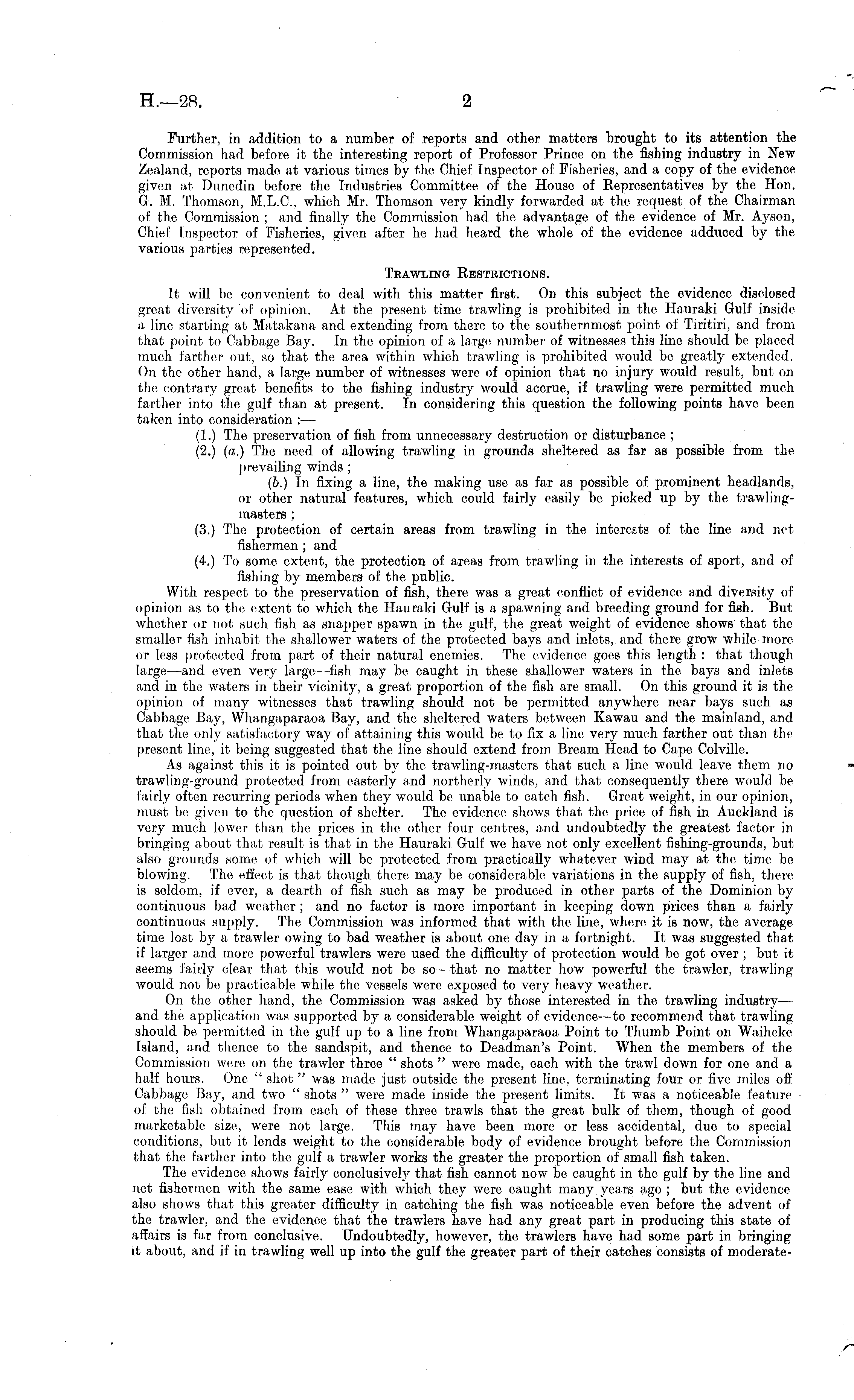 Further, in addition to a number of reports and other matters brought to its attention the Commission had before it the interesting report of Professor Prince on the fishing industry in New Zealand, reports made at various times by the Chief Inspector of Fisheries, and a copy of the evidence given at Dunedin before the Industries Committee of the House of Representatives by the Hon. G. M. Thomson, M.L.C., which. Mr. Thomson very kindly forwarded at the request of the Chairman of the Commission ; and finally the Commission had the advantage of the evidence of Mr. Ayson, Chief Inspector of Fisheries, given after he had heard the whole of the evidence adduced by the various parties represented. Trawling Restrictions. It will be convenient to deal with this matter first. On this subject the evidence disclosed great diversity of opinion. At the present time trawling is prohibited in the Hauraki Gulf inside a line starting at Matakana and extending from there to the southernmost point of Tiritiri, and from that point to Cabbage Bay. In the opinion of a large number of witnesses this line should be placed much farther out, so that the area within which trawling is prohibited would be greatly extended. On the other hand, a large number of witnesses were of opinion that no injury would result, but on the contrary great benefits to the fishing industry would accrue, if trawling were permitted much farther into the gulf than at present. In considering this question the following points have been taken into consideration :— (1.) The preservation of fish from unnecessary destruction or disturbance ; (2.) (a.) The need of allowing trawling in grounds sheltered as far as possible from the prevailing winds ; (b.) In fixing a line, the making use as far as possible of prominent headlands, or other natural features, which could fairly easily be picked up by the trawlingmasters ; (3.) The protection of certain areas from trawling in the interests of the line and net fishermen ; and (4.) To some extent, the protection of areas from trawling in the interests of sport, and of fishing by members of the public. With respect to the preservation of fish, there was a great conflict of evidence and diversity of opinion as to the extent to which the Hauraki Gulf is a spawning and breeding ground for fish. But whether or not such fish as snapper spawn in the gulf, the great weight of evidence shows that the smaller fish inhabit the shallower waters of the protected bays and inlets, and there grow while more or less protected from part of their natural enemies. The evidence goes this length : that though large —and even very large —fish may be caught in these shallower waters in the bays and inlets and in the waters in their vicinity, a great proportion of the fish are small. On this ground it is the opinion of many witnesses that trawling should not be permitted anywhere near bays such as Cabbage Bay, Whangaparaoa Bay, and the sheltered waters between Kawau and the mainland, and that the only satisfactory way of attaining this would be to fix a line very much farther out than the present line, it being suggested that the lino should extend from Bream Head to Cape Colville. As against this it is pointed out by the trawling-masters that such a line would leave them no trawling-ground protected from easterly and northerly winds, and that consequently there would be fairly often recurring periods when they would be unable to catch fish. Great weight, in our opinion, must be given to the question of shelter. The evidence shows that the price of fish in Auckland is very much lower than the prices in the other four centres, and undoubtedly the greatest factor in bringing about that result is that in the Hauraki Gulf we have not only excellent fishing-grounds, but also grounds some of which will be protected from practically whatever wind may at the time be blowing. The effect is that though there may be considerable variations in the supply of fish, there is seldom, if ever, a dearth of fish such as may be produced in other parts of the Dominion by continuous bad weather ; and no factor is more important in keeping down prices than a fairly continuous supply. The Commission was informed that with the line, where it is now, the average time lost by a trawler owing to bad weather is about one day in a fortnight. It was suggested that if larger and more powerful trawlers were used the difficulty of protection would be got over ; but it seems fairly clear that this would not be so—that no matter how powerful the trawler, trawling would not be practicable while the vessels were exposed to very heavy weather. On the other hand, the Commission was asked by those interested in the trawling industry— and the application was supported by a considerable weight of evidence— to recommend that trawling should be permitted in the gulf up to a line from Whangaparaoa Point to Thumb Point on Waiheke Island, and thence to the sandspit, and thence to Deadman's Point. When the members of the Commission were on the trawler three " shots " were made, each with the trawl down for one and a half hours. One " shot " was made just outside the present line, terminating four or five miles off Cabbage Bay, and two " shots " were made inside the present limits. It was a noticeable feature of the fish obtained from each of these three trawls that the great bulk of them, though of good marketable size, were not large. This may have been more or less accidental, due to special conditions, but it lends weight to the considerable body of evidence brought before the Commission that the farther into the gulf a trawler works the greater the proportion of small fish taken. The evidence shows fairly conclusively that fish cannot now be caught in the gulf by the line and net fishermen with the same ease with which they were caught many years ago ; but the evidence also shows that this greater difficulty in. catching the fish was noticeable even before t