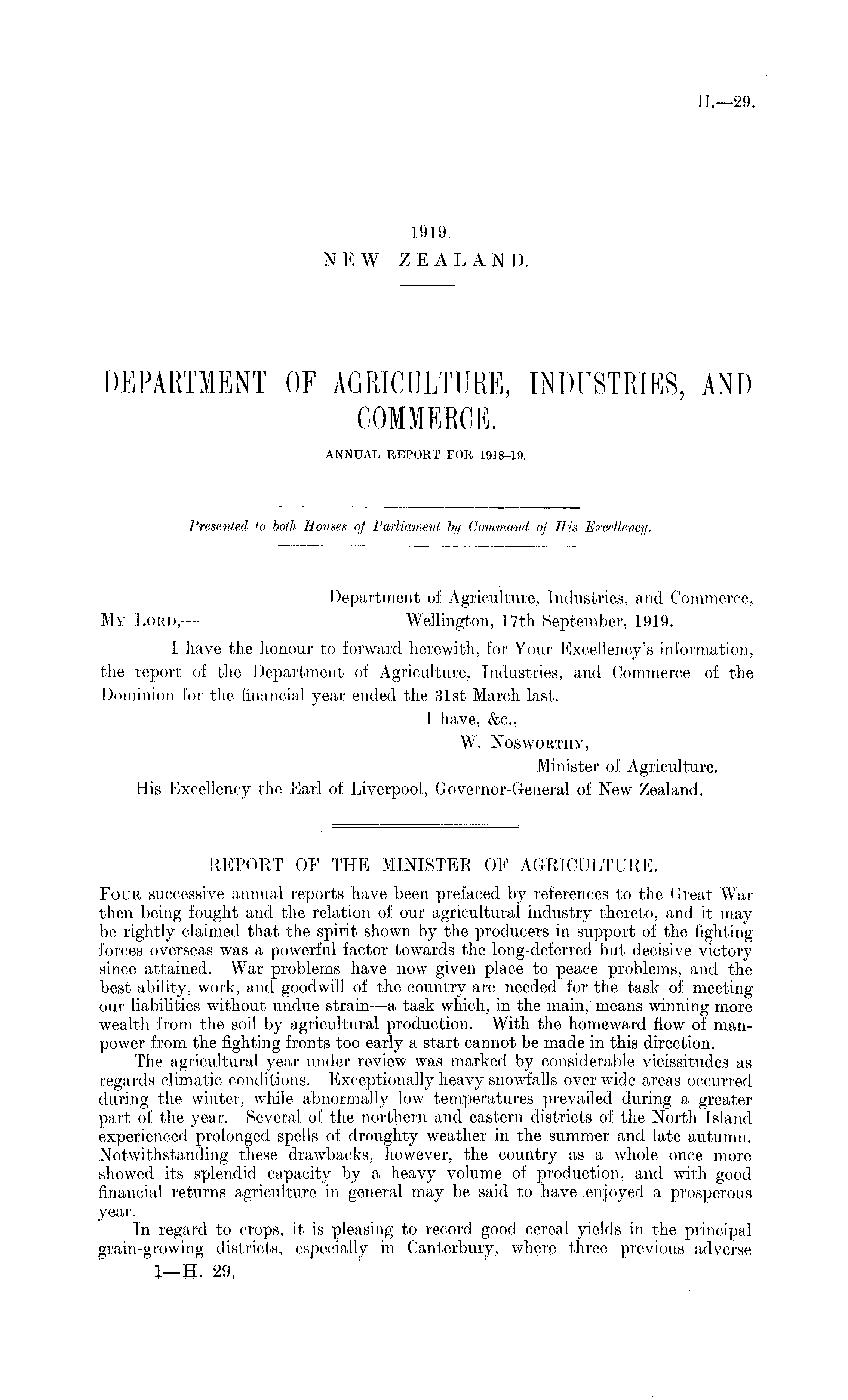 Department of Agriculture, Industries, and Commerce, My Lord, — Wellington, 17th September, 1919. 1 have the honour to forward herewith, for Your Excellency's information, the report of the Department of Agriculture, Industries, and Commerce of the Dominion for the financial year ended the 31st March last. I have, &c, W. Nosworthy, Minister of Agriculture. His Excellency the Earl of Liverpool, Governor-General of New Zealand.