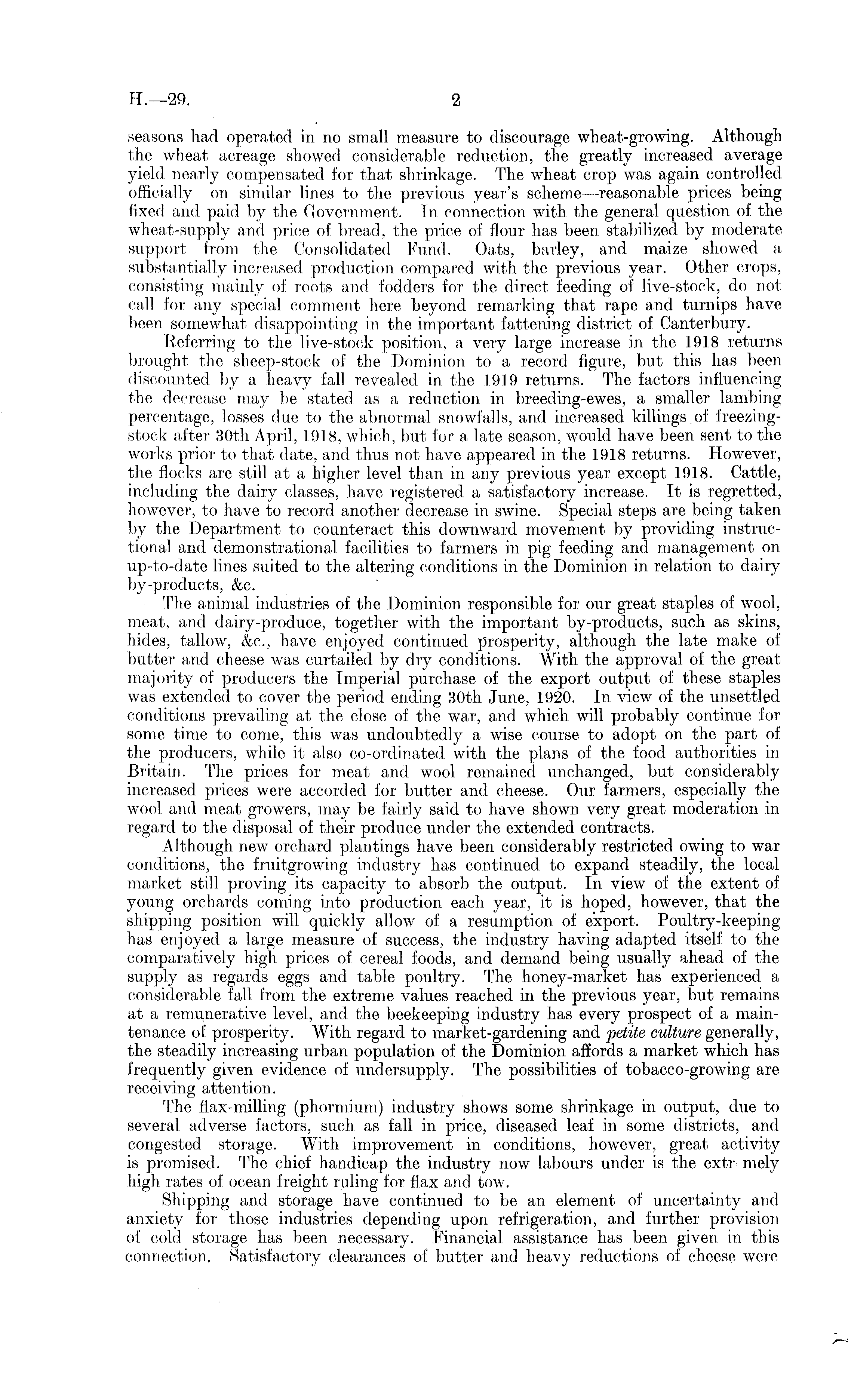 seasons had operated in no small measure to discourage wheat-growing. Although the wheat acreage showed considerable reduction, the greatly increased average yield nearly compensated for that shrinkage. The wheat crop was again controlled officially —on similar lines to the previous year's scheme—reasonable prices being fixed and paid by the Government. Tn connection with the general question of the wheat-supply and price of bread, the price of flour has been stabilized by moderate support from the Consolidated Fund. Oats, barley, and maize showed a substantially increased production compared with the previous year. Other crops, consisting mainly of roots and fodders for the direct feeding of live-stock, do not call for any special comment here beyond remarking that rape and turnips have been somewhat disappointing in the important fattening district of Canterbury. Referring to the live-stock position, a very large increase in the 1918 returns brought the sheep-stock of the Dominion to a record figure, but this has been discounted by a heavy fall revealed in the 1919 returns. The factors influencing the decrease may be stated as a reduction in breeding-ewes, a smaller lambing percentage, losses due to the abnormal snowfalls, and increased killings of freezingstock after 30th April, 1918, which, but for a late season, would have been sent to the works prior to that date, and thus not have appeared in the 1918 returns. However, the flocks are still at a higher level than in any previous year except 1918. Cattle, including the dairy classes, have registered a satisfactory increase. It is regretted, however, to have to record another decrease in swine. Special steps are being taken by the Department to counteract this downward movement by providing instructional and demonstrational facilities to farmers in pig feeding and management on up-to-date lines suited to the altering conditions in the Dominion in relation to dairy by-products, &c. The animal industries of the Dominion responsible for our great staples of wool, meat, and dairy-produce, together with the important by-products, such as skins, hides, tallow, &c, have enjoyed continued prosperity, although the late make of butter and cheese was curtailed by dry conditions. With the approval of the great majority of producers the Imperial purchase of the export output of these staples was extended to cover the period ending 30th June, 1920. In view of the unsettled conditions prevailing at the close of the war, and which will probably continue for some time to come, this was undoubtedly a wise course to adopt on the part of the producers, while it also co-ordinated with the plans of the food authorities in Britain. The prices for meat and wool, remained unchanged, but considerably increased prices were accorded for butter and cheese. Our farmers, especially the wool and meat growers, may be fairly said to have shown very great moderation in regard to the disposal of their produce under the extended contracts. Although new orchard plantings have been considerably restricted owing to war conditions, the fruitgrowing industry has continued to expand, steadily, the local market still proving its capacity to absorb the output. In view of the extent of young orchards coming into production each year, it is hoped, however, that the shipping position will quickly allow of a resumption of export. Poultry-keeping has enjoyed a large measure of success, the industry having adapted itself to the comparatively high prices of cereal foods, and demand being usually ahead of the supply as regards eggs and table poultry. The honey-market has experienced a considerable fall from the extreme values reached in the previous year, but remains at a remunerative level, and the beekeeping industry has every prospect of a maintenance of prosperity. With regard to market-gardening and petite culture generally, the steadily increasing urban population of the Dominion affords a market which has frequently given evidence of undersupply. The possibilities of tobacco-growing are receiving attention. The flax-milling (phormiuin) industry shows some shrinkage in output, due to several adverse factors, such as fall in price, eliseased leaf in some districts, and congested storage. With improvement in conditions, however, great activity is promised. The chief handicap the industry now labours under is the extr mely high rates of ocean freight ruling for flax and tow. Shipping and storage have continued to be an element of uncertainty and anxiety for those industries depending upon refrigeration, and further provision of cold storage has been, necessary. Financial assistance has been given in this connection. Satisfactory clearances of butter and heavy reductions of cheese were