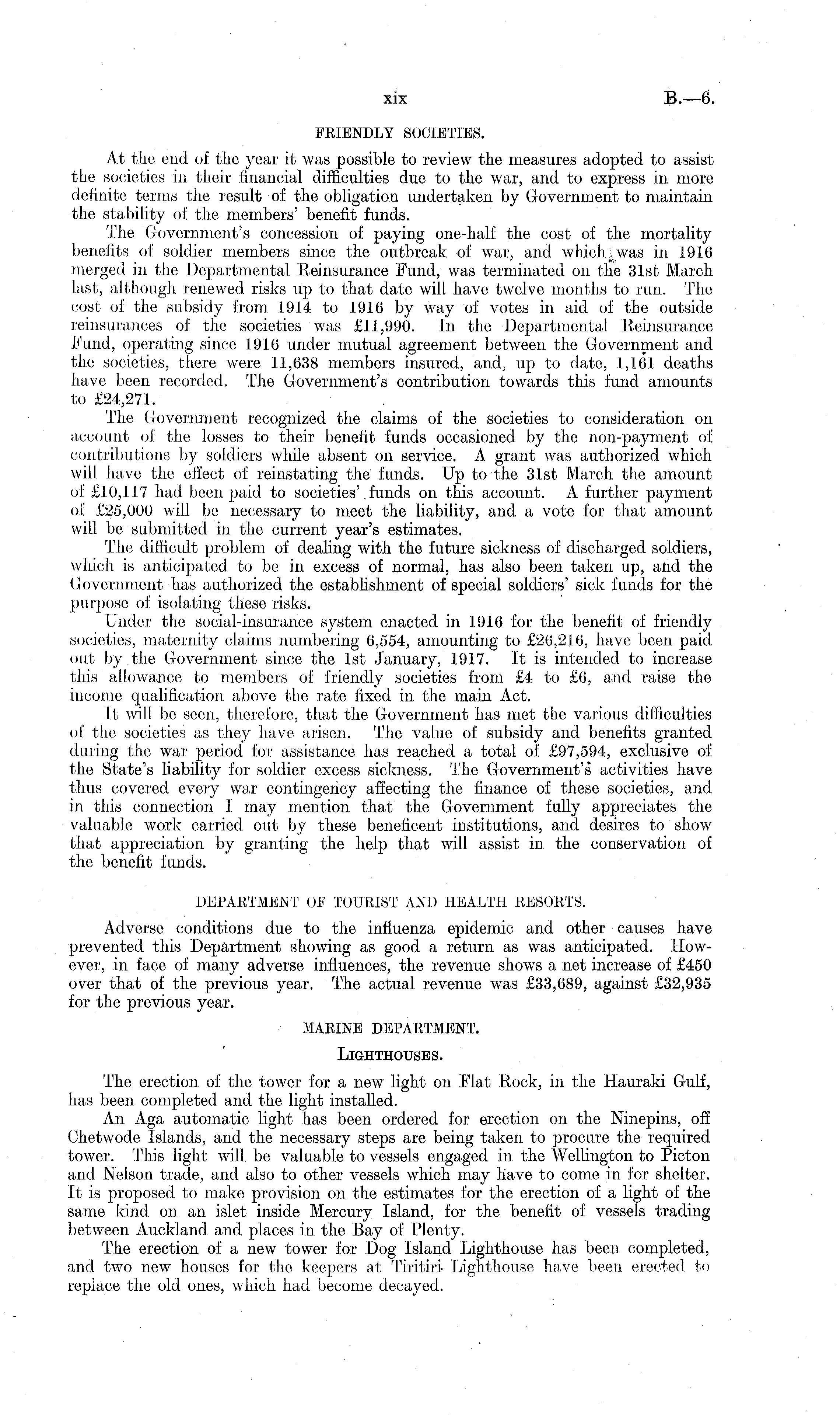 FRIENDLY SOCIETIES. At the end of the year it was possible to review the measures adopted to assist the societies in their financial difficulties due to the war, and to express in more definite terms the result of the obligation undertaken by Government to maintain the stability of the members' benefit funds. The Government's concession of paying one-half the cost of the mortality benefits of soldier members since the outbreak of war, and which was in 1916 merged m the Departmental Reinsurance Fund, was terminated on the 31st March last, although renewed risks up to that date will have twelve months to run. The cost of the subsidy from 1914 to 1916 by way of votes in aid of the outside reinsurances of the societies was £11,990. In the Departmental Reinsurance Fund, operating since 1916 under mutual agreement between the Government and the societies, there were 11,638 members insured, and; up to date, 1,161 deaths have been recorded. The Government's contribution towards this fund amounts to £24,271. The Government recognized the claims of the societies to consideration on account of the losses to their benefit funds occasioned by the non-payment of contributions by soldiers while absent on service. A grant was authorized which will have the effect of reinstating the funds. Up to the 31st March the amount of £10,117 had been paid to societies'. funds on this account. A further payment of £25,000 will be necessary to meet the liability, and a vote for that amount will be submitted in the current year's estimates. The difficult problem of dealing with the future sickness of discharged soldiers, which is anticipated to be in excess of normal, has also been taken up, and the Government has authorized the establishment of special soldiers' sick funds for the purpose of isolating these risks. Under the social-insurance system enacted in 1916 for the benefit of friendly societies, maternity claims numbering 6,554, amounting to £26,216, have been paid out by the Government since the Ist January, 1917. It is intended to increase this allowance to members of friendly societies from £4 to £6, and raise the income qualification above the rate fixed in the main Act. It will be seen, therefore, that the Government has met the various difficulties of the societies as they have arisen. The value of subsidy and benefits granted during the war period for assistance has readied a total of £97,594, exclusive of the State's liability for soldier excess sickness. The Government's activities have thus covered every war contingency affecting the finance of these societies, and in this connection I may mention that the Government fully appreciates the valuable work carried out by these beneficent institutions, and desires to show that appreciation by granting the help that will assist in the conservation of the benefit funds. DEPARTMENT OF TOURIST AND HEALTH RESORTS. Adverse conditions due to the influenza epidemic and other causes have prevented this Department showing as good a return as was anticipated. However, in face of many adverse influences, the revenue shows a net increase of £450 over that of the previous year. The actual revenue was £33,689, against £32,935 for the previous year. MARINE DEPARTMENT. Lighthouses. The erection of the tower for a new light on Flat Rock, in the Hauraki Gulf, has been completed and the light installed. An Aga automatic light has been ordered for erection on the Ninepins, off Chetwode Islands, and the necessary steps are being taken to procure the required tower. This light will be valuable to vessels engaged in the Wellington to Picton and Nelson trade, and also to other vessels which may have to come in for shelter. It is proposed to make provision on the estimates for the erection of a light of the same kind on an islet inside Mercury Island, for the benefit of vessels trading between Auckland and places in the Bay of Plenty. The erection of a new tower for Dog Island Lighthouse has been completed, and two new houses for the keepers at Tiritiri- Lighthouse have been erected to replace the old ones, which had become decayed.