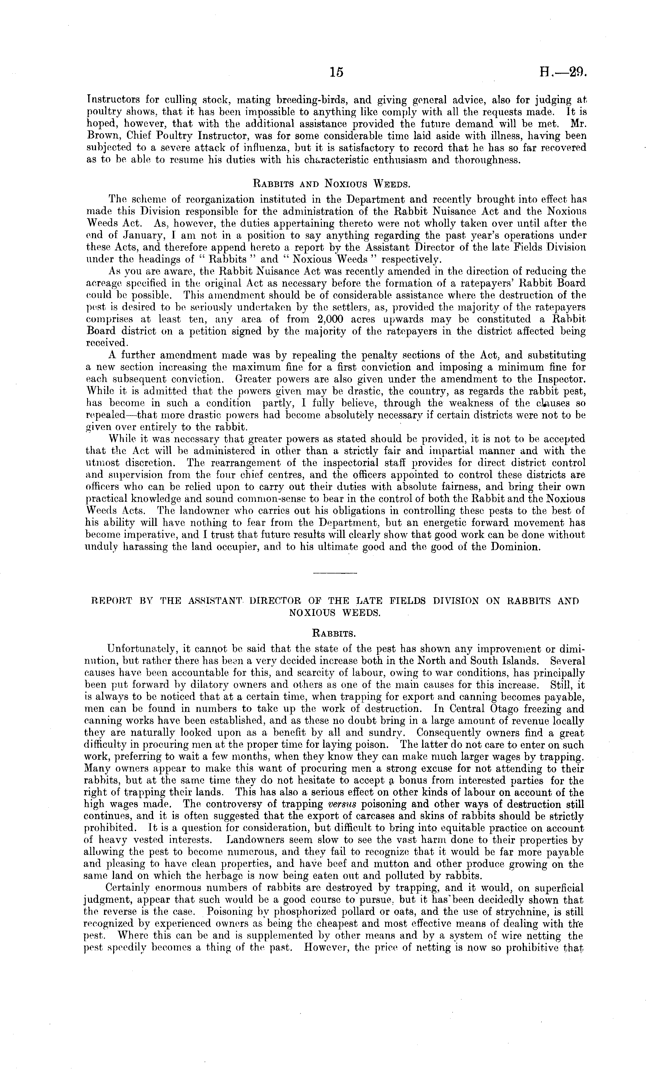 Instructors for culling stock, mating breeding-birds, and giving general advice, also for judging at poultry shows, that it has been impossible to anything like comply with all the requests made. It is hoped, however, that with the additional assistance provided the future demand will be met. Mr. Brown, Chief Poultry Instructor, was for some considerable time laid aside with illness, having been subjected to a severe attack of influenza, but it is satisfactory to record that he has so far recovered as to be, able to resume his duties with his characteristic enthusiasm and thoroughness. Rabbits and Noxious Weeds. The scheme of reorganization instituted in the Department and recently brought into effect has made this Division responsible for the administration of the Rabbit Nuisance Act and the Noxious Weeds Act. As, however, the duties appertaining thereto were not wholly taken over until after the end of January, I am not in a position to say anything regarding the past year's operations under these Acts, and therefore append hereto a report by the Assistant Director of the late Fields Division under the headings of " Rabbits " and " Noxious Weeds " respectively. As you are aware, the Rabbit Nuisance Act was recently amended in the direction of reducing the acreage specified in the original Act as necessary before the formation of a ratepayers' Rabbit Board could be possible. This amendment should be of considerable assistance where the destruction of the pest is desired to be seriously undertaken by the. settlers, as, provided the majority of the ratepayers comprises at least ten, any area of from 2,000 acres upwards may be constituted a Rabbit Board district on a petition signed by the majority of the ratepayers in the district affected being received. A further amendment made was by repealing the penalty sections of the Act, and substituting a new section increasing the maximum fine for a first conviction and imposing a minimum fine for each subsequent conviction. Greater powers are also given under the amendment to the Inspector. While it is admitted that the powers given may be drastic, the country, as regards the rabbit pest, has become in such a condition partly, I fully believe, through the weakness of the cLiuses so repealed—that more drastic powers had become absolutely necessary if certain districts were not to be given over entirely to the rabbit. While it was necessary that greater powers as stated should be provided, it is not to be accepted that the Act will be administered in other than a, strictly fair and impartial manner and with the utmost discretion. The rearrangement of the inspectorial staff provides for direct district control and supervision from the four chief centres, and the officers appointed to control these districts are officers who can be relied upon to carry out their duties with absolute fairness, and bring their own practical knowledge and sound common-sense to bear in the control of both the Rabbit and the Noxious Weeds Acts. The landowner who carries out his obligations in controlling these pests to the best of his ability will have nothing to fear from the Department, but an energetic forward movement has become imperative, and I trust that future results will clearly show that good work can be done without unduly harassing the land occupier, and to his ultimate good and the good of the Dominion. REPORT BY THE ASSISTANT. DIRECTOR OF THE LATE FIELDS DIVISION ON RABBITS ANT) NOXIOUS WEEDS. Rabbits. Unfortunately, it cannot be said that the state of the pest has shown any improvement or diminution, but rather there has been a very decided increase both in the North and South Islands. Several causes have been accountable for this, and scarcity of labour, owing to war conditions, has principally been put forward by dilatory owners and. others as one of the main causes for this increase. Still, it is always to be noticed that at a certain time, when trapping for export and canning becomes payable, men can be found in numbers to take up the work of destruction. In Central Otago freezing and canning works have been established, and as these no doubt bring in a large amount of revenue locally they are naturally looked upon as a benefit by all and sundry. Consequently owners find a great difficulty in procuring men at the proper time for laying poison. The latter do not care to enter on such work, preferring to wait a few months, when they know they can make much larger wages by trapping. Many owners appear to make this want of procuring men a strong excuse for not attending to their rabbits, but at the same time they do not hesitate to accept a bonus from interested parties for the right of trapping their lands. This has also a serious effect on other kinds of labour on account of the high wages made. The controversy of trapping versus poisoning and other ways of destruction still continues, and it is often suggested that the export of carcases and skins of rabbits should be strictly prohibited. It is a question for consideration, but difficult to bring into equitable practice on account of heavy vested interests. Landowners seem slow to see the vast harm done to their properties by allowing the pest to become numerous, and they fail to recognize that it would be far more payable and pleasing to have clean properties, and have beef and mutton and other produce growing on the same land on which the herbage is now being eaten out and polluted by rabbits. Certainly enormous numbers of rabbits are destroyed by trapping, and it would, on superficial judgment, appear that such would be a good course to pursue, but it has been decidedly shown that the reverse is the case. Poisoning by phosphorized pollard or oats, and the use of strychnine, is still recognized by experienced owners as being the cheapest and most effective means of dealing with the pest. Where this can be and is supplemented by other means and by a system of wire netting the pest speedily becomes 