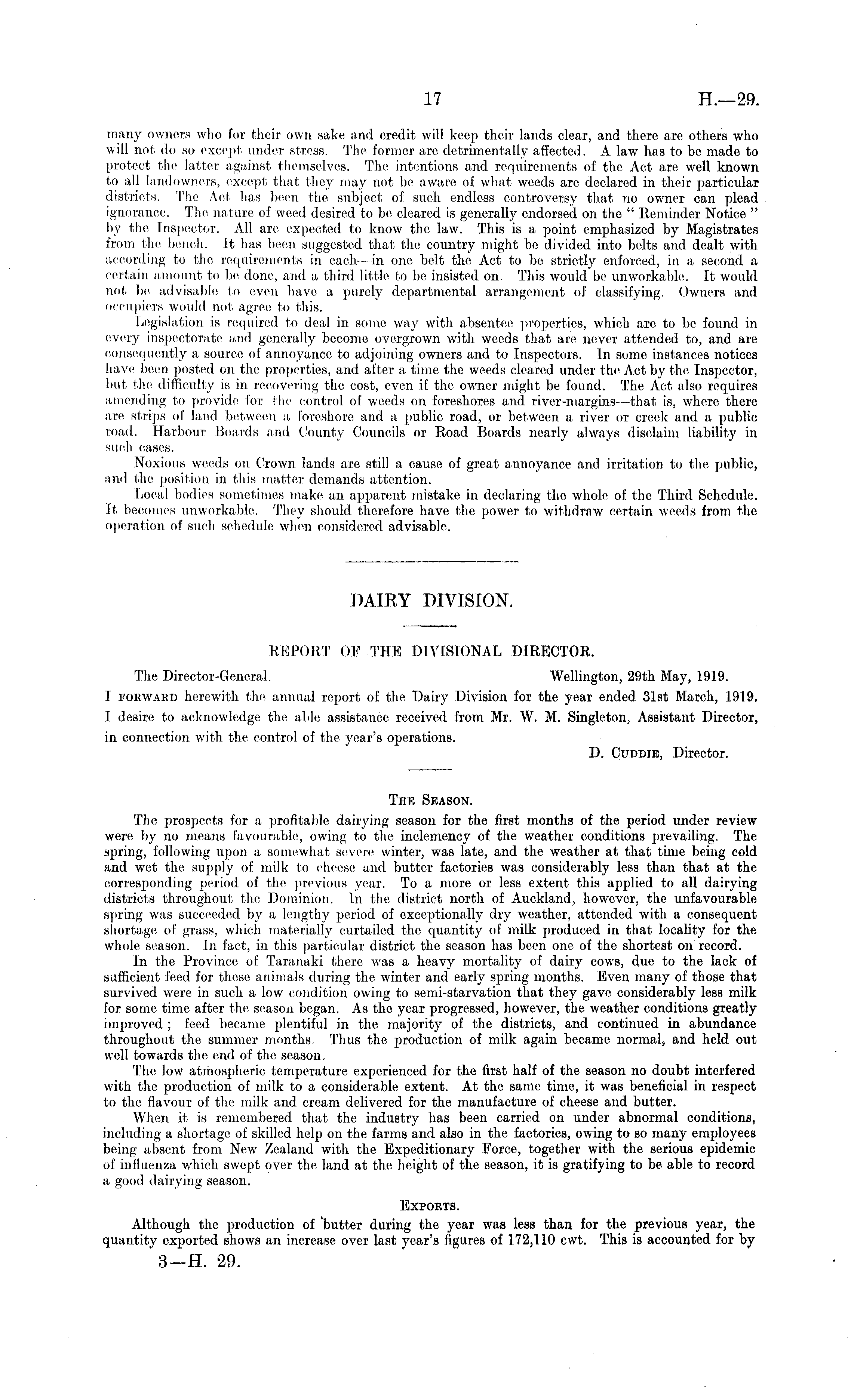 DAIRY DIVISION. REPORT OF THE DIVISIONAL DIRECTOR. The Director-General. Wellington, 29th May, 1919. I forward herewith the annual report of the Dairy Division for the year ended 31st March, 1919. I desire to acknowledge the able assistance received from Mr. W. M. Singleton, Assistant Director, in connection with the, control of the year's operations. D. Cuddie, Director. The Season. The prospects for a profitable dairying season for tho first months of the period under review were by no means favourable, owing to the inclemency of the weather conditions prevailing. The spring, following upon a somewhat severe winter, was late, and the weather at that time being cold and wet the supply of milk to cheese and butter factories was considerably less than that at the corresponding period of the previous year. To a more or less extent this applied to all dairying districts throughout the Dominion. In. the district north of Auckland, however, the unfavourable spring was succeeded by a lengthy period of exceptionally dry weather, attended with a consequent shortage of grass, which materially curtailed the quantity of milk produced in that locality for the whole season. In fact, in this particular district the season has been one. of the shortest on record. In the Province of Taranaki there was a heavy mortality of dairy cows, due to the lack of sufficient feed for these animals during the winter and early spring months. Even many of those that survived were in such a low condition owing to semi-starvation that they gave considerably less milk for some time after the season began. As the year progressed, however, the weather conditions greatly improved ; feed became plentiful in the majority of the districts, and continued in abundance throughout the summer months. Thus the production of milk again became normal, and held out well towards the end of the season. The low atmospheric temperature experienced for the first half of the season no doubt interfered with the production of milk to a considerable extent. At the same time, it was beneficial in respect to the flavour of the milk and cream delivered for the manufacture of cheese and butter. When it is remembered that the industry has been carried on under abnormal conditions, including a shortage of skilled help on the farms and also in the factories, owing to so many employees being absent from New Zealand with the Expeditionary Force, together with the serious epidemic of influenza which swept over the land at the height of the season, it is gratifying to be able to record a good dairying season. Exports. Although the production of "butter during the year was less than for the previous year, the quantity exported shows an increase over last year's figures of 172,110 cwt. This is accounted for by