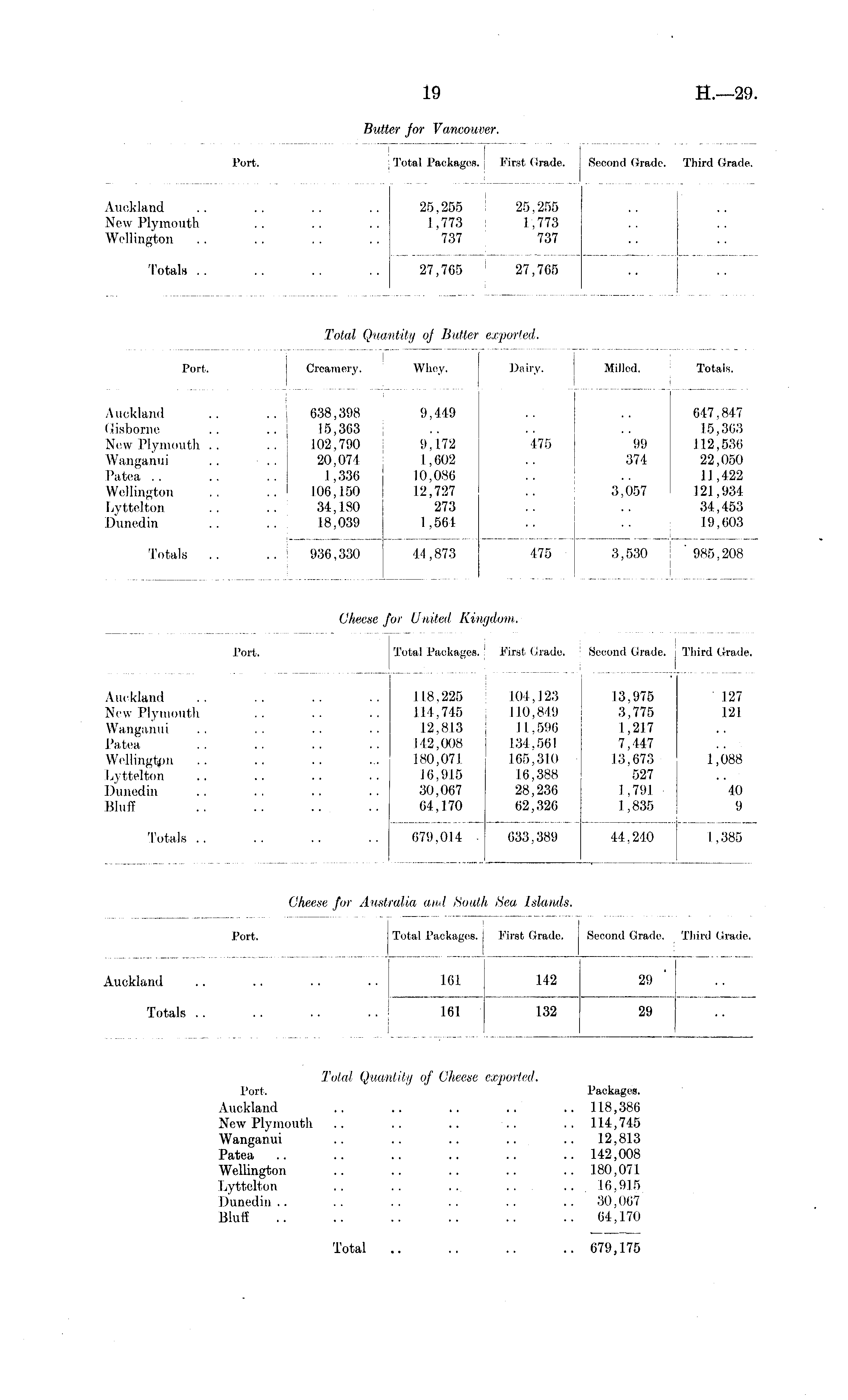 Port. Total Packages. First Grade, Second Grade, i Third Grade. Auckland New Plymouth Wanganui Patea Wellington ( .. Lyttelton Dunedin Bluff 118,225 114,745 12,813 142,008 180,071 16,915 30,067 64,170 101,123 110,849 11,596 134,561 165,310 16,388 28,236 62,326 13,975 3,775 1,217 7,447 13.673 527 1,791 1,835 127 121 1,088 40 9 Totals .. 679,014 633,389 44,240 1,385