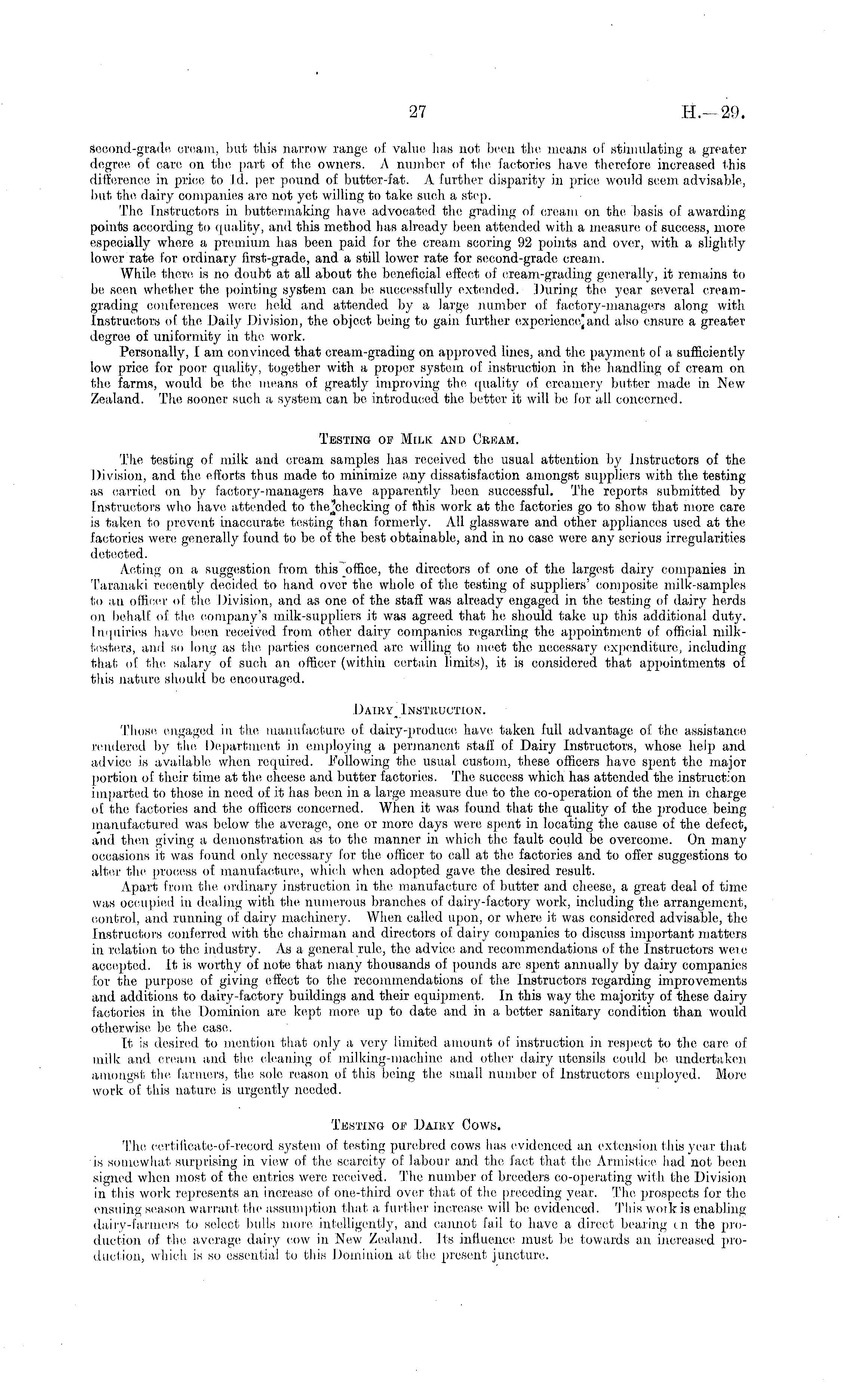 Second-grade, cream, but this narrow range of value has not been the means of stimulating a greater degree, of care on the part of the owners. A number of the factories have therefore increased this difference in price to Id. per pound of butter-fat. A further disparity in price would seem advisable, but the dairy companies are not yet willing to take such a step. The Instructors in buttermaking have advocated the grading of cream on the basis of awarding points according to quality, and this method has already been attended with a measure of success, more especially where a premium has been paid for the cream scoring 92 points and over, with a slightly lower rate for ordinary first-grade, and a still lower rate for second-grade cream. While there is no doubt at all about the beneficial effect of cream-grading generally, it remains to be seen whether the pointing system can be successfully extended. During the year several creamgrading conferences were hold and attended by a large number of factory-managers along with Instructors of the Daily Division, the object, being to gain further experience]and also ensure a greater degree of uniformity in the work. Personally, I am convinced that cream-grading on approved lines, and the payment of a sufficiently low price for poor quality, together with a proper system of instruction in the handling of cream on. the farms, would be. the means of greatly improving the quality of creamer)- butter made in New Zealand. The sooner such a system can be introduced tho better it will be for all concerned. Testing of Milk and Cream. The testing of milk and cream samples has received the usual attention by Instructors of the Division, and the efforts thus made to minimize any dissatisfaction amongst suppliers with the testing as carried on by factory-managers have apparently been successful. The reports submitted by Instructors who have attended to of this work at the factories go to show that more care is taken to prevent inaccurate testing than formerly. All glassware and other appliances used at the factories were generally found to be of the best obtainable, and in no case were any serious irregularities detected. Acting on a suggestion from this office, the directors of one of the largest dairy companies in Taranaki recently decided to hand over the whole of the testing of suppliers' composite milk-samples to ati officer of. the Division, and as one of the staff was already engaged in the testing of dairy herds on behalf of the company's milk-suppliers it was agreed that he should take up this additional duty. Enquiries have been received from other dairy companies regarding the appointment of official milktesters, and so long as the parties concerned are willing to meet the necessary expenditure, including that of the salary of such an officer (within certain limits), it is considered that appointments of this nature should be encouraged. Dairy, Instruction. Those engaged in the manufacture of dairy-produce have taken full advantage of the assistance rendered by the; Department in employing a permanent staff of Dairy Instructors, whose help and advice is available when required. Following the usual custom, these officers have spent the major portion of their time at the cheese and butter factories. The success which has attended the instruction imparted to those in need of it has been in a large measure due to the co-operation of the men in charge of the factories and the officers concerned. When it was found that the quality of the produce being manufactured was below the average, one or more days were spent in locating the cause of the defect, and then giving a demonstration as to the manner in which the fault could be overcome. On many occasions it was found only necessary for the officer to call at the factories and to offer suggestions to alter the process of manufacture, which when adopted gave the desired result. Apart from the ordinary instruction in the manufacture of butter and cheese, a great deal of time was occupied in dealing with the numerous branches of dairy-factory work, including the arrangement, control, and running of dairy machinery. When called upon, or where it was considered advisable, the Instructors conferred with the chairman and directors of dairy companies to discuss important matters in relation to the industry. As a general rule, tho advice and recommendations of the Instructors were accepted. It is worthy of note that many thousands of pounds arc spent annually by dairy companies for the purpose of giving effect to the recommendations of the Instructors regarding improvements and additions to dairy-factory buildings and their equipment. In this way the majority of these dairy factories in the Dominion are kept more up to date and in a better sanitary condition than would otherwise be the case. It is desired to mention that only a very limited amount of instruction in respect to the care of milk and cream and the cleaning of milking-machine and other dairy utensils could, be undertaken amongst the farmers, the solo reason of this being the small number of Instructors employed. More work of this nature is urgently needed. Testing of Dairy Cows. Tlic cei-tilicate-of-record system of testing purebred cows has evidenced an extension this year that is somewhat surprising in view of the scarcity of labour and. the fact that the Armistice had not been signed when most of the entries were received. The number of breeders co-operating with the Division in this work represents an increase of one-third over that of the preceding year. The prospects for the ensuing season warrant the assumption that a further increase will be evidenced. This work is enabling dairy-farmers to select bulls more intelligently, and cannot fail to have a direct bearing in the production of the average dairy cow in New Zealand. Its influence must be towards an increased production, which is so essential to this Dominion at the present juncture.