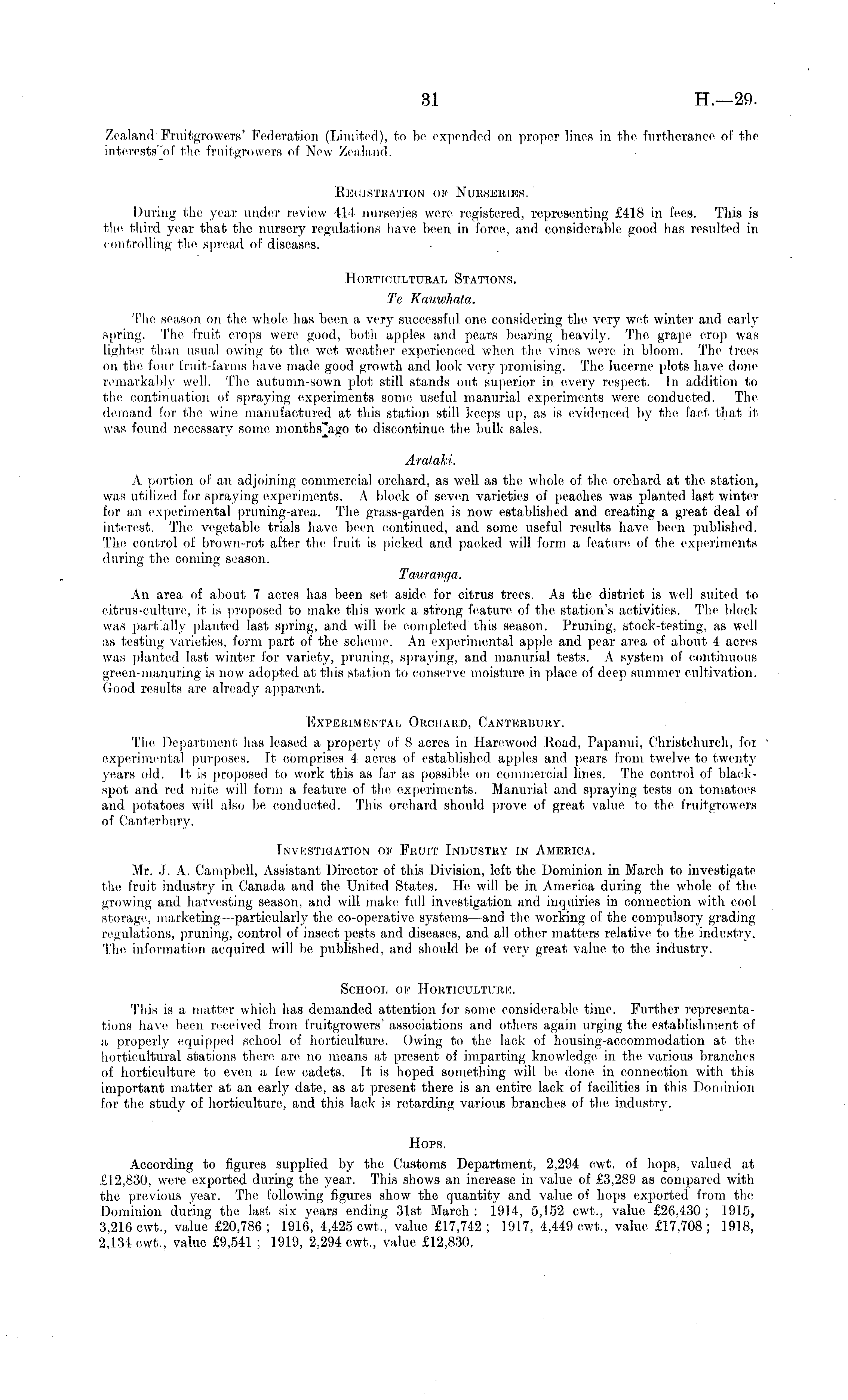 Zealand Fruitgrowers' Federation (Limited), to be expended on proper lines in the furtherance of the interests'of the fruitgrowers of New Zealand. Registration o.f Nurseries. During the year under review 414 nurseries were, registered, representing £418 in fees. This is the third year that the nursery regulations have been in force, and considerable good has resulted in controlling the spread of diseases. Horticultural Stations. Te Kauwhata. The season on the whole has been a very successful one considering the very wet winter and early spring. The fruit crops were good, both apples and pears bearing heavily. The grape crop was lighter than usual owing to the wet weather experienced when the vines were in bloom. The trees on the four fruit-farms have made good growth and look very promising. The. lucerne plots have done remarkably well. The autumn-sown plot still stands out superior in every respect. In addition to the continuation of spraying experiments some useful manurial experiments were conducted. The demand for the wine manufactured at this station still keeps up, as is evidenced by the fact that it; was found necessary some months'ago to discontinue the bulk sales. Arataki. A portion of an adjoining commercial orchard, as well as the whole of the orchard at the station, was utilized for spraying experiments. A block of seven varieties of peaches was planted last winter for an experimental pruning-area. The grass-garden is now established and creating a great deal of interest. The, vegetable trials have been continued, and some useful results have been published. The control of brown-rot after the fruit is picked and packed will form a feature of the experiments during the coming season. Tauranga. An area of about 7 acres has been set aside for citrus trees. As the, district is well suited to citrus-culture, if is proposed to make this work a strong feature of the station's activities. The block was partially planted last spring, and will be completed this season. Pruning, stock-testing, as well as testing varieties, form part of the scheme. An experimental apple and pear area of about 4 acres was planted last winter for variety, pruning, spraying, and manurial tests. A system of continuous green-manuring is now adopted at this station to conserve moisture in place of deep summer cultivation. Good results are already apparent. ExPERIMICNTAL ORCHARD, CANTERBURY. The Department has leased a property of 8 acres in Harewood Road, Papanui, Christchurch, for experimental purposes. It comprises 4 acres of established apples and pears from twelve to twenty years old. It is proposed to work this as far as possible on commercial lines. The control of blackspot and red mite will form a feature of the experiments. Manurial and spraying tests on tomatoes and potatoes will also be conducted. This orchard should prove of great value to the fruitgrowers of Canterbury. Investigation of Fruit Industry in America. Mr. J. A. Campbell, Assistant Director of this Division, left the Dominion in March to investigate the fruit industry in Canada and the United States. He will be in America during the whole of the growing and harvesting season, and will make full, investigation and inquiries in connection with cool storage, marketing particularly the, co-operative, systems—and the working of the compulsory grading regulations, pruning, control of insect pests and diseases, and all other matters relative to the industry. The information acquired will be published, and should be of very great value to the industry. School op Horticulture. This is a matter which has demanded attention for some considerable time. Further representations have been received from fruitgrowers' associations and others again urging the establishment of a properly equipped school of horticulture. Owing to the lack of housing-accommodation at the horticultural stations there are no means at present of imparting knowledge in the various branches of horticulture to even a few cadets, ft is hoped something will be done in connection with this important matter at an early date, as at present there is an entire lack of facilities in this Dominion for the study of horticulture, and this lack is retarding various branches of the industry. Hops. According to figures supplied by the Customs Department, 2,294 cwt. of hops, valued at £12,830, were exported during the year. This shows an increase in value of £3,289 as compared with the previous year. The following figures show the quantity and value of hops exported from the Dominion during the last six years ending 31st March: 1914, 5,152 cwt., value £26.430; 1915, 3,216 cwt., value £20,786; 1916, 4,425 cwt., value £17,742; 1917, 4,449 cwt., value £17.708; 1918, 2,134 cwt., value £9,541 ; 191.9, 2,294 cwt, value £12,830.
