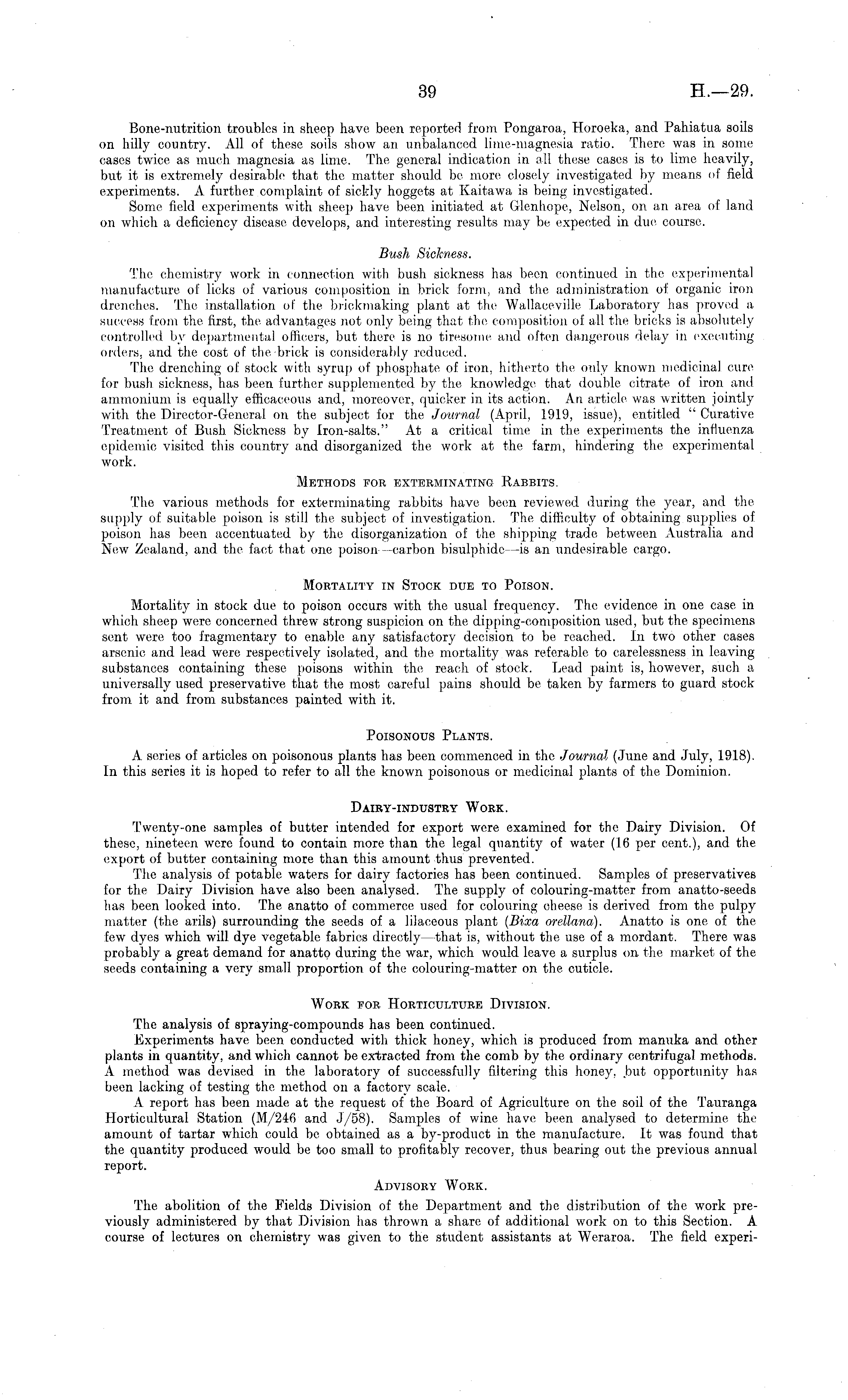 Bone-nutrition troubles in sheep have been reported from Pongaroa, Horoeka, and Pahiatua soils on hilly country. All of these soils show an unbalanced lime-magnesia ratio. There was in some cases twice as much magnesia as lime. The general indication in all these cases is to lime heavily, but it is extremely desirable that the matter should be more closely investigated by means of field experiments. A further complaint of sickly hoggets at Kaitawa is being investigated. Some field experiments with, sheep have been initiated at Glcnhope, Nelson, on an area of land on which a deficiency disease develops, and interesting results may be expected in due course. Bush Sickness. The. chemistry work in connection with bush sickness has been continued in the experimental manufacture of licks of various composition in brick form, and the administration of organic iron drenches. The installation of the bricktnaking plant at the Wallaceville Laboratory has proved a success from the first, the advantages not only being that the composition of all the bricks is absolutely controlled by departmental officers, but there is no tiresome and often dangerous delay in executing orders, and the cost of the-brick is considerably reduced. The drenching of stock with syrup of phosphate of iron, hitherto the only known medicinal cure for bush sickness, has been further supplemented by the knowledge that double citrate of iron and ammonium is equally efficaceous and, moreover, quicker in its action. An article was written jointly with the Director-General on the subject for the Journal (April, 1.919, issue), entitled " Curative Treatment of Bush Sickness by Iron-salts." At a critical time in the experiments the influenza, epidemic visited this country and disorganized the. work at the farm, hindering the experimental work. Methods for exterminating Rabbits. The various methods for exterminating rabbits have been reviewed during the year, and the. supply of suitable poison is still the. subject of investigation. The dilficulty of obtaining supplies of poison has been accentuated by the disorganization of the shipping trade between Australia and New Zealand, and the, fact that one poison—carbon bisulphide -is an undesirable cargo. Mortality in Stock due to Poison. Mortality in stock due to poison occurs with the usual frequency. The evidence in one case in which sheep were concerned threw strong suspicion on the dipping-composition used, but the specimens sent were too fragmentary to enable any satisfactory decision to be reached. In two other cases arsenic and lead were respectively isolated, and the mortality was referable to carelessness in leaving substances containing these poisons within the reach of stock. Lead paint is, however, such a universally used preservative that the most careful pains should be taken by farmers to guard stock from it and from substances painted with it. Poisonous Plants. A series of articles on poisonous plants has been commenced in the Journal (June and July, 191.8). In this series it is hoped to refer to all the. known poisonous or medicinal plants of the Dominion. Dairy-industry Work. Twenty-one samples of butter intended for export were examined for the Dairy Division. Of these, nineteen were found to contain more than the legal quantity of water (16 per cent.), and the export of butter containing more than this amount thus prevented. The analysis of potable waters for dairy factories has been continued. Samples of preservatives for the Dairy Division have also been analysed. The supply of colouring-matter from anatto-seeds has been looked into. The anatto of commerce used for colouring cheese is derived from the pulpy matter (the arils) surrounding the seeds of a filaceous plant (Bixa orellana). Anatto is one of the few dyes which will dye vegetable fabrics directly—that is, without the use of a mordant. There was probably a great demand for anatto during the war, which would leave a surplus on the market of the seeds containing a very small proportion of the colouring-matter on the cuticle. Work for Horticulture Division. The analysis of spraying-compounds has been continued. Experiments have been conducted with thick honey, which is produced from manuka and other plants in quantity, and which cannot be extracted from the comb by the ordinary centrifugal methods. A method was devised in the laboratory of successfully filtering this honey, but opportunity has been lacking of testing the method on a factory scale. A report has been made at the request of the Board of Agriculture on the soil of the Tauranga Horticultural Station (M/246 and J/58). Samples of wine have been analysed to determine the amount of tartar which could be obtained as a by-product in the manufacture. It was found that the quantity produced would be too small to profitably recover, thus bearing out the previous annual report. Advisory Work. The abolition of the Fields Division of the Department and the distribution of the work previously administered by that Division has thrown a share of additional work on to this Section. A course of lectures on chemistry was given to the student assistants at Weraroa. The field experi-