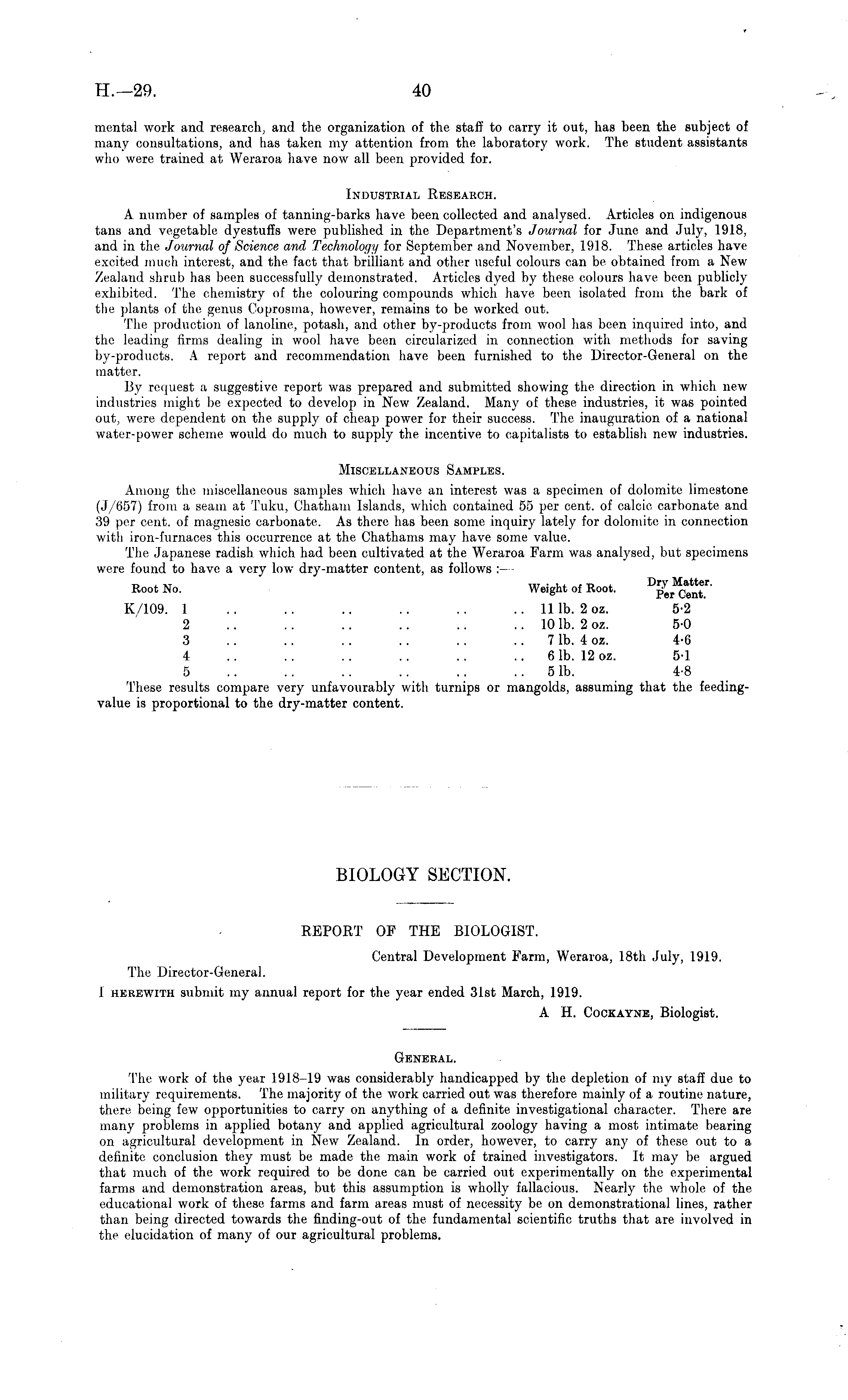 BIOLOGY SECTION. REPORT OF THE BIOLOGIST. Central Development Farm, Weraroa, 18th July, 1919. The Director-General. I herewith submit my annual report for the year ended 31st March, 1919. A H. Cockayne, Biologist. General. The work of the year 1918—19 was considerably handicapped by the depletion of my staff due to military requirements. The majority of the work carried out was therefore mainly of a routine nature, there being few opportunities to carry on anything of a definite investigational character. There are many problems in applied botany and applied agricultural zoology having a most intimate bearing on agricultural development in New Zealand. In order, however, to carry any of these out to a definite conclusion they must be made the main work of trained investigators. It may be argued that much of the work required to be done can be carried out experimentally on the experimental farms and demonstration areas, but this assumption is wholly fallacious. Nearly the whole of the educational work of these farms and farm areas must of necessity be on demonstrational lines, rather than being directed towards the finding-out of the fundamental scientific truths that are involved in the elucidation of many of our agricultural problems.