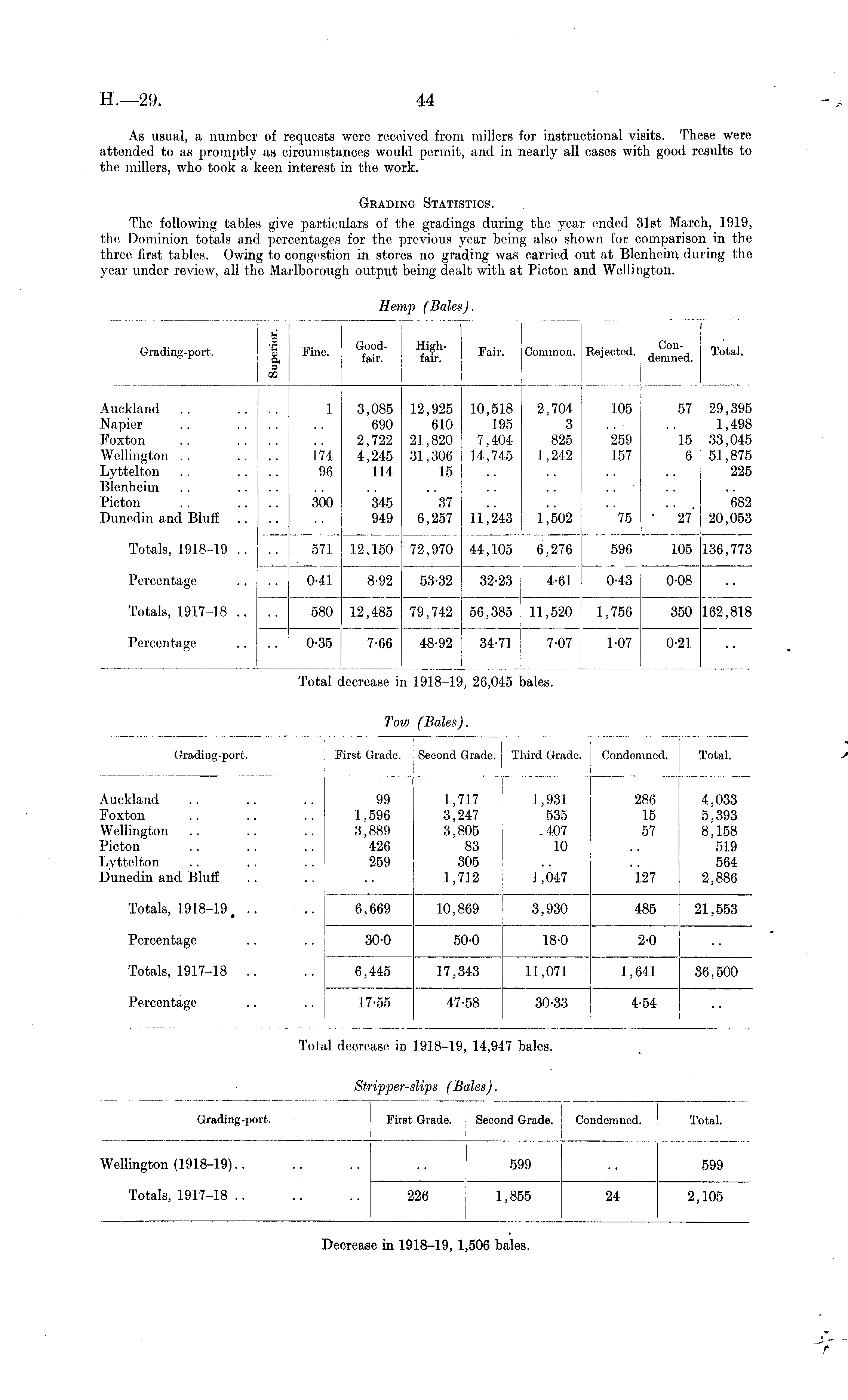 As usual, a number of requests were received from millers for instructional visits. These were attended to as promptly as circumstances would permit, and in nearly all cases with good results to the millers, who took a keen interest in the work. Grading Statistics. The following tables give particulars of the gradings during the year ended 31st March., 1919, the Dominion totals and percentages for the previous year being also shown for comparison in the three first tables. Owing to congestion in stores no grading was carried out at Blenheim during the year under review, all the Marlborough output being dealt with at Picton and Wellington.