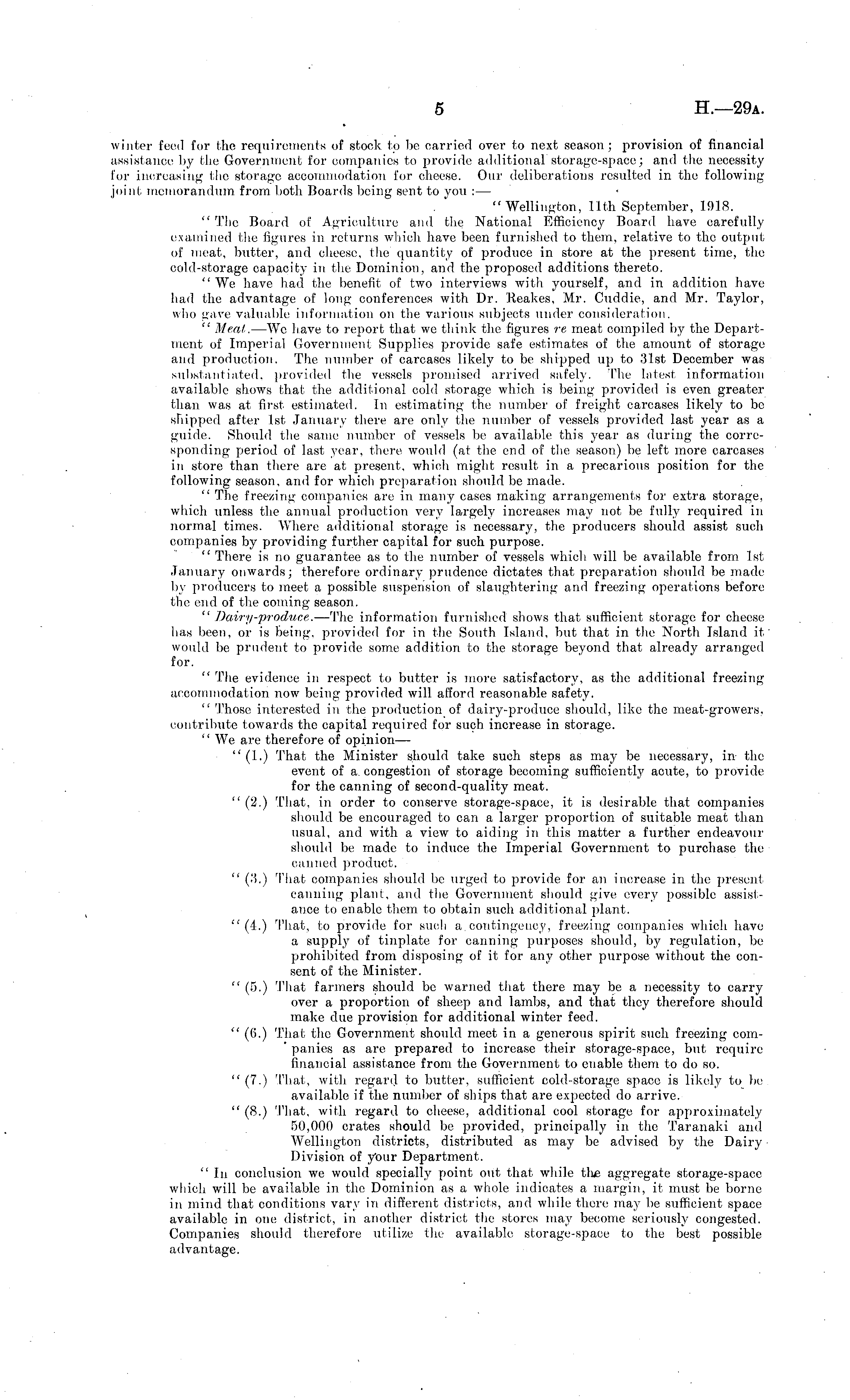 winter feed for the requirements of stock to be carried over to next season; provision of financial assistance by the Government for companies to provide additional storage-space; and the necessity for increasing the storage accommodation for cheese. Our deliberations resulted in the following joint memorandum from both Boards being sent to you : — "Wellington, 11th September, 1918. " The Board of Agriculture and the National Efficiency Board have carefully examined the figures in returns which have been furnished to them, relative to the output of meat, butter, and cheese, the quantity of produce in store at the present time, the cold-storage capacity in the Dominion, and the proposed additions thereto. "We have had the benefit of two interviews with yourself, and in addition have had the advantage of long conferences with Dr. Reakes, Mr. Cuddie, and Mr. Taylor, who gave valuable information on the various subjects under consideration. " Meal. —We have to report that we think the figures re meat compiled by the Department of Imperial Government Supplies provide safe estimates of the amount of storage and production. The number of carcases likely to be shipped up to 31st December was substantiated, provided the vessels promised arrived safely. The latest information available shows that the additional cold storage which is being provided is even greater than was at first estimated. In estimating the number of freight carcases likely to be shipped after Ist January there are only the number of vessels provided last year as a guide. Should the same number of vessels be available this year as during the corresponding period of last year, there would (at the end of the season) be left more carcases in store than there are at present, which might result in a precarious position for the following season, and for which preparation should be made. " The freezing companies are in many cases making arrangements for extra storage, which unless the annual production very largely increases may not be fully required in normal times. Where additional storage is necessary, the producers should assist such companies by providing further capital for such purpose. " There is no guarantee as to the number of vessels which will be available from Ist January onwards; therefore ordinary prudence dictates that preparation should be made by producers to meet a possible suspension of slaughtering and freezing operations before the end of the coming season. " Dairyrproduce. —The information furnished shows that sufficient storage for cheese has been, or is being, provided for in the South Island, but that in the North Island it would be prudent to provide some addition to the storage beyond that already arranged for. ' The evidence in respect to butter is more satisfactory, as the additional freezing accommodation now being provided will afford reasonable safety. " Those interested in the production of dairy-produce should, like the meat-growers, contribute towards the capital required for such increase in storage. " We are therefore of opinion— "(1.) That the Minister should take such steps as may be necessary, in- the event of a congestion of storage becoming sufficiently acute, to provide for the canning of second-quality meat. " (2.) That, in order to conserve storage-space, it is desirable that companies should be encouraged to can a larger proportion, of suitable meat than usual, and with a view to aiding in this matter a further endeavour should be made to induce the Imperial Government to purchase the canned product. " (■'!.) That companies should be urged to provide for an increase in the present canning plant, and the Government should give every possible assistance to enable them to obtain such additional plant. " (4.) That, to provide for such a contingency, freezing companies which have a supply of tinplate for canning purposes should, by regulation, be prohibited from disposing of it for any other purpose without the consent of the Minister. " (5.) That farmers should be warned that there may be a necessity to carry over a proportion of sheep and lambs, and that they therefore should make due provision for additional winter feed. " (6.) That the Government should meet in a generous spirit such freezing com- " panics as are prepared to increase their storage-space, but require financial assistance from the Government to enable them to do so. " (7.) That, with regard to butter, sufficient cold-storage space is likely to be available if the number of ships that are expected do arrive. " (8.) That, with regard to cheese, additional cool storage for approximately 50,000 crates should be provided, principally in the Taranaki and Wellington districts, distributed as may be advised by the Dairy Division of your Department. " In conclusion we would specially point out that while tli£ aggregate storage-space which will be available in the Dominion as a whole indicates a margin, it must be borne in mind that conditions vary in different districts, and while there may be sufficient spaceavailable in one district, in another district the stores may become seriously congested. Companies should therefore utilize the available storage-space to the best possible advantage.