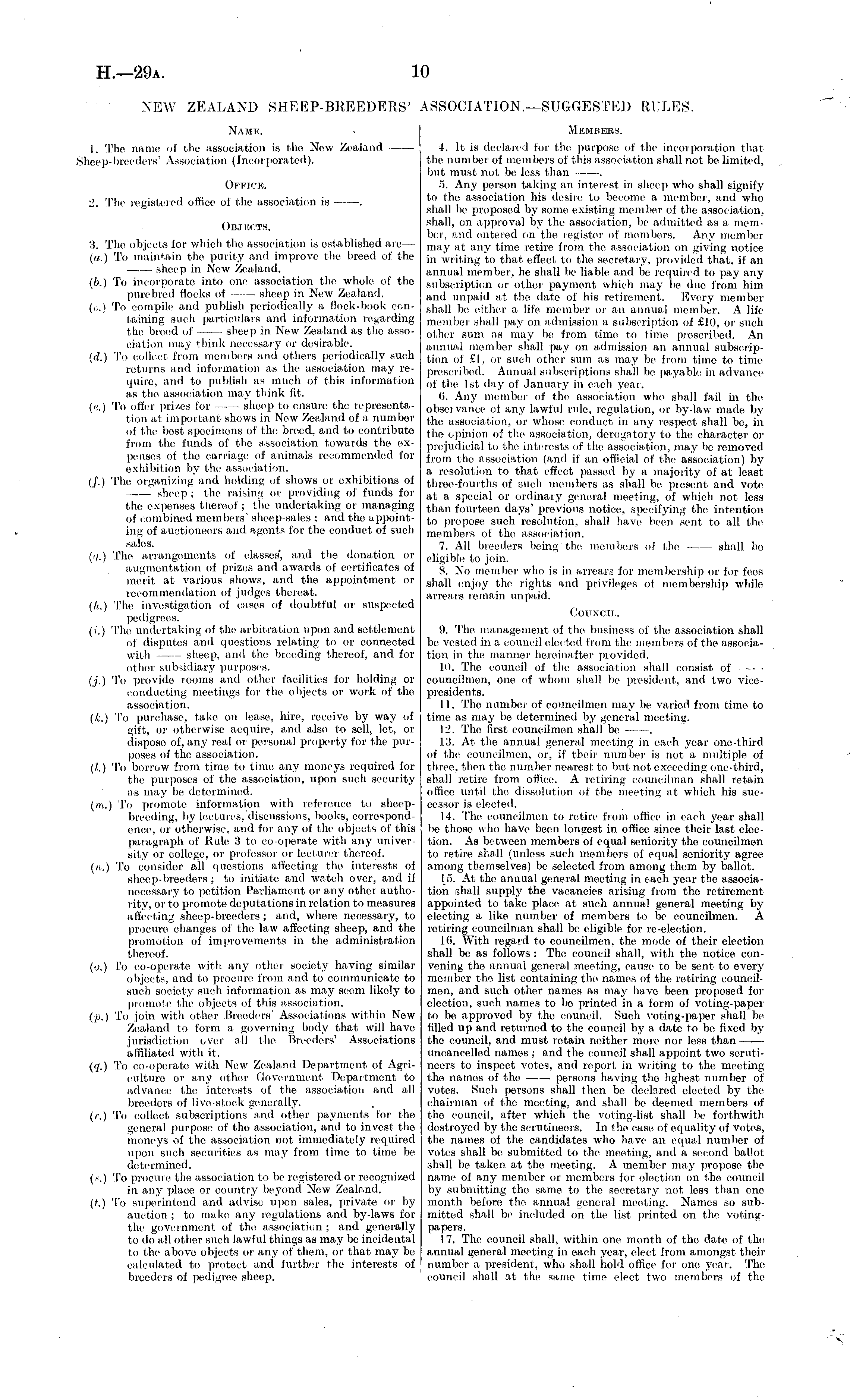 NEW ZEALAND SHEEP-BREEDERS' ASSOCIATION.—SUGGESTED RULES. Name. • .Members. 1. 'the name of the association is the Mew Zealand 4. It is declared for the purpose of the incorporation thai Sheep-breeders' Association (Incorporated). the number of members of this association shall not be limited, but must nut be less than . Office. 5. Any person taking an interest in sheep wtio shall signify 2 The registered office of the association is . to . * h ? association his 'desire to become a member, and who shall be proposed by some existing member 01 the association. Objects shall, on approval by the association, be admitted as a member, and entered on the register of members. Any member 3, The objects for Which the association is established are— may at any time retjre from tfa3 association on giving notice (a.) To maintain the purity and improve the breed of the in Writing to that effect to the secretary, provided that, if an sheep in Now Zealand. annual member, he shall be liable and be required to pay any (b.) To incorporate into one association the whole of the subscription or other payment which may be duo from him purebred flocks of sheep m New Zealand. an(l lm p ai( ] at t | lo ,i at( . 0 f his retirement. Every member (,;.) To compile and publish periodically a flock-book con- sna n_ be cither a life member or an annual member. A life taming such particulars and information regarding mem ber shall pay on admission a subscription of £10, or such the breed of —-- sheep m New Zealand as the asso- otner allm aB may be from time to time prescribed. An ciation may think necessary or desirable. annual member shall pay on admission an annual subscrip(<i) To collect from members and others periodically such tk)n ()f £L ,„. SU( . h nthey sum as may be fr()m timo to tim( , returns and information as the association may re- p reß 6ribed. Annual subscriptions shall be payable in advance quire, and to publish as much of this information of tne lst d ay of J anuary j n eac h year, as the, association may think fit. 0 Any member of the association who shall fail in the («.) To offer prizes for sheep to ensure the represent*- observance of any lawful rule, regulation, or by-law made by tion at important shows in New Zealand of a number the assoc i at i o n, or whose conduct in any respect shall be, in of the best specimens of the breed, and to contribute tne opm j on 0 f t he association, derogatory to the character or from the funds of the association towards the ex- prejudicial to the interests of the association, may be removed penses of the carriage of animals recommended lor from ~h o association (and if an official of the association) by exhibition by the association. a resolution to that effect passed by a majority of at least (/.) The organizing and holding of shows or exhibitions of three-fourths of such members as shall be present and vote — sheep ; the raising or providing of funds for at a sp( , ( . ial or ordinary general meeting, of which not less the expenses thereof ; the undertaking or managing than f ourt een days' previous notice, specifying the intention of combined members' sheep-sales; and the appoint- to propose such'resolution, shall have been sent to all tiding of auctioneers and agents for the conduct of such members of the association, sales. 7. All breeders being'the members of the shall bo (i/.) The arrangements of classes, and the donation or eligible to join. . augmentation of prizes and awards of certificates of 5. N() mem be,, who is in arrearg f or membership or for fees merit at various shows, and the appointment or shall enjoy the rights aml pr i v il egeg ot membership while recommendation of judges thereat, arrears remain unpaid. III.) The investigation of eases of doubtful or suspected pedigrees. ' (i.) The undertaking of the arbitration upon and settlement i). The management of the business of the association shall of disputes and questions relating to or connected be vested in a council elected from the members of the associawith sheep, and the breeding thereof, and for tion in the manner hereinafter provided, other subsidiary purposes. 10. The council of the association shall consist of (j.) To provide rooms and other facilities for holding or councilnien, one of whom shall be president, and two viceconducting meetings for the objects or work of the presidents, association. I I. The number of councilnien may be varied from time to (k.) To purchase, take on lease, hire, receive by way of time as may be determined by general meeting. gift, or otherwise acquire, and also to sell, let, or L 2. The first councilnien shall be . dispose of, any real or personal property for the pur- 13. At the annual general meeting in each year one-third poses of the association. of the councilnien, or, if their number is not a multiple of (I.) To borrow from time to time any moneys required for three, then the number nearest to but not exceeding one-third, the purposes of the association, upon such security shall retire from office. A retiring councilman shall retain as may be determined. office until the dissolution of the meeting at which his suc(m.) To promote information with reference to sheep- cesser is elected. breeding, by lectures, discussions, books, correspond- 14. The councilnien to retire from office in each year shall ence, or otherwise, and for any of the objects of this be those who have been longest in office since their last eleeparagraph of Hule 3to co-operate with any univer- tion. As between members of equal seniority the councilnien sity or college, or professor or lecturer thereof. to retire shall (unless such members of equal seniority agree (ft.) To consider all questions affecting the interests of among themselves) be selected from among them by ballot, sheep-breeders ; to initiate and watch over, and if 15. At the annual general meoting in each year the associanecessary to petition Parliament or any other autho- tion shall supply the vacancie
