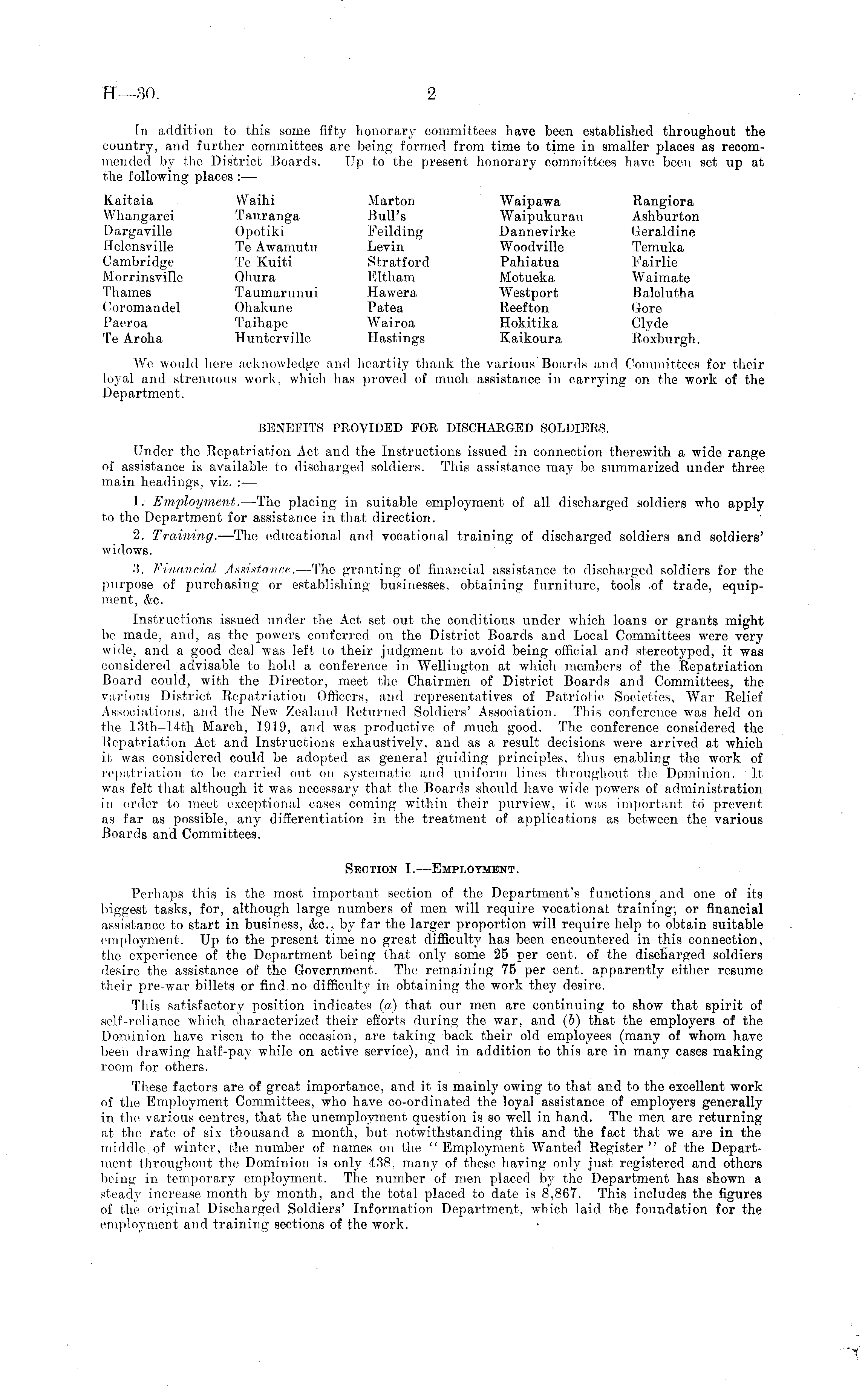 In addition to this some fifty honorary committees have been established throughout the country, and further committees are being formed from time to time in smaller places as recommended by the District Boards. Up to the present honorary committees have been set up at the following places : — Kaitaia Waihi Marton Waipawa Rangiora Whangarei Tauranga Bull's Waipukurau Ashburton Dargaville Opotiki Feilding Dannevirke Ceraldine Hclensville Te Awamutu Levin Woodville Temuka Cambridge Te Kuiti Stratford Pahiatua Fairlie Morrinsville Ohura Eltham Motueka Waimate Thames Taumarunui Hawera Westport Balclutha Coromandel Ohakune Patea Reefton Core Paeroa Taihape Wairoa Hokitika Clyde Te Aroha Hunterville Hastings Kaikoura Roxburgh. We would here acknowledge and heartily thank the various Boards and Committees for their loyal and strenuous work, which has proved of much assistance in carrying on the work of the Department. BENEFITS PROVIDED FOR DISCHARGED SOLDIERS. Under the Repatriation Act and the Instructions issued in connection therewith a wide range of assistance is available to discharged soldiers. This assistance may be summarized under three main headings, viz. : — 1. Employment. —The placing in suitable employment of all discharged soldiers who apply to the Department for assistance in that direction. 2. Training. —The educational and vocational training of discharged soldiers and soldiers' widows. '■). Financial Assistance. —The granting of financial assistance to discharged soldiers for the purpose of purchasing or establishing businesses, obtaining furniture, tools of trade, equipment, &c. Instructions issued under the Act set out the conditions under which loans or grants might be made, and, as the powers conferred on the District Boards and Local Committees were very wide, and a good deal was left to their judgment to avoid being official and stereotyped, it was considered advisable to hold a conference in Wellington at which members of the Repatriation Board could, with the Director, meet the Chairmen of District Boards and Committees, the various District Repatriation Officers, and representatives of Patriotic Societies, War Relief Associations, and the New Zealand Returned Soldiers' Association. This conference was held on the 13th-14th March, 1919, and was productive of much good. The conference considered the Repatriation Act and Instructions exhaustively, and as a result decisions were arrived at which it was considered could be adopted as general guiding principles, thus enabling the work of repatriation to be carried out on systematic and uniform lines throughout the Dominion. It was felt that although it was necessary that the Boards should have wide powers of administration in order to meet exceptional cases coming within their purview, it, was important to prevent as far as possible, any differentiation in the treatment of applications as between the various Boards and. Committees. Section I. —Employment. Perhaps this is the most important section of the Department's functions and one of its biggest tasks, for, although large numbers of men will require vocational training; or financial assistance to start in business, &c, by far the larger proportion will require help to obtain suitable employment. Up to the present time no great difficulty has been encountered in this connection, the experience of the Department being that only some 25 per cent, of the discharged soldiers desire the assistance of the Government. The remaining 75 per cent, apparently either resume their pre-war billets or find no difficulty in obtaining the work they desire. This satisfactory position indicates (a) that our men are continuing to show that spirit of self-reliance which characterized their efforts during the war, and (b) that the employers of the Dominion have risen to the occasion, are taking back, their old employees (many of whom have been drawing half-pay while on active service), and in addition to this are in many cases making room for others. These factors are of great importance, and it is mainly owing to that and to the excellent work of the Employment Committees, who have co-ordinated the loyal assistance of employers generally in the various centres, that the unemployment question is so well in hand. The men are returning at the rate of six thousand a month, but notwithstanding this and the fact that we are in the middle of winter, the number of names on the "Employment Wanted Register" of the Department throughout the Dominion is only 438, many of these having only just registered and others being in temporary employment. The number of men placed by the Department has shown a steady increase month by month, and the total placed to date is 8,867. This includes the figures of the original Discharged Soldiers' Information Department, which laid the foundation for the employment and training sections of the work, -