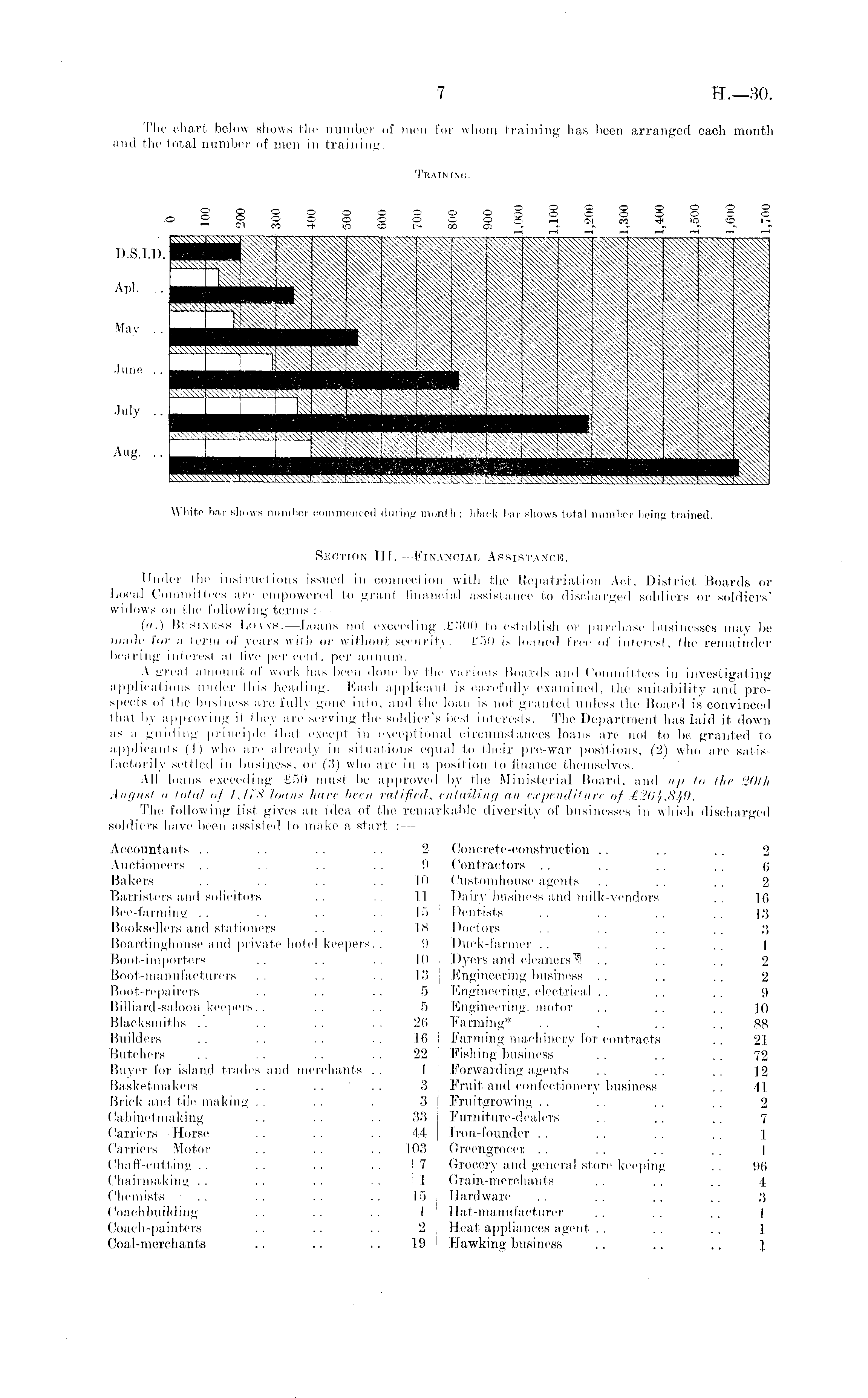 Section 111. —Financial Assistance. Under the instructions issued in connection with the Repatriation Act, District Boards or Local Committees are empowered to grant financial assistance to discharged soldiers or soldiers' widows on the following terms : — (a.) Business Loans. —Loans not exceeding £300 to establish or purchase businesses may be made for a term of years with or without security. £5(1 is loaned free of interest, the remainder bearing interest at live per cent, per annum. A great amount of work has beep done by the various Boards and Committees in investigating applications under this heading. Each applicant is carefully examined, the suitability and prospects of the business are fully gone into, and the loan is not granted unless the Board is convinced that by approving if they are serving the soldier's best interests. The Department has laid it down as a guiding principle that except in exceptional circumstances loans are not to be granted to applicants (1) who an- already in situations equal to their pre-war positions, (2) who are satisfactorily settled in business, or (3) who are in a position lo finance themselves. All loans exceeding £50 must be approved by the Ministerial Board, and up In the SO/h August a total of 1,178 loans have been ratified, entailing an expenditure of £.201,.81/9. The following list, gives an idea of the remarkable diversity of businesses in which discharged soldiers have been assisted to make a start :— Accountants . . . . .. . . 2 Concrete-construction .. . . . . 2 Auctioneers . . .. .. . . 9 Contractors . . . . . . .. 6 Bakers .. .. .. .. 10 Customhouse agents .. .. .. 2 Barristers and solicitors .. .. 11 Dairy business and milk-vendors .. 16 Bee-farming .. .. .. .. 15 I Dentists .. .. .. .. 13 Booksellers and stationers .. .. IH Doctors .. .. .. .. 3 Boardinghouse and private hotel keepers.. 9 Duck-farmer .. .. .. .. ] Boot-importers .. ~ .. 10 Dyers and cleaners"'? .. .. .. 2 Boot-manufacturers . . . . . . 13 Engineering business . . . . .. 2 Boot-repairers . . . . . . 5 Engineering, electrical . . . . . . i) Billiard-saloonkeepers.. .. .. 5 Engineering motor .. .. .. 10 Blacksmiths .". .. .. .. 26 Farming* .. .. .. 88 Builders .. .. .. .. 16 Farming machinery lor contracts .. 21 Butchers .. .. .. .. 22 | Fishing business .. .. .. 72 Buyer for island trades and merchants .. 1 | Forwarding agents .. .. .. |2 Basketmakers . . . . . . 3 Fruit and confectionery business . . 41 Brick and tile making . . .. . . 3 Fruitgrowing . . . . . , ~ 2 Cabinetmaking .. .. . . 33 Furniture-dealers . . . . . . 7 Carriers Horse . . . . .. 44 Iron-founder . . .. . . . . 1 Carriers Motor . . .. . . 103 Greengrocer: . . . . . . .. ] Chaff-cutting .. .. .. .. |7 Grocery and general store keeping .. 96 Chairmaking . . . . . . . . ' 1 Grain-merchants . . . . . . 4 Chemists •.. .. .. .. 15 Hardware .. .. .. .. 3 Coachbuilding .. .. .. 1 Hat-manufacturer .. .. .. 1 Coach-painters .. .. .. 2 j Heat appliances agent .. .. .. 1 Coal-merchants .. .. ~ 19 > Hawking business .. .. .. 1