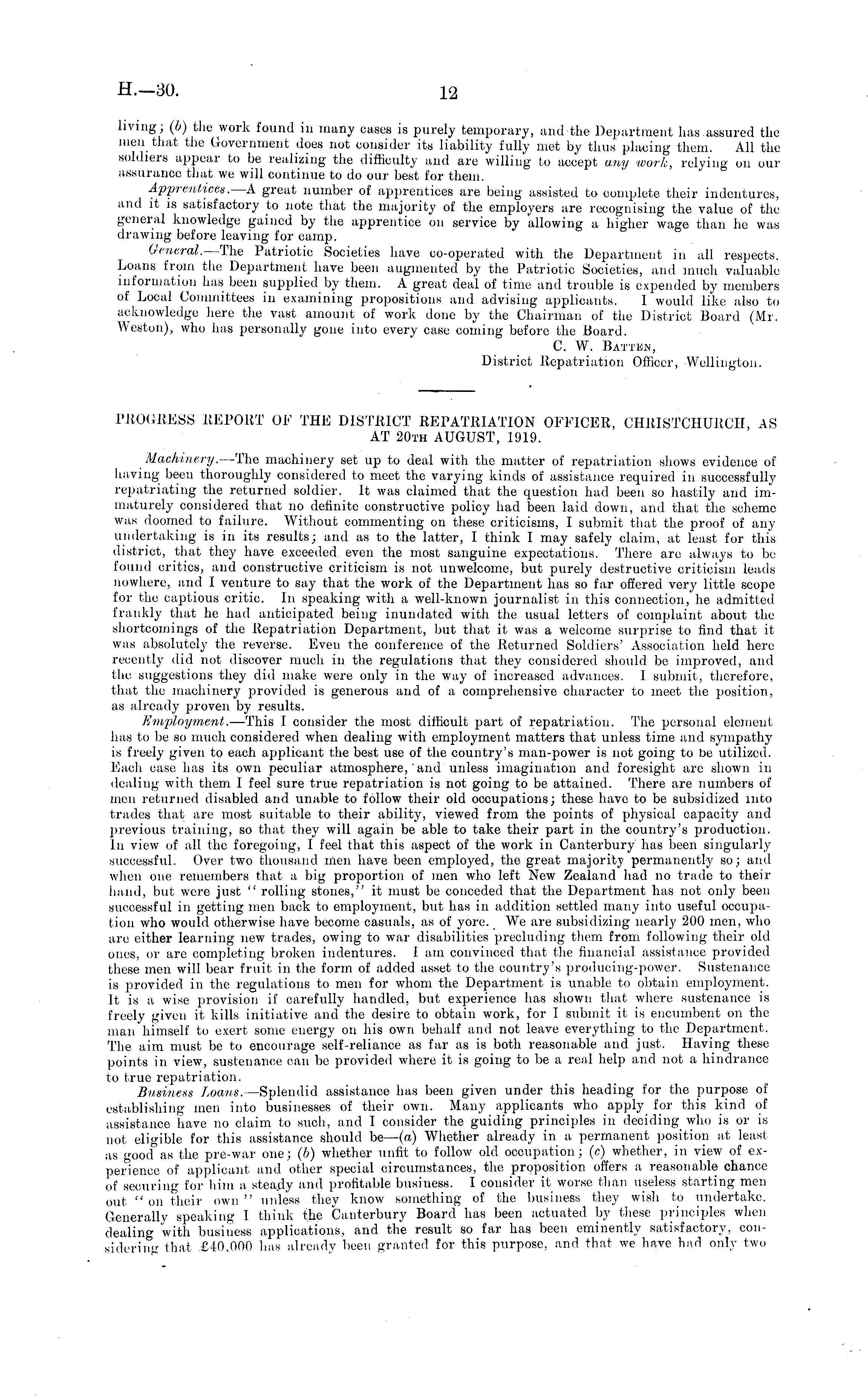 living; (b) the work found in many cases is purely temporary, and the Department has assured the men that the Government does not consider its liability fully met by thus placing them. All the soldiers appear to be realizing the difficulty and are willing to accept any work, relying on our assurance that we will continue to do our best for them. Apprentices .—A great number of apprentices are being assisted to complete their indentures, and it is satisfactory to note that the majority of the employers are recognising the value of the general knowledge gained by the apprentice on service by allowing a higher wage than he was drawing before leaving for camp. General. —The Patriotic Societies have co-operated with the Department in all respects. Loans from the Department have been augmented by the Patriotic Societies, and much valuable information has been supplied by them. A great deal of time and trouble is expended by members of Local Committees in examining propositions and advising applicants. I would like also to acknowledge here the vast amount of work done by the Chairman of the District Board (Mr. Weston), who has personally gone into every case coming before the Board. C. W. Batten, District Repatriation Officer, Wellington. PROGRESS REPORT OF THE DISTRICT REPATRIATION OFFICER, CHRISTCHURCH, AS AT 20th AUGUST, 1919. Machinery. —The machinery set up to deal with the matter of repatriation shows evidence of having been thoroughly considered to meet the varying kinds of assistance required in successfully repatriating the returned soldier. It was claimed that the question had been so hastily and immaturely considered that no definite constructive policy had been laid down, and that the scheme was doomed to failure. Without commenting on these criticisms, I submit that the proof of any undertaking is in its results; and as to the latter, I think I may safely claim, at least for this district, that they have exceeded even the most sanguine expectations. There are always to be found critics, and constructive criticism is not unwelcome, but purely destructive criticism leads nowhere, and I venture to say that the work of the Department has so far offered very little scope for the captious critic. In speaking with a well-known journalist in this connection, he admitted frankly that he had anticipated being inundated with the usual letters of complaint about the shortcomings of the Repatriation Department, but that it was a welcome surprise to find that it was absolutely the reverse. Even the conference of the Returned Soldiers' Association held here recently did not discover much in the regulations that they considered should be improved, and the suggestions they did make were only in the way of increased advances. I submit, therefore, that the machinery provided is generous and of a comprehensive character to meet the position, as already proven by results. Employment. —This I consider the most difficult part of repatriation. The personal element has to be so much considered when dealing with employment matters that unless time and sympathy is freely given to each applicant the best use of the country's man-power is not going to be utilized. Each case has its own peculiar atmosphere,'and unless imagination and foresight are shown in dealing with them I feel sure true repatriation is not going to be attained. There are numbers of men returned disabled and unable to follow their old occupations; these have to be subsidized into trades that are most suitable to their ability, viewed from the points of physical capacity and previous training, so that they will again be able to take their part in the country's production. In view of all the foregoing, I feel that this aspect of the work in Canterbury has been singularly successful. Over two thousand men have been employed, the great majority permanently so; and when one remembers that a big proportion of men who left New Zealand had no trade to their hand, but were just " rolling stones," it must be conceded that the Department has not only been successful in getting men back to employment, but has in addition settled many into useful occupation who would otherwise have become casuals, as of yore. We are subsidizing nearly 200 men, who are either learning new trades, owing to war disabilities precluding them from following their old ones, or are completing broken indentures. lam convinced that the financial assistance provided these men will bear fruit in the form of added asset to the country's producing-power. Sustenance is provided in the regulations to men for whom the Department is unable to obtain employment. It is a wise provision if carefully handled, but experience has shown that where sustenance is freely given it kills initiative and the desire to obtain work, for I submit it is encumbent on the man himself to exert some euergy on his own behalf and not leave everything to the Department. The aim must be to encourage self-reliance as far as is both reasonable and just. Having these points in view, sustenance can be provided where it is going to be a real help and not a hindrance to true repatriation. Business Loans. —Splendid assistance has been given under this heading for the purpose of establishing men into businesses of their own. Many applicants who apply for this kind of assistance have no claim to such, and I consider the guiding principles in deciding who is or is not eligible for this assistance should be—(a) Whether already in a permanent position at least as good as the pre-war one; (b) whether unfit to follow old occupation; (c) whether, in view of experience of applicant and other special circumstances, the proposition offers a reasonable chance of securing for him a stea.dy and profitable business. I consider it worse than useless starting men out "on their own" unless they know something of the, business they wish to undertake. Generally speaking I think the Canterbury Board has been actuated by these pri