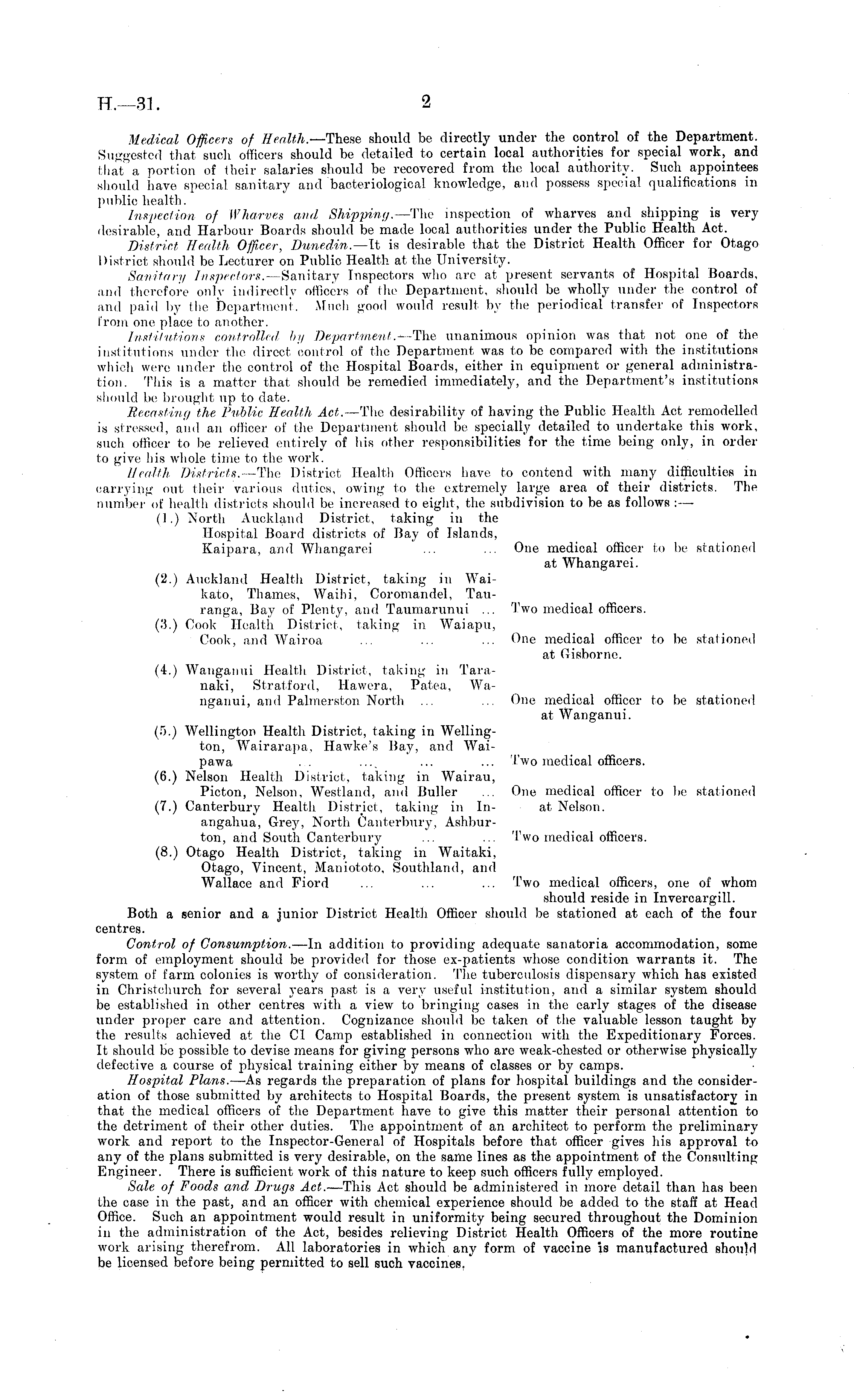 Medical Officers of Health. —These should be directly under the control of the Department. Suggested that such officers should be detailed to certain local authorities for special work, and that a portion of their salaries should be recovered from the local authority. Such appointees should have special sanitary and "baoteriological knowledge, and possess special qualifications in public health. Inspection of Wharves and Shipping. —The inspection of wharves and shipping is very desirable, and Harbour Boards should be made local authorities under the Public Health Act. District Health Officer, Dunedin.— -It is desirable that the District Health Officer for Otago District should be Lecturer on Public Health at the University. Sanitary Inspectors. —Sanitary Inspectors who arc at present servants of Hospital Boards, and therefore only indirectly officers of the Department, should be wholly under the control of and paid by the Department. Much good would result by the periodical transfer of Inspectors from one place to another. Institutions controlled by Department. --The unanimous opinion was that not one of the institutions under the direct control of the Department was to be compared with the institutions which were under the control of the Hospital Boards, either in equipment or general administration. This is a matter that should be remedied immediately, and the Department's institutions should be brought up to date. Recasting the Public Health Act. —The desirability of having the Public Health Act remodelled is stressed, and an officer of the Department should be specially detailed to undertake this work, such officer to be relieved entirely of his other responsibilities for the time being only, in order to give his whole time to the work. Health, Districts. —The District Health Officers have to contend with many difficulties in carrying out their various duties, owing to the extremely large area of their districts. The number of health districts should be increased to eight, the subdivision to be as follows : —■ (1.) North Auckland District, taking in the Hospital Board districts of Bay of Islands, Kaipara, and Whangarei ... ... One medical officer to be stationed at Whangarei. (2.) Auckland Health District, taking in Waikato, Thames, Waihi, Coromandel, Tauranga, Bay of Plenty, and Taumarunui ... Two medical officers. (3.) Cook Health District, taking in Waiapu, Cook, and Wairoa ... ... ... One medical officer to be stationed at Gisborne. (4.) Wanganui Health District, taking in Taranaki, Stratford, Hawera, Patea, Wanganui, and Palmerston North ... ... One medical officer to be stationed at Wanganui. (5.) Wellington Health District, taking in Wellington, Wairarapa, Hawke's Bay, and Waipawa .... .... ... ... Two medical officers. (6.) Nelson Health District, taking in Wairau, Picton, Nelson, Westland, and Buller ... One medical officer to be stationed (7.) Canterbury Health District, taking in In- at Nelson, angahua, Grey, North Canterbury, Ashburton, and South Canterbury ... ... Two medical officers. (8.) Otago Health District, taking in Waitaki, Otago, Vincent, Maniototo, Southland, and Wallace and Fiord ... ... ... Two medical officers, one of whom should reside in lnvercargill. Both a senior and a junior District Health Officer should be stationed at each of the four centres. Control of Consumption. —ln addition to providing adequate sanatoria accommodation, some form of employment should be provided for those ex-patients whose condition warrants it. The system of farm colonies is worthy of consideration. The tuberculosis dispensary which has existed in Christchurch for several years past is a very useful institution, and a similar system should be established in other centres with a view to bringing cases in the early stages of the disease under proper care and attention. Cognizance should be taken of the valuable lesson taught by the results achieved at the Cl Camp established in connection with the Expeditionary Forces. It should be possible to devise means for giving persons who arc weak-chested or otherwise physically defective a course of physical training either by means of classes or by camps. Hospital Plans. —-As regards the preparation of plans for hospital buildings and the consideration of those submitted by architects to Hospital Boards, the present system is unsatisfactory in that the medical officers of the Department have to give this matter their personal attention to the detriment of their other duties. The appointment of an architect to perform the preliminary work and report to the Inspector-General of Hospitals before that officer gives his approval to any of the plans submitted is very desirable, on the same lines as the appointment of the Consulting Engineer. There is sufficient work of this nature to keep such officers fully employed. Sale of Foods and Drugs Act. —This Act, should be administered in more detail than has been the case in the past, and an officer with chemical experience should be added to the staff at Head Office. Such an appointment would result in uniformity being secured throughout the Dominion in the administration of the Act, besides relieving District Health Officers of the more routine work arising therefrom. All laboratories in which any form of vaccine is manufactured should be licensed before being permitted to sell such vaccines.