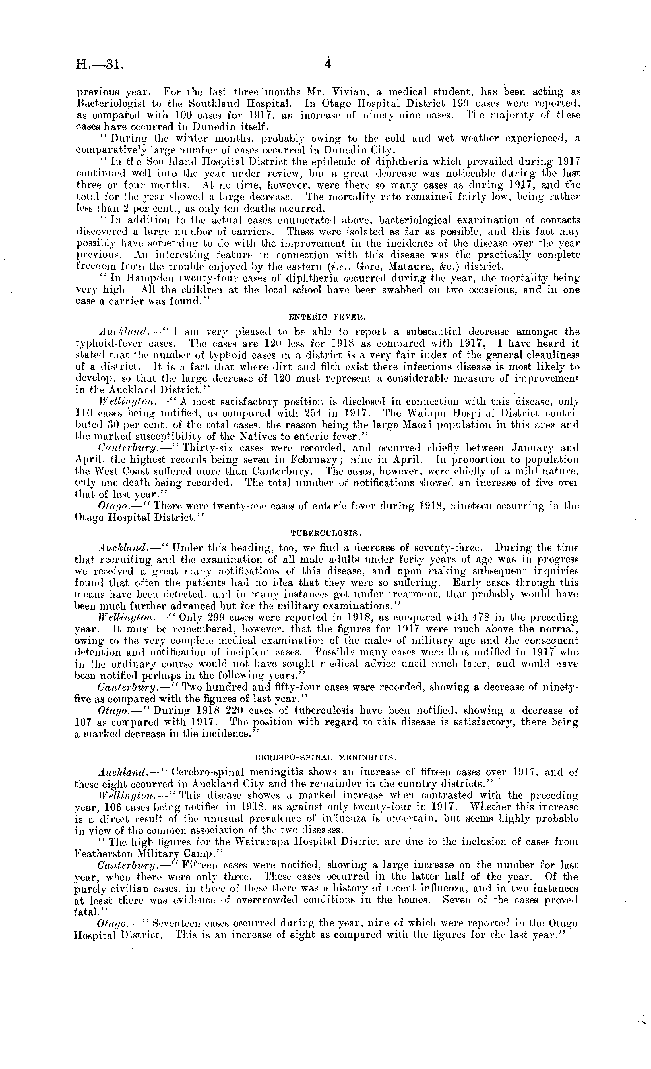 previous year. For the last three months Mr. Vivian, a medical student, has been acting as Bacteriologist to the Southland Hospital. In Otago Hospital District 199 eases were reported, as compared with 100 cases for 1917, an increase of ninety-nine cases. The majority of these cases have occurred in Dunedin itself. " During the winter months, probably owing to the. cold and wet weather experienced, a comparatively large number of cases occurred in Dunedin City. " In the Southland Hospital District the epidemic of diphtheria which prevailed during 1917 continued well into the year under review, but a great decrease was noticeable during the last three or four months. At no time, however, were there so many cases as during 1917, and the total for the j'ear showed a large decrease. The mortality rate remained fairly low, being rather less than 2 per cent., as only ten deaths occurred. " In addition to the actual cases enumerated above, bacteriological examination of contacts discovered a large number of carriers. These were isolated as far as possible, and this fact may possibly have something to do with the improvement in the incidence of the disease over the year previous. An interesting feature in connection with this disease was the practically complete freedom from the trouble enjoyed by the eastern (i.e., Gore, Mataura, cVc.) district. " In Hampden twenty-four cases of diphtheria occurred during the year, the mortality being very high. All the children at the local school have been swabbed on two occasions, and in one case a carrier was found." ENTERIC FEVEH. Auckland. —" I am very pleased to be able to report a substantial decrease amongst the typhoid-fever cases. The cases are 120 less for 1918 as compared with 1917, I have heard it stated that the number of typhoid cases in a district is a very fair index of the general cleanliness of a district. It is a fact that where dirt and filth exist there infectious disease is most likely to develop, so that the large decrease of 120 must represent a considerable measure of improvement in the Auckland District." Wellington. — "A most satisfactory position is disclosed in connection with this disease, only 110 eases being notified, as compared with 254 in 1917. The Waiapu Hospital District contributed 30 per cent, of the total cases, the reason being the large Maori population in this area and the marked susceptibility of the Natives to enteric fever." Canterbury. —"Thirty-six cases were recorded, and occurred ohiefly between January and April, the highest records being seven in February; nine in April. In proportion to population the West Coast- suffered more than Canterbury. The cases, however, were chiefly of a mild nature, only one death being recorded. The total number of notifications showed an increase of five over that of last year." Otago. —" There were twenty-one cases of enteric fever during 1918, nineteen occurring in the Otago Hospital District." TUBERCULOSIS. Auckland. —" Under this heading, too, we find a decrease of seventy-three. During the time that recruiting and the examination of all male adults under forty years of age was in progress we received a great many notifications of this disease, and upon making subsequent inquiries found that often the patients had no idea that they were so suffering. Early cases through this means have been detected, and in many instances got under treatment, that probably would have been much further advanced but for the military examinations." Wellington. —" Only 299 cases were reported in 1918, as compared with 478 in the preceding year. It must be remembered, however, that the figures for 1917 were much above the normal, owing to the very complete medical examination of the males of military age and the consequent detention and notification of incipient cases. Possibly many cases were thus notified in 1917 who in the ordinary course would not have sought medical advice until much later, and would have been notified perhaps in the following years." Canterbury. —" Two hundred and fifty-four cases were recorded, showing a decrease of ninetyfive as compared with the figures of last year." Otago. —" During 1918 220 cases of tuberculosis have been notified, showing a decrease of 107 as compared with 1917. The position with regard to this disease is satisfactory, there being a marked decrease in the incidence." CEREHRO-SPINAL MENINGITIS. Auckland. —" Cerebrospinal meningitis shows an increase of fifteen cases over 1917, and of these eight occurred in Auckland City and the remainder in the country districts." Wellington. —" This disease showes a marked increase when contrasted with the preceding year, 106 cases being notified in 1918, as against only twenty-four in 1917. Whether this increase is a direct result of the unusual prevalence of influenza is uncertain, but seems highly probable in view of the common association of the two diseases. " The high figures for the Wairarapa Hospital District are due to the inclusion of cases from Featherston Military Camp." Canterbury. —"Fifteen cases were notified, showing a large increase on the number for last year, when there were only three. These cases occurred in the latter half of the year. Of the purely civilian cases, in three of these there was a history of recent influenza, and in two instances at least there was evidence of overcrowded conditions in the homes. Seven of the cases proved fatal." Otago.---" Seventeen cases occurred during the year, vine of which were reported in the Otago Hospital District. Tin's is an increase of eight as compared with the figures for the last year."