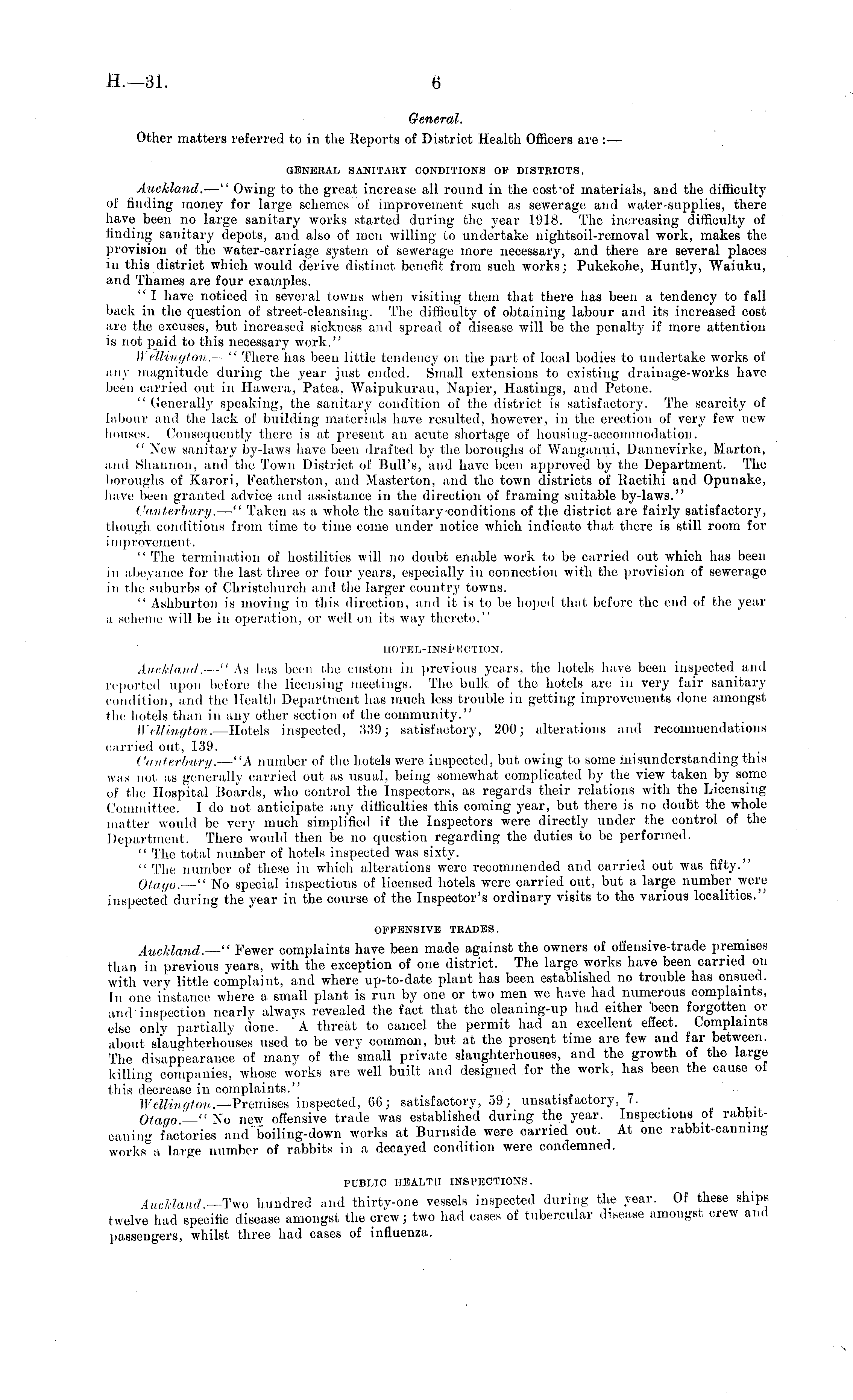 General. Other matters referred to in the Reports of District Health Officers are :— GENERAL SANITARY CONDITIONS OF DISTRICTS. Auckland. —" Owing to the great increase all round in the cost "of materials, and the difficulty of finding money for large schemes of improvement such as sewerage and water-supplies, there have been no large sanitary works started during the year 1918. The increasing difficulty of finding sanitary depots, and also of men willing to undertake nightsoil-removal work, makes the provision of the water-carriage system of sewerage more necessary, and there are several places in this district which would derive distinct benefit from such works; Pukekohe, Huntly, Waiuku, and Thames are four examples. " I have noticed in several towns when visiting them that there has been a tendency to fall back in the question of street-cleansing. The difficulty of obtaining labour and its increased cost are the excuses, but increased sickness and spread of disease will be the penalty if more attention is not paid to this necessary work." Wellington. —" There has been little tendency on the part of local bodies to undertake works of any magnitude during the year just ended. Small extensions to existing drainage-works have been carried out in Hawera, Patea, Waipukurau, Napier, Hastings, and Petone. " Generally speaking, the sanitary condition of the district is satisfactory. The scarcity of labour aud the lack of building materials have resulted, however, in the erection of very few new houses. Consequently there is at present an acute shortage of housing-accommodation. " New sanitary by-laws have been drafted by the boroughs of Wanganui, Dannevirke, Marton, and Shannon, and the Town District of Bull's, and have been approved by the Department. The boroughs of Karori, Featherston, and Masterton, and the town districts of Raetihi and Opunake, have been granted advice and assistance in the direction of framing suitable by-laws." Canterbury. —" Taken as a whole the sanitary-conditions of the district are fairly satisfactory, though conditions from time to time come under notice which indicate that there is still room for improvement. " The termination of hostilities will no doubt enable work to be carried out which has been in abeyance for the last three or four years, especially in connection with the provision of sewerage in the suburbs of Christchurch and the larger country towns. " Ashburton is moving in this direction, and it is to be hoped that before the end of the year a scheme will be in operation, or well on its way thereto." HOTEL-INSPECTION. Auckland.—" As has been the custom in previous years, the hotels have been inspected and reported upon before the licensing meetings. The bulk of the hotels are in very fair sanitary condition, and the Health Department has much less trouble in getting improvements done amongst the hotels than in any other section of the community." Wellington. —Hotels inspected, 339; satisfactory, 200; alterations and recommendations carried out, 139. Canterbury. —"A number of the hotels were inspected, but owing to some misunderstanding this was not as generally carried out as usual, being somewhat complicated by the view taken by some of the Hospital Boards, who control the Inspectors, as regards their relations with the Licensing Committee. Ido not anticipate any difficulties this coming year, but there is no doubt the whole matter would be very much simplified if the Inspectors were directly under the control of the Department. There would then be no question regarding the duties to be performed. " The total number of hotels inspected was sixty. " The number of these in which alterations were recommended and carried out was fifty." Otago.—" No special inspections of licensed hotels were carried out, but a large number were inspected during the year in the course of the Inspector's ordinary visits to the various localities." OFFENSIVE TRADES. Auckland. —" Fewer complaints have been made against the owners of offensive-trade premises than in previous years, with the exception of one district. The large works have been carried on with very little complaint, and where up-to-date plant has been established no trouble has ensued. In one instance where a small plant is run by one or two men we have had numerous complaints, and inspection nearly always revealed the fact that the cleaning-up had either 'been forgotten or else only partially done. A threat to cancel the permit had an excellent effect. Complaints about slaughterhouses used to be very common, but at the present time are few and far between. The disappearance of many of the small private slaughterhouses, and the growth of the large killing companies, whose works are well built and designed for the work, has been the cause of this decrease in complaints." Wellington.— Premises inspected, 66; satisfactory, 59; unsatisfactory, 7. Otago'.—" No new offensive trade was established during the year. Inspections oi rabbitcaning factories and "boiling-down works at Burnside were carried out. At one rabbit-canning works a large number of rabbits in a decayed condition were condemned. PUBLIC HEALTH INSPECTIONS. Auckland.— Two hundred and thirty-one vessels inspected during the year. Of these ships twelve had specific disease amongst the crew; two hail cases of tubercular disease amongst crew and passengers, whilst three had cases of influenza.