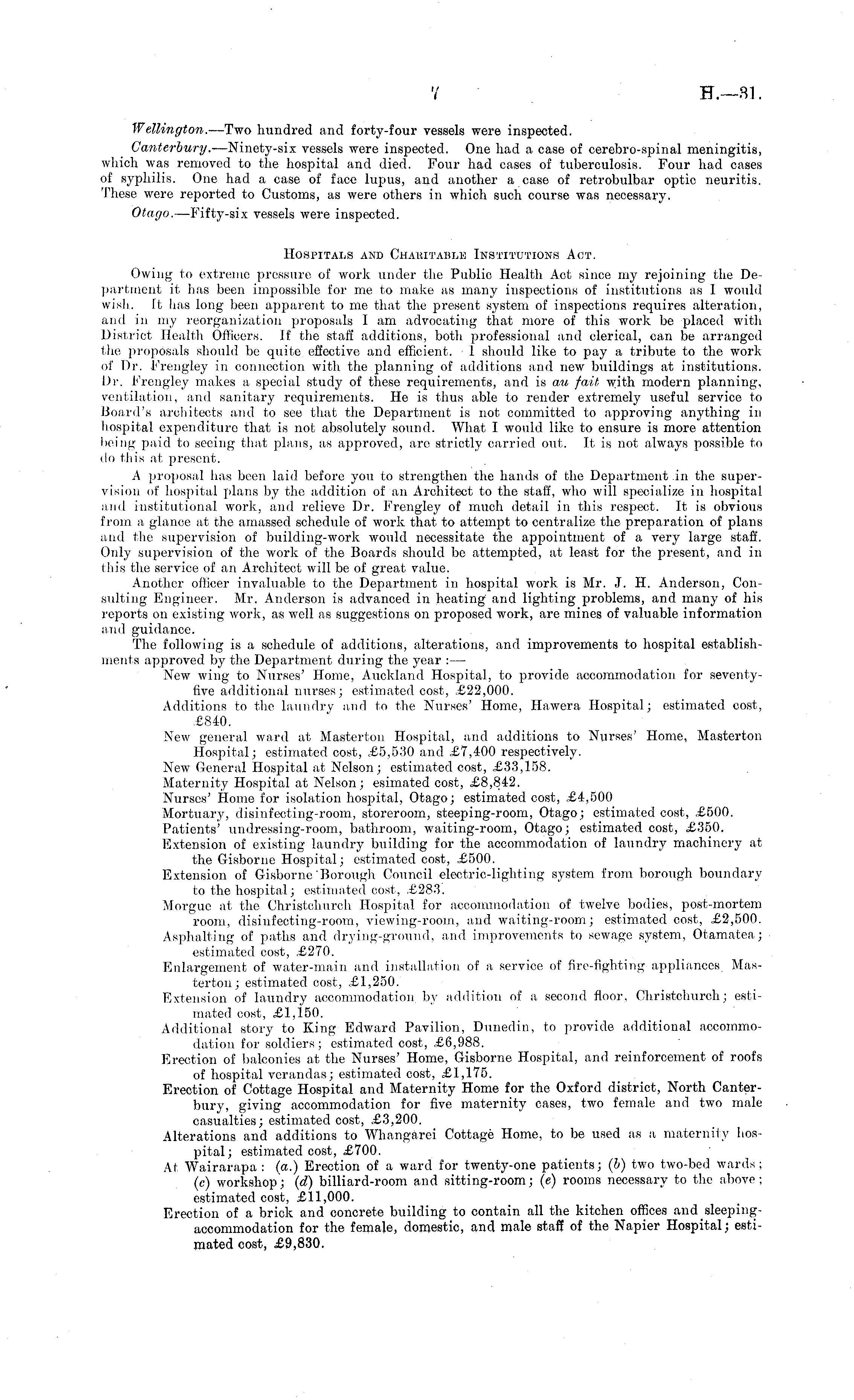 Wellington. —Two hundred and forty-four vessels were inspected. Canterbury. —Ninety-six vessels were inspected. One had a case of cerebro-spinal meningitis, which was removed to the hospital and died. Four had cases of tuberculosis. Four had cases of syphilis. One had a case of face lupus, and another a case of retrobulbar optic neuritis. These were reported to Customs, as were others in which such course was necessary. Otago. —Fifty-six vessels were inspected. Hospitals and Charitable Institutions Act. Owing to extreme pressure of work under the Public Health Act since my rejoining the De partment it has been impossible for me to make as many inspections of institutions as 1 would wish. It has long been apparent to me that the present system of inspections requires alteration, and in my reorganization proposals I am advocating that more of this work be placed with District Health Officers. If the staff additions, both professional and clerical, can be arranged the proposals should be quite effective and efficient. 1 should like to pay a tribute to the work of Dr. Frengley in connection with the planning of additions and new buildings at institutions. Dr. Frengley makes a special study of these requirements, and is au fait with modern planning, ventilation, and sanitary requirements. He is thus able to render extremely useful service to Board's architects and to see that the Department is not committed to approving anything in hospital expenditure that is not absolutely sound. What I would like to ensure is more attention being paid to seeing that plans, as approved, are strictly carried out. It is not always possible to do this at present. A proposal has been laid before you to strengthen the hands of the Department in the supervision of hospital plans by the addition of an Architect to the staff, who will specialize in hospital and institutional work, and relieve Dr. Frengley of much detail in this respect. It is obvious from a glance at the amassed schedule of work that to attempt to centralize the preparation of plans and the supervision of building-work would necessitate the appointment of a very large staff. Only supervision of the work of the Boards should be attempted, at least for the present, and in this the service of an Architect will be of great value. Another officer invaluable to the Department in hospital work is Mr. J. H. Anderson, Consulting Engineer. Mr. Anderson is advanced in heating and lighting problems, and many of his reports on existing work, as well as suggestions on proposed work, are mines of valuable information and guidance. The following is a schedule of additions, alterations, and improvements to hospital establishments approved by the Department during the year : — New wing to Nurses' Home, Auckland Hospital, to provide accommodation for seventyfive additional nurses; estimated cost, £22,000. Additions to the laundry and to the Nurses' Home, Hawera Hospital; estimated cost, £840. New general ward at Masterton Hospital, and additions to Nurses' Home, Masterton Hospital; estimated cost, £5,530 and £7,400 respectively. New General Hospital at Nelson; estimated cost, £33,158. Maternity Hospital at Nelson; esimated cost, £8,842. Nurses' Home for isolation hospital, Otago; estimated cost, £4,500 Mortuary, disinfecting-room, storeroom, steeping-room, Otago; estimated cost, £500. Patients' undressing-room, bathroom, waiting-room, Otago; estimated cost, £350. Extension of existing laundry building for the accommodation of laundry machinery at the Gisborne Hospital; estimated cost, £500. Extension of Gisborne'Borough Council electric-lighting system from borough boundary to the hospital; estimated cost, £283. Morgue at the Christchurch Hospital for accommodation of twelve bodies, post-mortem room, disinfecting-room, yiewing-room, and waiting-room; estimated cost, £2,500. Asphalting of paths and drying-ground, and improvements to sewage system, Otamatea; estimated cost, £270. Enlargement of water-main and installation of a service of fire-fighting appliances Masterton; estimated cost, £1,250. Extension of laundry accommodation by addition of a second floor, Christchurch; estimated cost, £1,150. Additional story to King Edward Pavilion, Dunedin, to provide additional accommodation for soldiers; estimated cost, £6,988. Erection of balconies at the Nurses' Home, Gisborne Hospital, and reinforcement of roofs of hospital verandas; estimated cost, £1,175. Erection of Cottage Hospital and Maternity Home for the Oxford district, North Canterbury, giving accommodation for five maternity cases, two female and two male casualties; estimated cost, £3,200. Alterations and additions to Whangarei Cottage Home, to be used as a maternity hospital; estimated cost, £700. At. Wairarapa : (o.) Erection of a ward for twenty-one patients; (b) two two-bed wards; (c) workshop; (d) billiard-room and sitting-room; (c) rooms necessary to the above; estimated cost, £11,000. Erection of a brick and concrete building to contain all the kitchen offices andsleepingaccommodation for the female, domestic, and male staff of the Napier Hospital; estimated cost, £9,830.