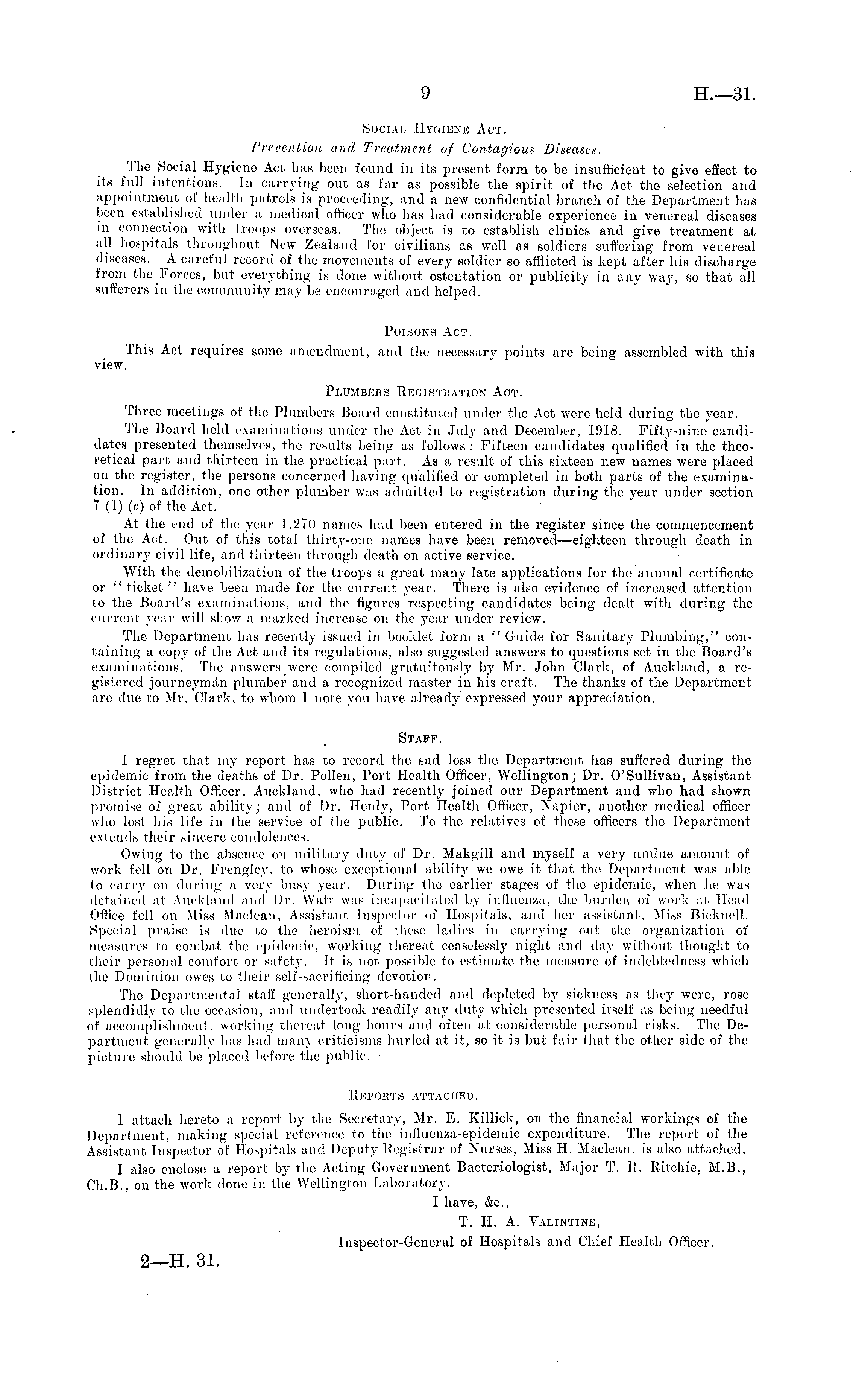 Social Hygiene Act. Prevention and Treatment of Contagious Diseases. The Social Hygiene Act has been found in its present form to be insufficient to give effect to its full intentions. In carrying out as far as possible the spirit of the Act the selection and appointment of health patrols is proceeding, and a new confidential branch of the Department has been established under a medical officer who has had considerable experience in venereal diseases in connection with troops overseas. The object is to establish clinics and give treatment at all hospitals throughout New Zealand for civilians as well as soldiers suffering from venereal diseases. A careful record of the movements of every soldier so afflicted is kept after his discharge from the Forces, but everything is done without ostentation or publicity in any way, so that all sufferers in the community may be encouraged and helped. Poisons Act. This Act requires some amendment, and the necessary points are being assembled with this view. Plumbers Registration Act. Three meetings of the Plumbers Board constituted under the Act were held during the year. The Board held examinations under the Act in July and December, 1918. Fifty-nine candidates presented themselves, the results being as follows : Fifteen candidates qualified in the theoretical part and thirteen in the practical part. As a result of this sixteen new names were placed on the register, the persons concerned having qualified or completed in both parts of the examination. In addition, one other plumber was admitted to registration during the year under section 7(1) (c) of the Act. At the end of the year 1,270 names had been entered in the register since the commencement of the Act. Out of this total thirty-one names have been removed —eighteen through death in ordinary civil life, and thirteen through death on active service. With the demobilization of the troops a great many late applications for the annual certificate or " ticket " have been made for the current year. There is also evidence of increased attention to the Board's examinations, and the figures respecting candidates being dealt with during the current year will show a marked increase on the year under review. The Department has recently issued in booklet form a " Guide for Sanitary Plumbing," containing a copy of the Act and its regulations, also suggested answers to questions set in the Board's examinations. The answers were compiled gratuitously by Mr. John Clark, of Auckland, a registered journeyman plumber and a recognized master in his craft. The thanks of the Department are clue to Mr. Clark, to whom I note you have already expressed your appreciation. Staff. I regret that my report has to record the sad loss the Department has suffered during the epidemic from the deaths of Dr. Pollen, Port Health Officer, Wellington; Dr. O'Sullivan, Assistant District Health Officer, Auckland, who had recently joined our Department and who had shown promise of great ability; and of Dr. Henly, Port Health Officer, Napier, another medical officer who lost his life in the service of the public. To the relatives of these officers the Department extends their sincere condolences. Owing to the absence on military duty of Dr. Makgill and myself a very undue amount of work fell on Dr. Frengley, to whose exceptional ability we owe it that the Department was able to carry on during a very busy year. During the earlier stages of the epidemic, when be was detained at Auckland and Dr. Watt was incapacitated by influenza, the burden of work at Head Office fell on Miss Maclean, Assistant Inspector of Hospitals, and her assistant. Miss Bicknell. Special praise is due to the. heroism of these ladies in carrying out the organization of measures to combat the epidemic, working thereat ceaselessly night and day without thought to their personal comfort or safety. It is not possible to estimate the measure of indebtedness which the Dominion owes to their self-sacrificing devotion. The Departmental staff generally, short-handed and depleted by sickness as they were, rose splendidly to the occasion, and undertook readily any duty which presented itself as being needful of accomplishment, working thereat long hours and often at considerable personal risks. The Department generally has had many criticisms hurled at it, so it is but fair that the other side of the picture should be placed before the public. Reports attached. I attach hereto a report by the Secretary, Mr. E. Killick, on the financial workings of the Department, making special reference to the influenza-epidemic expenditure. The report of the Assistant Inspector of Hospitals and Deputy Registrar of Nurses, Miss H. Maclean, is also attached. I also enclose a report by the Acting Government Bacteriologist, Major T. R. Ritchie, M.8., Ch.B., on the work done in the Wellington Laboratory. I have, &c., T. H. A. Valintine, Inspector-General of Hospitals and Chief Health Officer.