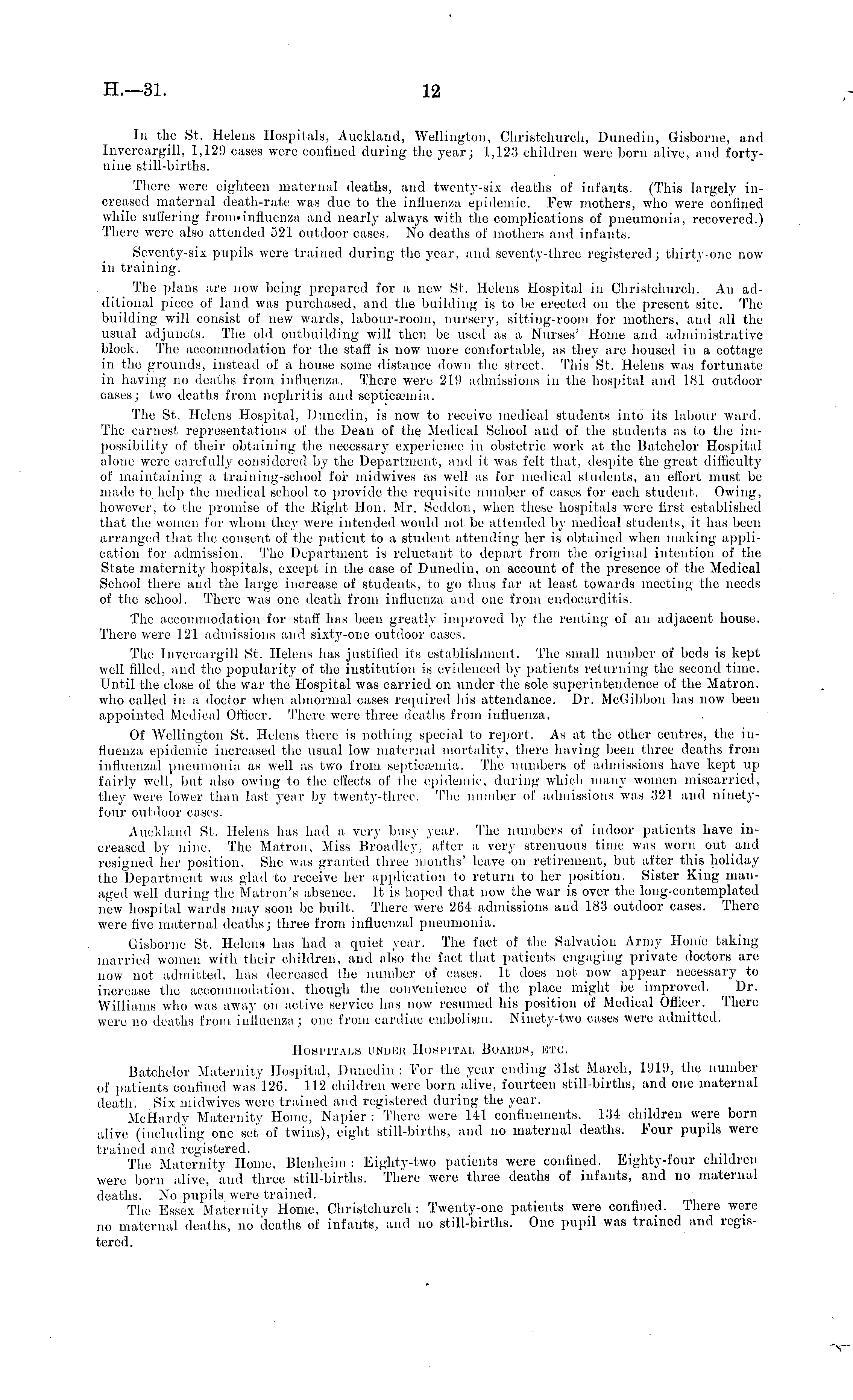 In the St. Helens Hospitals, Auckland, Wellington, Christchurch, Dunedin, Gisborne, and lnvercargill, 1,129 cases were confined during the year; 1,123 children were born alive, and fortynine still-births. There were eighteen maternal deaths, and twenty-six deaths of infants. (This largely increased maternal death-rate was due to the influenza epidemic. Few mothers, who were confined while suffering from.influenza and nearly always with the complications of pneumonia, recovered.) There were also attended 521 outdoor cases. No deaths of mothers and infants. Seventy-six pupils were trained during the year, and seventy-three registered; thirty-one now in training. The plans are now being prepared for a new St. Helens Hospital in Christchurch. An additional piece of land was purchased, and the building is to be erected on the present site. The building will consist of new wards, labour-room, nursery, sitting-room for mothers, and all the usual adjuncts. The old outbuilding will then be used as a Nurses' Home and administrative block. The accommodation for the staff is now more comfortable, as they are housed in a cottage in the grounds, instead of a house some distance down the si reel. This St. Helens was fortunate in having no deaths from influenza. There were 219 admissions in the hospital and 181 outdoor cases; two deaths from nephritis and septicaemia, The St. Helens Hospital, Dunedin, is now to receive medical students into its labour ward. The earnest representations of the Dean of the Medical School and of the students as Io the impossibility of their obtaining the necessary experience in obstetric work at the Batchelor Hospital alone were carefully considered by the Department, and it was felt that, despite the great difficulty of maintaining a training-school for midwives as well as for medical students, an effort must be made to help the medical school to provide the requisite number of cases for each student. Owing, however, to the promise of the Right Hon. Mr. Seddon, when these hospitals were first established that the women for whom they were intended would not be attended by medical students, it has been arranged that the consent of the patient to a student attending her is obtained when making application for admission. The Department is reluctant to depart from the original intention of the State maternity hospitals, except in the case of Dunedin, on account of the presence of the Medical School there and the large increase of students, to go thus far at least towards meeting the needs of the school. There was one death from influenza and one from endocarditis. The accommodation for staff has been greatly improved by (he renting of an adjacent house. There were 121 admissions and sixty-one outdoor cases. The lnvercargill St. Helens has justified its establishment. The small number of beds is kept well filled, and the popularity of the institution is evidenced by patients returning the second time. Until the close of the war the Hospital was carried on under the sole superintendence of the Matron, who called in a doctor when abnormal cases required his attendance. Dr. McGibbon has now been appointed Medical Officer. There were three deaths from influenza. Of Wellington St. Helens there is nothing special to report. As at the other centres, the influenza epidemic increased the usual low maternal mortality, there having been three deaths from influenzal pneumonia as well as two from septicaemia. The numbers of admissions have kept up fairly well, but also owing to the effects of the epidemic, during which many women miscarried, they were lower than last year by twenty-three. The number of admissions was 321 and ninetyfour outdoor cases. Auckland St. Helens has had a very bus,)' year. The numbers of indoor patients have increased by nine. The Matron, Miss Broadley, after a very strenuous time was worn out and resigned her position. She was granted three months' leave on retirement, but after this holiday the Department was glad to receive her application to return to her position, Sister King managed well during the Matron's absence. It is hoped that now the war is over the long-contemplated new hospital wards may soon be built. There were 264 admissions and 183 outdoor cases. There were five maternal deaths; three from influenzal pneumonia. Gisborne St. Helens has had a quiet year. The fact of the Salvation Army Home taking married women with their children, and also the fact that patients engaging private doctors are now not admitted, bus decreased the number of cases. It does not now appear necessary to increase the accommodation, though the convenience of the place might be improved. Dr. Williams who was away on active service has now resumed his position of Medical Officer. There were no deaths from influenza,; one from cardiac embolism. Ninety-two cases were admitted. Hospitals under Hospital Boards, etc. Batchelor Maternity Hospital, Dunedin : For the year ending 31st March, 1919, the number of patients confined was 126. 112 children were born alive, fourteen still-births, and one maternal death. Six midwives were trained and registered during the year. McHardy Maternity Home, Napier : There were 141 confinements. 134 children were born alive (including one set of twins), eight still-births, and no maternal deaths. Four pupils were trained and registered. . . The Maternity Home, Blenheim : Eighty-two patients were confined. Eighty-four children were born alive, and three still-births. There were three deaths of infants, and no maternal deaths. No pupils were trained. The Essex Maternity Home, Christchurch : Twenty-one patients were confined. There were no maternal deaths, no deaths of infants, and no still-births. One pupil was trained and registered.