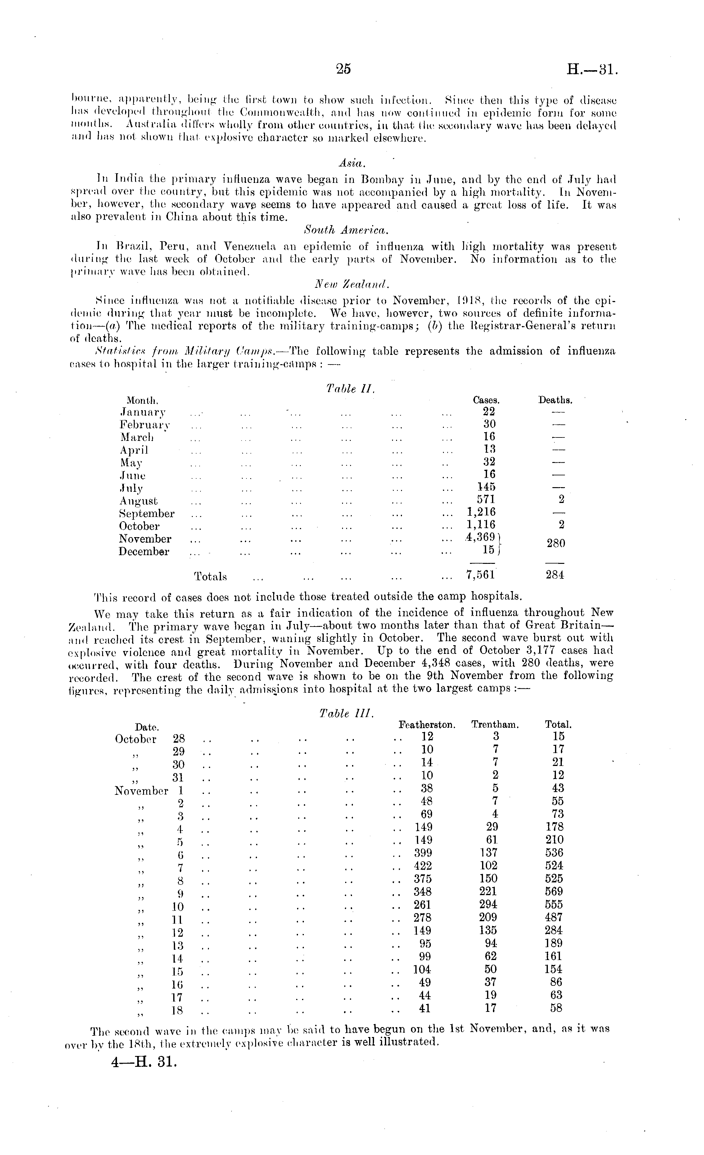 bourne, apparently, being the first town to show such infection. Since then this type of disease has developed throughout the Commonwealth, and has now continued in epidemic form for some months. Australia differs wholly from other countries, in that the secondary wave has been delayed and has not shown thai explosive character so marked elsewhere. Asia. In India the primary inlluenza wave began in Bombay in June, and by the end of July had spread over the country, but this epidemic was not accompanied by a high mortality. In November, however, the secondary wave seems to have appeared and caused a great loss of life. It was also prevalent in China about this time. South America. In Brazil, Peru, and Venezuela an epidemic of influenza with high mortality was present during the last week of October and the early parts of November. No information as to the primary wave has been obtained. New Zealand. Since influenza was not a notifiable disease prior to November, 1918, the records of the epidemic during that year must be incomplete. W« have, however, two sources of definite information — (a) The medical reports of the military training-camps; (b) the Begistrar-General's return of deaths. Statistics from Military Camps. —The following table represents the admission of influenza cases to hospital in the larger training-camps : — Table 11. Month. Cases. Deaths. January ...- ... "... ... ... ... 22 February ... ... ... ... ... ... 30 March ... ... ... ... ... 16 ■ — April ... ... ... ... ... ... 13 May ... ... ... ... ... •• 32 June . . ... ... ... ... 16 July ... ... ... ... ... ... 145 August ... ... ... ... ... ... 571 2 September ... ... ... ... ... ... 1,216 October ... ... ... ... ... ... 1,116 2 November ... ... ... ... ... ... 4,369) 2fio December ... ... ... ... ... 15[ Totals 7,561. 284 This record of cases does not include those treated outside the camp hospitals. We may take this return as a fair indication of the incidence of influenza throughout New Zealand. The primary wave began in July —about two months later than that of Great Britain— and reached its crest in September, waning slightly in October. The second wave burst out with explosive violence and great mortality in November. Up to the end of October 3,177 cases had occurred, with four deaths. During November and December 4,348 cases, with 280 deaths, were recorded. The crest of the second wave is shown to be on the 9th November from the following figures, representing the daily admissions into hospital at the two largest camps : — Table 111. Date Foatherston. Trent-ham. Total. October' 28 . . .. 12 3 15 29 . .. .. •• ..10 7 17 " 30 ■ .. 14 7 21 31.. .. .. •• ..1.0 2 12 November 1 .. .. 38 5 43 2 .. .. •• ..48 7 55 .. 69 4 73 4 ...... 149 29 178 5 . .. .. ..149 61 210 6 .. .. .. ..399 137 536 7 .. .. ..422 102 524 8 . .. .. ..375 150 525 9 .. .. ..348 221 569 10 .. .. .. 261 294 555 11 .. .. .. 278 209 487 12 .. .. •• 149 135 284 13 .. .. .. 95 94 189 14 .. .. ..99 62 161 15 .. .. .. 104 50 154 16 .. .. ..49 37 86 17 ...... 44 19 63 " t 18 41 17 58 The second wave in the camps may be said to have begun on the Ist November, and, as it was over by the 18th, the extremely explosive character is well illustrated.