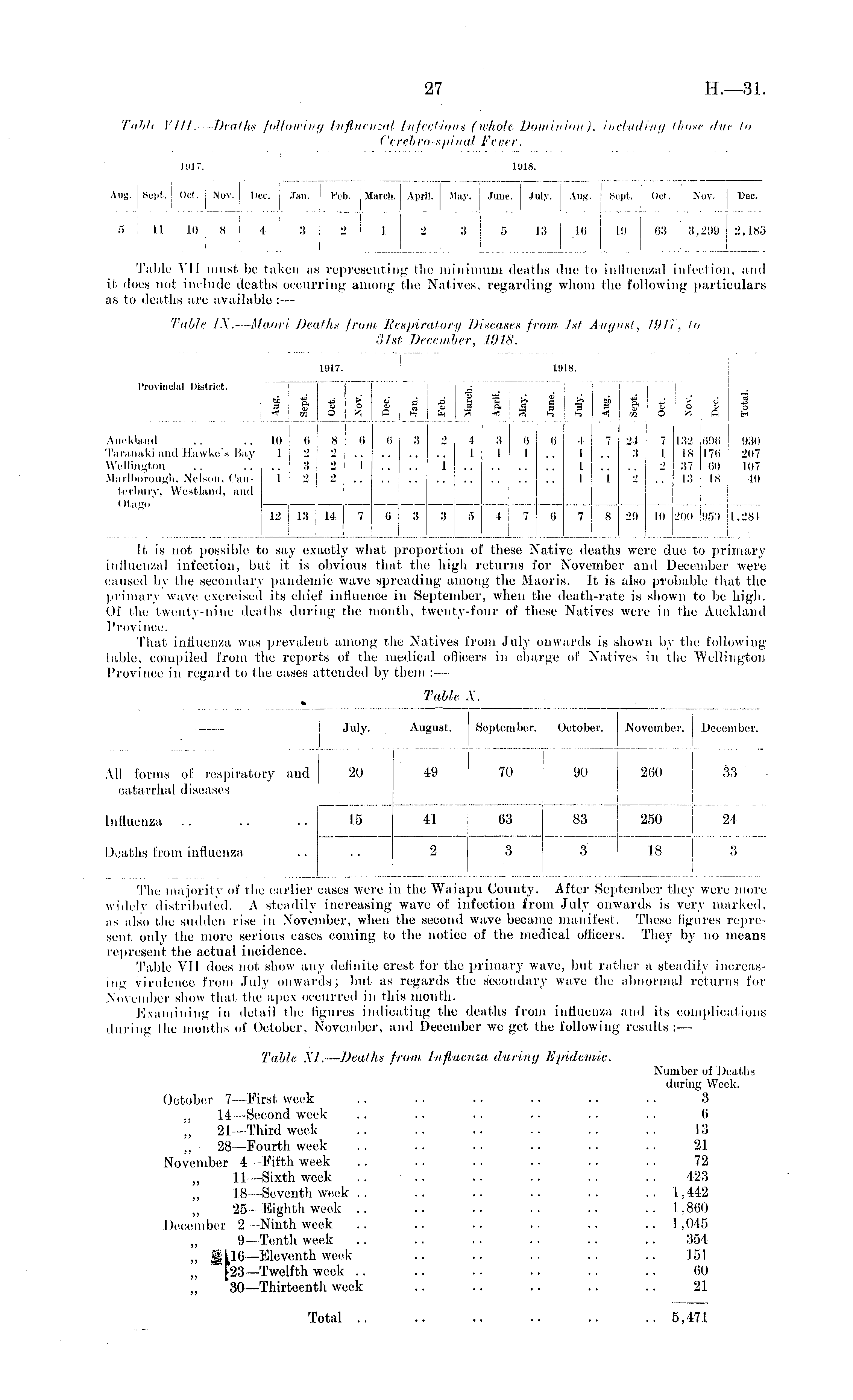 The majority of the earlier cases were in the Waiapu County. After September they were more widely distributed. A steadily increasing wave of infection from July onwards is very marked, as also the sudden rise in November, when the second wave became manifest. These figures represent only the more serious cases coming to the notice of the medical officers. by no means represent the actual incidence. Table VII does not show any definite crest for the primary wave, but, rather a steadily increasing virulence from July onwards; but as regards the secondary wave the abnormal returns for November show that the apex occurred in this mouth. Kxamining in detail the figures indicating the deaths from influenza and its complications during the months of October, November, and December we get the following results : — Table XI. — Deaths from Influenza during Epidemic. Number of Deaths during Week. October 7 -First week .. . . .. .. .. . . 3 ~ 14 —Second week . . . . . . . . . . ... 6 21—Third week .. .. .. .. .. .. 13 „ 28—Fourth week .. .. .. .. .. ... 21 November 4—Fifth week .. .. .. .. .. .. 72 11—Sixth week .. .. .. .. .. .. 423 ~ 1.8 -Seventh week .. .. .. .. .. ..1,442 25—Eighth week .. .. .. .. .. ~'1,860 December 2 -Ninth week .. .. .. .. .. .. 1,045 9-Tenth week .. .. .. .. .. .. 354 „ §116— Eleventh week .. .. .. .. .. 151 [23— Twelfth week .. .. .. .. .. .. 60 30—Thirteenth week .. .. .. .. .. 21 Total .. .. .. .. .. .. 5,471