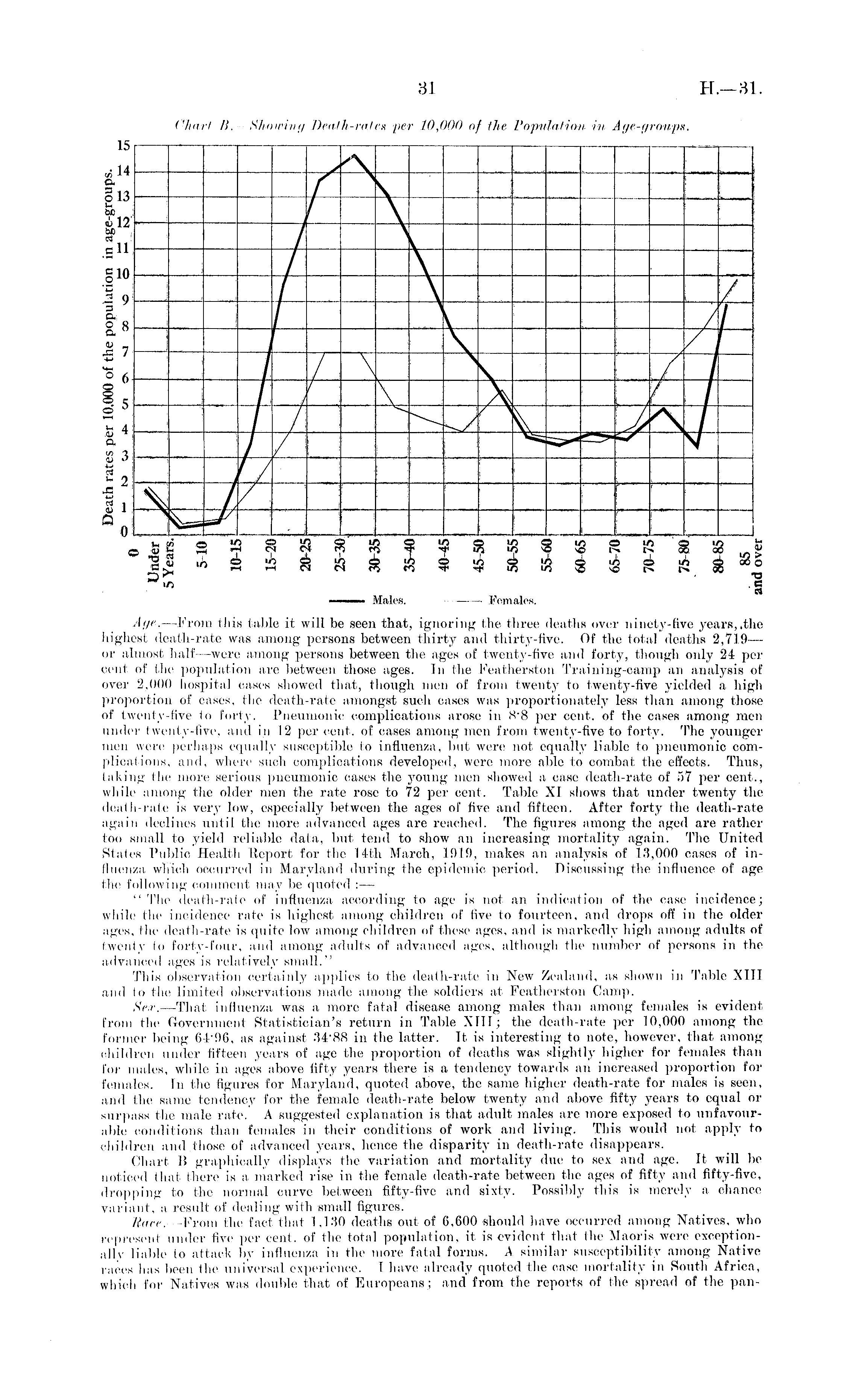 Age. —From this table it will be seen that, ignoring the three deaths over ninety-five years,.the highest death-rate was among persons between thirty and thirty-five. Of the total deaths 2,719 — or almost half—were among persons between the ages of twenty-five and forty, though only 24 per cent of the population are between those ages. In the Featherston Training-camp an analysis of over 2,000 hospital cases showed that, though men of from twenty to twenty-five yielded a high proportion of cases, the death-rate amongst such cases was proportionately less than among those of twenty-five to forty. Pneumonic complications arose in B'B per cent, of the cases among men under twenty-five, and in 12 per cent, of cases among men from twenty-five to forty. The younger men were perhaps equally susceptible to influenza, but were not equally liable to pneumonic complications, and, where such complications developed, were more able to combat the effects. Thus, taking the more serious pneumonic cases the young men showed a, case death-rate of 57 per cent., wliile among the older men the rate rose to 72 per cent. Table XI shows that under twenty the death-rate is very low, especially between the ages of five and fifteen. After forty the death-rate again declines until the more advanced ages are reached. The figures among the aged are rather too small to yield reliable data, but tend to show an increasing mortality again. The United States Public Health Report for the 14th March, 1919, makes an analysis of 13,000 cases of influenza which occurred in Maryland during the epidemic period. Discussing the influence of age the following comment may be quoted : — "The death-rate of influenza according to age is not an indication of the case incidence; while the incidence rate is highest among children of five to fourteen, and drops off in the older ages, the death-rate is quite low among children of these ages, and is markedly high among adults of twenty to forty-four, and among adults of advanced ages, although the number of persons in the advanced ages is relatively small." This observation certainly applies to the death-rate in New Zealand, as shown in Table XIII and to the limited observations made among the soldiers at Featherston Camp. Sex. —That influenza was a more fatal disease among males than among females is evident from the Government, Statistician's return in Table XIII; the death-rate per 10,000 among the former being 6496, as against 3488 in the latter. It is interesting to note, however, that among children under fifteen years of age the proportion of deaths was slightly higher for females than for males, while in ages above fifty years there is a tendency towards an increased proportion for females. In the figures for Maryland, quoted above, the same higher death-rate for males is seen, and the same tendency for the female death-rate below twenty and above fifty years to equal or surpass the male rate. A suggested explanation is that adult males are more exposed to unfavourable conditions than females in their conditions of work and living. This would not apply to children and those of advanced years, hence the disparity in death-rate disappears. Chart 15 graphically displays the variation and mortality due to se.x and age. It will be noticed that there is a marked rise in the female death-rate between the ages of fifty and fifty-five, dropping to the normal curve between fifty-five and sixty. Possibly this is merely a chance variant, a result of dealing with small figures. Race. —From the fact that 1,130 deaths out of 6,600 should have occurred among Natives, who represent under five per cent, of the total population, it is evident that the Maoris were exceptionally liable to attack by influenza in the more fatal forms. A similar susceptibility among Native races has been the universal experience. I have already quoted the case mortality in South Africa, which for Natives was double that of Europeans; and from the reports of the spread of the pan-