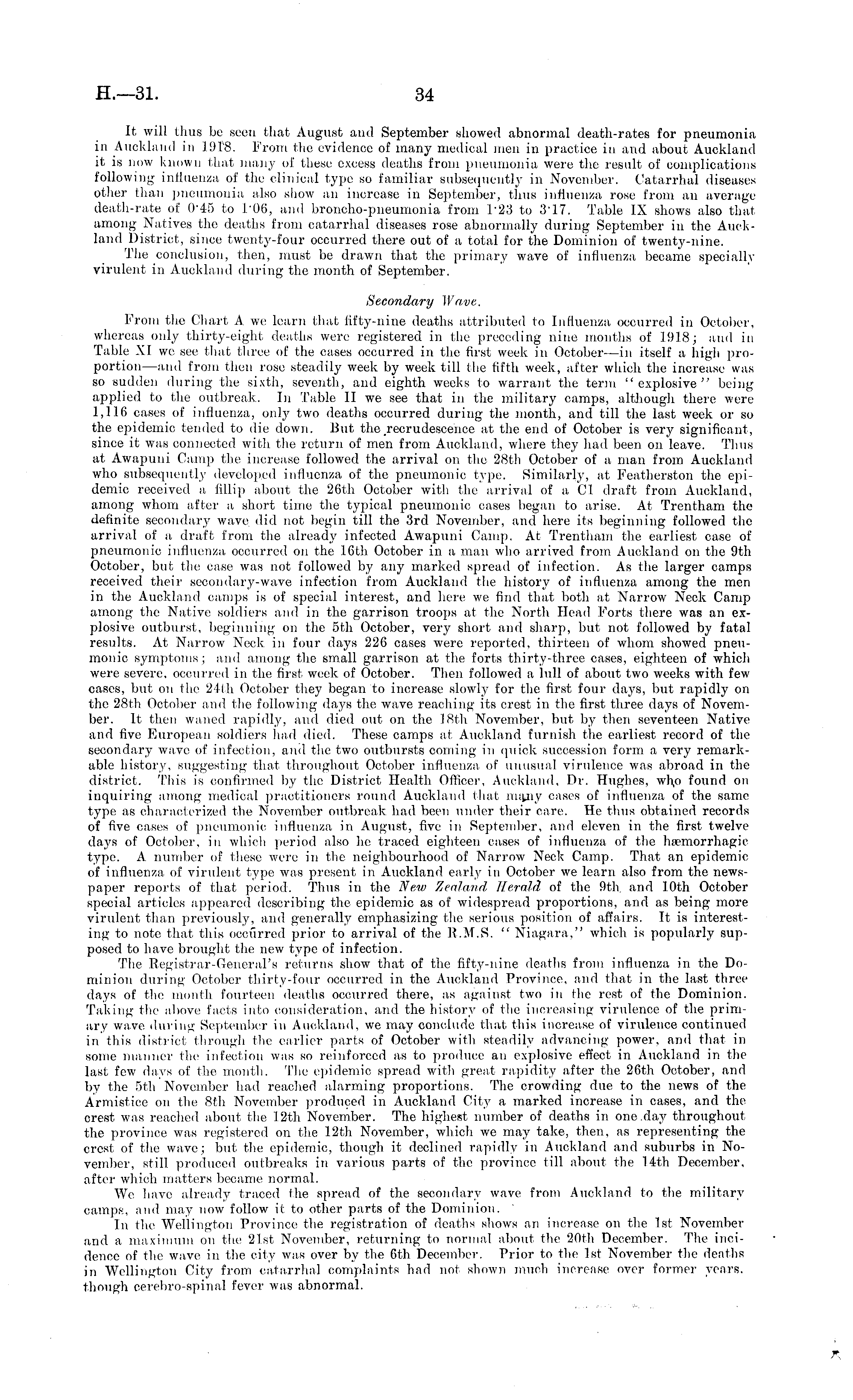 It will thus be seen that August and September showed abnormal death-rates for pneumonia in Auckland in 19T8. From the evidence of many medical men in practice in and about Auckland it is now known that many of these excess deaths from pneumonia were the result of complications following influenza of the clinical type so familiar subsequently in November. Catarrhal diseases other than pneumonia also show an increase in September, thus influenza rose from an average death-rate of 045 to I'o6, and broncho-pneumonia from 123 to 3"17. Table IX shows also that, among Natives the deaths from catarrhal diseases rose abnormally during September in the Auckland District, since twenty-four occurred there out of a total for the Dominion of twenty-nine. The conclusion, then, must be drawn that the primary wave of influenza became specially virulent in Auckland during the month of September. Secondary Wave. From the Chart A we learn that fifty-nine deaths attributed to Influenza occurred in October, whereas only thirty-eight deaths were registered in the preceding nine months of 1918; and in Table XI we see that three of the cases occurred in the first week in October —in itself a high proportion—and from then rose steadily week by week till the fifth week, after which the increase was so sudden during the sixth, seventh, and eighth weeks to warrant the term "explosive" being applied to the outbreak. In Table II we see that in the military camps, although there were 1,116 cases of influenza, only two deaths occurred during the month, and till the last week or so the epidemic tended to die down. Put the .recrudescence at the end of October is very significant, since it was connected with the return of men from Auckland, where they had been on leave. Thus at Awapuni Camp the increase followed the arrival on the 28th October of a man from Auckland who subsequently developed influenza of the pneumonic type. Similarly, at Featherston the epidemic received a fillip about the 26th October with the arrival of a, (JI draft from Auckland, among whom after a short time the typical pneumonic cases began to arise. At Trent-ham the definite secondary wave, did not begin till the 3rd November, and here its beginning followed the arrival of a draft from the already infected Awapuni Camp. At Trenthani the earliest case of pneumonic influenza occurred on the 16th October in a man who arrived from Auckland on the 9th October, but the case was not followed by any marked spread of infection. As the larger camps received their secondary-wave infection from Auckland the history of influenza among the men in the Auckland camps is of special interest, and here we find that both at Narrow Neck Camp among the Native soldiers and in the garrison troops at the North Head Forts there was an explosive outburst, beginning on the sth October, very short and sharp, but not, followed by fatal results. At Narrow Neck in four days 226 cases were reported, thirteen of whom showed pneumonic symptoms ; and among the small garrison at the forts thirty-three cases, eighteen of which were severe, occurred in the first week of October. Then followed a lull of about two weeks with few cases, but on the 24th October they began to increase slowly for the first four days, but rapidly on the 28th October and the following days the wave reaching its crest in the first three days of November. It then waned rapidly, and died out on the 18th November, but by then seventeen Native and five European soldiers had died. These camps at Auckland furnish the earliest record of the secondary wave of infection, and the two outbursts coming in quick succession form a very remarkable history, suggesting that throughout October influenza of unusual virulence was abroad in the district. This is confirmed by the District Health Officer, Auckland, Dr. Hughes, wlio found on inquiring among medical practitioners round Auckland that lmpiy cases of influenza of the same type as characterized the November outbreak had been under their care. He thus obtained records of five cases of pneumonic influenza in August, five in September, and eleven in the first twelve days of October, in which period also he traced eighteen cases of influenza of the hiemorrhagie type. A number of these were in the neighbourhood of Narrow Neck Camp. That an epidemic of influenza of virulent type was present in Auckland early in October we learn also from the newspaper reports of that period. Thus in the New Zealand, Herald, of the 9th. and lOth October special articles appeared describing the epidemic as of widespread proportions, and as being more virulent than previously, and generally emphasizing the serious position of affairs. It is interesting to note that this occurred prior to arrival of the P.M.S. " Niagara," which is popularly supposed to have brought the new type of infection. The Registrar-General's returns show that of the fifty-nine deaths from influenza in the Dominion during October thirty-four occurred in the Auckland Province, and that in the last three days of the month fourteen deaths occurred there, as against two in the rest of the Dominion. Taking the above facts into consideration, and the history of the increasing virulence of the primary wave during September in Auckland, we may conclude that this increase of virulence continued in this district through the earlier parts of October with steadily advancing power, and that in some manner the infection was so reinforced as to produce an explosive effect in Auckland in the last few days of the month. The epidemic spread with great rapidity after the 26th October, and by the sth November had reached alarming proportions. The crowding due to the news of the Armistice on the Bth November produced in Auckland City a marked increase in cases, and the crest was reached about the 12th November. The highest number of deaths in one .day throughout the province was registered on the 12th November, which we may take, then, as repre