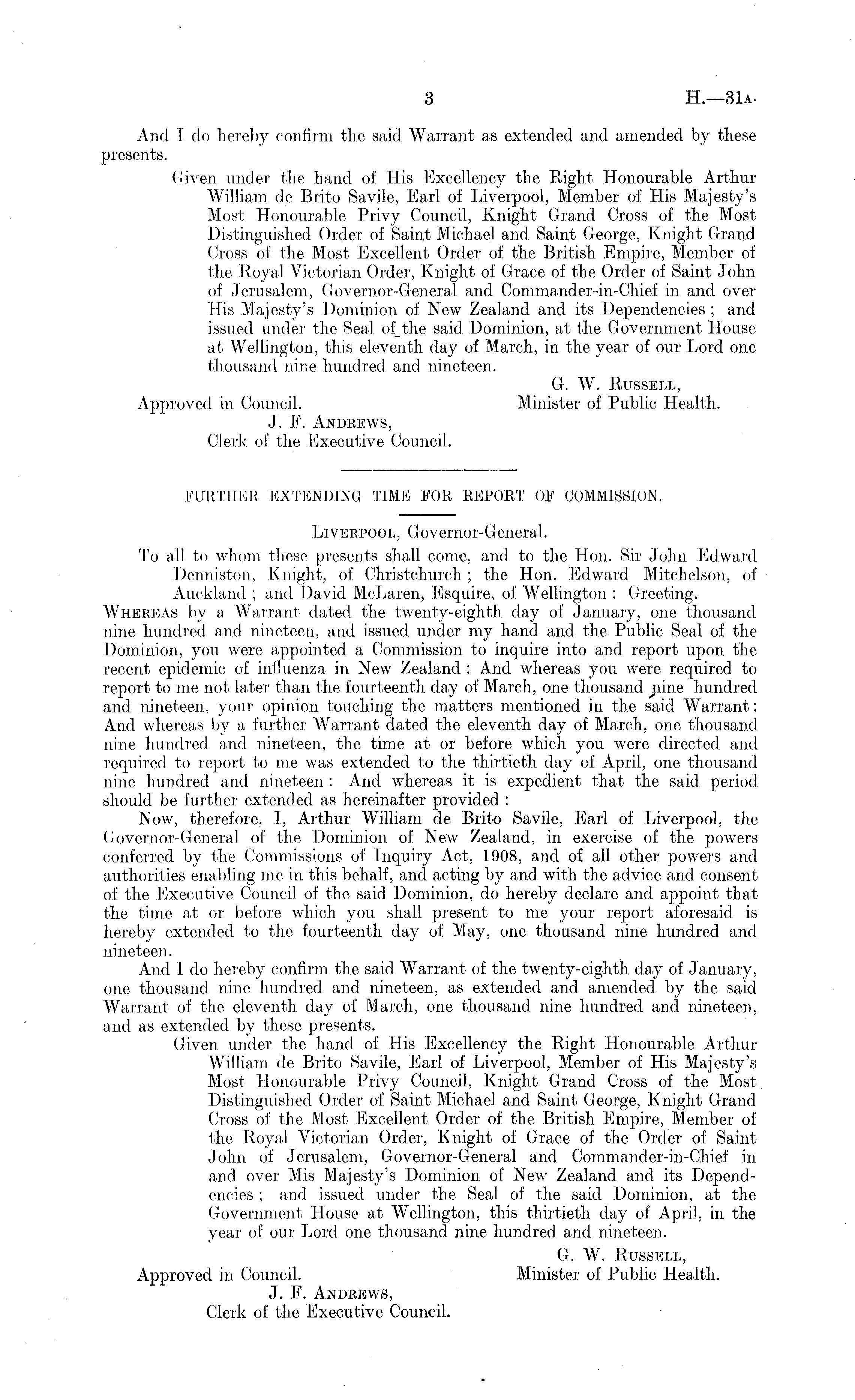 FURTHER EXTENDING TIME FOR REPORT OF COMMISSION. Liverpool, Governor-General. To all to whom these presents shall come, and to the Hon. Sir John Edward Denniston, Knight, of Christchurch ; the Hon. Edward Mitchelson, of Auckland ; and David McLaren, Esquire, of Wellington : Greeting. Whereas by a Warrant dated the twenty-eighth day of January, one thousand nine hundred and nineteen, and issued under my hand and the Public Seal of the Dominion, you were appointed a Commission to inquire into and report upon the recent epidemic of influenza in New Zealand : And whereas you were required to report to me not later than the fourteenth, day of March, one thousand nine hundred and nineteen, your opinion touching the matters mentioned in the said Warrant: And whereas by a further Warrant dated the eleventh day of March, one thousand nine hundred and nineteen, the time at or before which you were directed and required to report to me was extended to the thirtieth day of April, one thousand nine hundred and nineteen : And whereas it is expedient that the said period should be further extended as hereinafter provided : Now, therefore, I, Arthur William de Brito Savile, Earl of Liverpool, the Governor-General of the Dominion of New Zealand, in exercise of the powers conferred by the Commissions of Inquiry Act, 1908, and of all other powers and authorities enabling me in this behalf, and acting by and with the advice and consent of the Executive Council of the said Dominion, do hereby declare and appoint that the time at or before which you shall present to me your report aforesaid is hereby extended to the fourteenth day of May, one thousand nine hundred and nineteen. And I do hereby confirm the said Warrant of the twenty-eighth day of January, one thousand nine hundred, and nineteen, as extended and amended by the said Warrant of the. eleventh day of March, one thousand nine hundred and nineteen, and as extended by these presents. Given under the hand of His Excellency the Right Honourable Arthur William de Brito Savile, Earl of Liverpool, Member of His Majesty's Most Honourable Privy Council, Knight Grand Cross of the Most Distinguished Order of Saint Michael and Saint George, Knight Grand Cross of the Most Excellent Order of the British Empire, Member of the Royal Victorian Order, Knight of Grace of the Order of Saint John of Jerusalem, Governor-General and Commander-in-Chief in and over Mis Majesty's Dominion of New Zealand and. its Dependencies ; and issued under the Seal of the said. Dominion, at the Government House at Wellington, this thirtieth day of April, in the year of our Lord one thousand nine hundred and nineteen. G. W. Russell, Approved in Council. Minister of Public Health. J. F. Andrews, Clerk of the Executive Council.