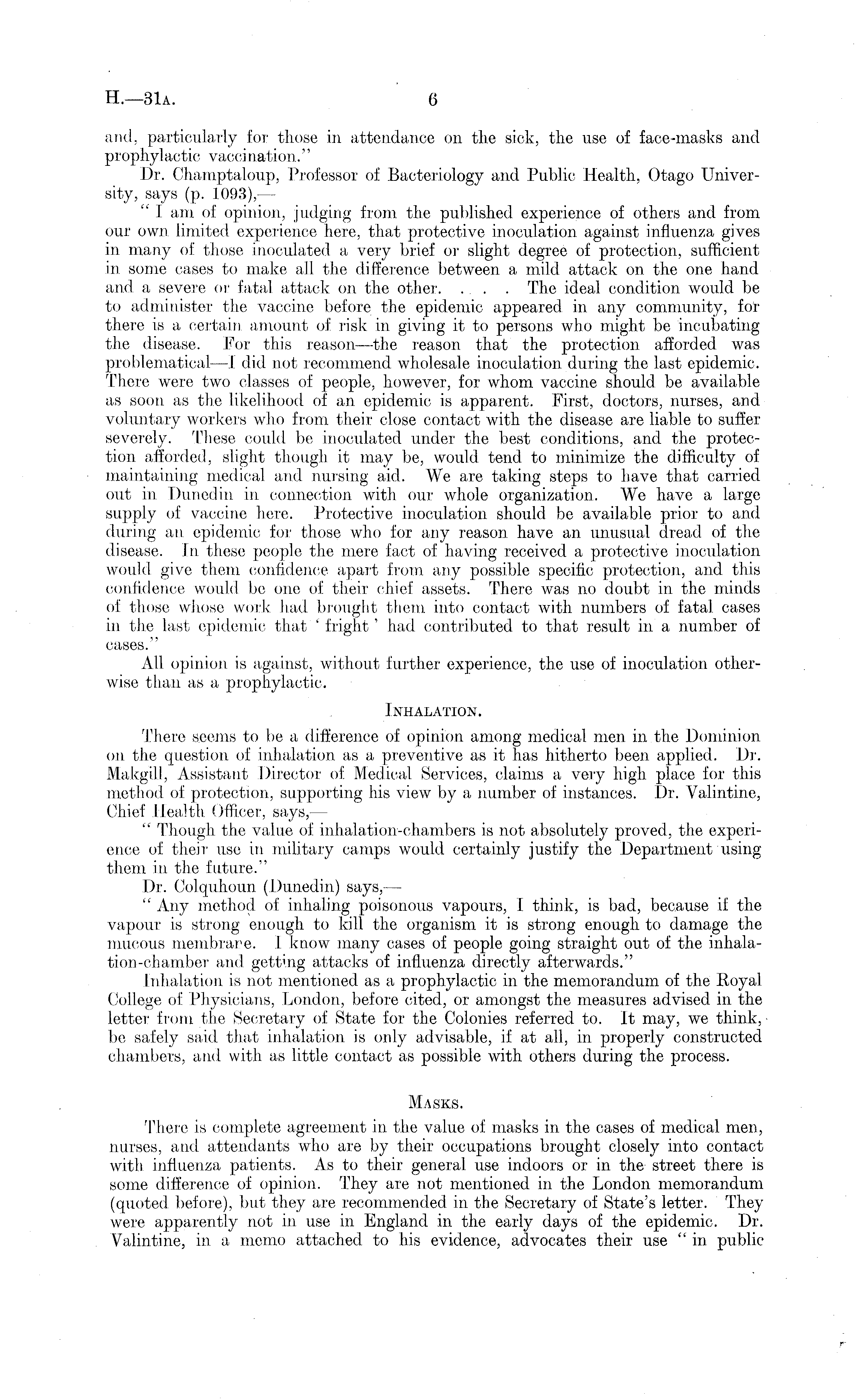 and, particularly for those in attendance on the sick, the use of face-masks and prophylactic vacci nation.'' Dr. Champtaloup, Professor of Bacteriology and Public Health, Otago University, says (p. 1093), — ' I am of opinion, judging from the published experience of others and from our own limited experience here, that protective inoculation against influenza gives in many of those inoculated a very brief or slight degree of protection, sufficient in some cases to make all the difference between a mild attack on the one hand and a severe or fatal attack on the other The ideal condition would be to administer the vaccine before the epidemic appeared in any community, for there is a certain, amount of risk in giving it to persons who might be incubating the disease. For this reason —the reason that the protection afforded was problematical—l did not recommend wholesale inoculation during the last epidemic. There were two classes of people, however, for whom vaccine should be available as soon as the likelihood of an epidemic is apparent. First, doctors, nurses, and voluntary workers who from their close contact with the disease are liable to suffer severely. These could be inoculated under the best conditions, and the protection afforded, slight though it may be, would tend to minimize the difficulty of maintaining medical and nursing aid. We are taking steps to have that carried out in Dunedin in connection with our' whole organization. We have a large supply of vaccine here. Protective inoculation should be available prior to and during an. epidemic for' those who for any reason, have an unusual dread of the disease. In these people the mere fact of having received a protective inoculation would give them confidence apart from any possible specific protection, and this confidence would be one of their chief assets. There was no doubt in the minds of those whose work had brought them into contact with numbers of fatal cases in the last epidemic that ' fright ' had contributed to that result in a number of cases." All opinion is against, without further experience, the use of inoculation otherwise than as a prophylactic. I nhalation. There seems to be a difference of opinion among medical men in the Dominion on the question, of inhalation as a preventive as it has hitherto been applied. Dr. Makgill, Assistant Director of Medical Services, claims a very high, place for this method of protection, supporting his view by a number of instances. Dr. Valintine, Chief Health Officer, says, — " Though the value of inhalation-chambers is not absolutely proved, the experience of their use in military camps would certainly justify the Department using them in the future." Dr. Colquhoun (Dunedin) says, — " Any method of inhaling poisonous vapours, I think, is bad, because if the vapour is strong enough to kill the organism it is strong enough to damage the mucous membrane. I know many cases of people going straight out of the inhala-tion-chamber and getting attacks of influenza directly afterwards." Inhalation is not mentioned as a prophylactic in the memorandum of the Royal College of Physicians, London, before cited, or amongst the measures advised in the letter from the Secretary of State for the Colonies referred to. It may, we think, be safely said that inhalation is only advisable, if at all, in properly constructed chambers, and with as little contact as possible with others during the process. Masks. There is complete agreement in the value of masks in the cases of medical men, nurses, and attendants who are by their occupations brought closely into contact with, influenza patients. As to their general use indoors or in the street there is some difference of opinion. They are not mentioned in the London memorandum (quoted before), but they are recommended in the Secretary of State's letter. They were apparently not in use in England in the early days of the epidemic. Dr. Valintine, in a memo attached to his evidence, advocates their use " in public
