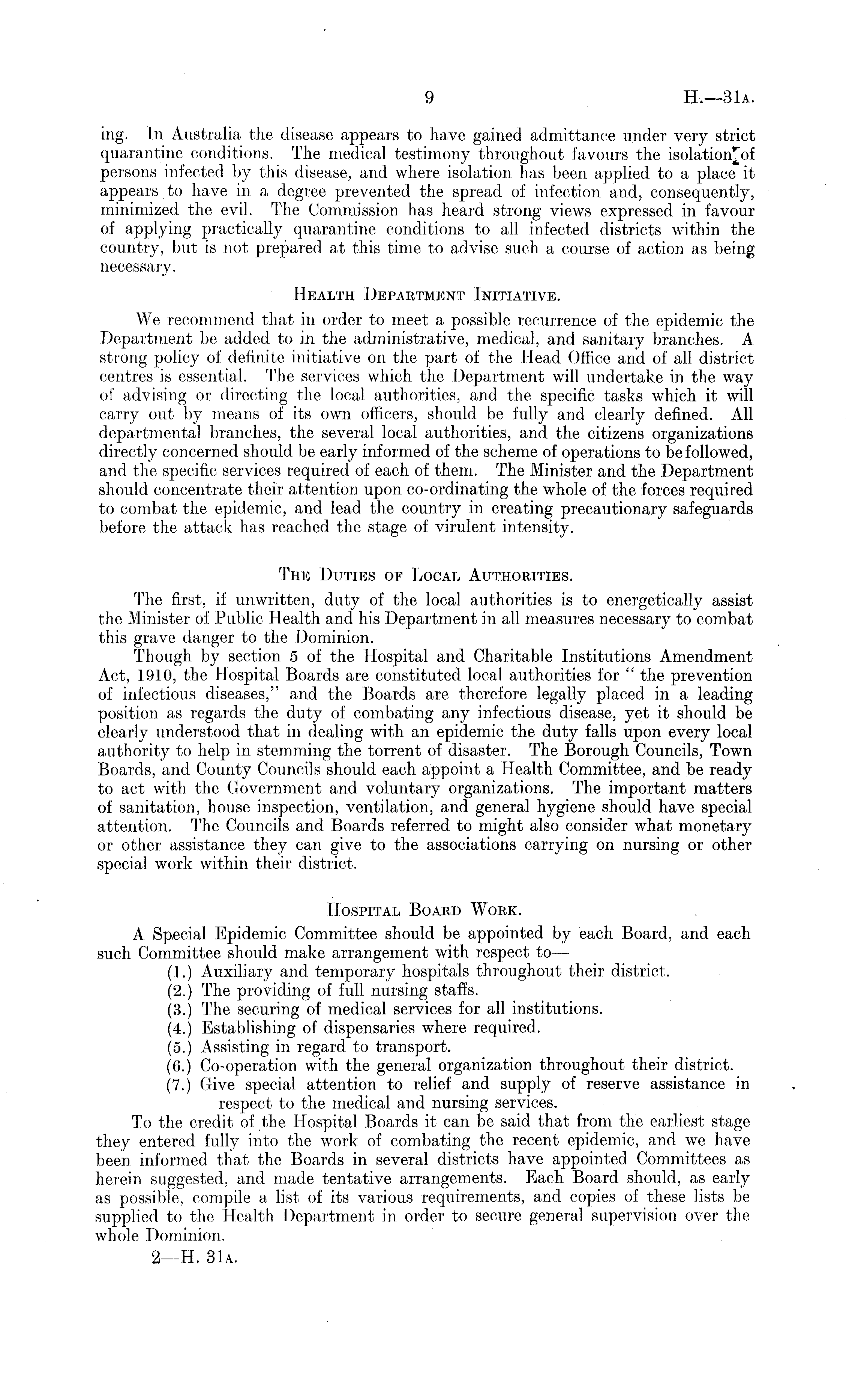 ing. In Australia the disease appears to have gained admittance under very strict quarantine conditions. The medical testimony throughout favours the isolationist' persons infected by this disease, and where isolation has been applied to a place it appears to have in a degree prevented the spread of infection, and, consequently, minimized the evil. The Commission has heard strong views expressed in favour of applying practically quarantine conditions to all infected districts within the country, but is not prepared at this time to advise such a course of action as being necessary. Health Department Initiative. We recommend that in order to meet a possible recurrence of the epidemic the Department be added to in the administrative, medical, and sanitary branches. A strong policy of definite initiative on the part of the Head Office and of all district centres is essential. The services which the Department will irndertake in the way of advising or directing the local authorities, and the specific tasks which it will carry out by means of its own officers, should be fully and clearly defined. All departmental branches, the several local authorities, and the citizens organizations directly concerned should be early informed of the scheme of operations to be followed, and the specific services required of each of them. The Minister and the Department should concentrate their attention upon co-ordinating the whole of the forces required to combat the epidemic, and lead the country in creating precautionary safeguards before the attack has reached the stage of virulent intensity. The Duties of Local Authorities. The first, if unwritten, duty of the local authorities is to energetically assist the Minister of Public Health and his Department in all measures necessary to combat this grave danger to the Dominion. Though by section 5 of the Hospital and Charitable Institutions Amendment Act, 1910, the Hospital Boards are constituted local authorities for " the prevention of infectious diseases," and the Boards are therefore legally placed in a leading position as regards the duty of combating any infectious disease, yet it should be clearly understood that in dealing with an epidemic the duty falls upon every local authority to help in stemming the torrent of disaster. The Borough Councils, Town Boards, and County Councils should each appoint a Health Committee, and be ready to act with the Government and voluntary organizations. The important matters of sanitation, house inspection, ventilation, and general hygiene should have special attention. The Councils and Boards referred to might also consider what monetary or other assistance they can give to the associations carrying on nursing or other special work within their district. Hospital Board Work. A Special Epidemic Committee should be appointed by each Board, and each such Committee should make arrangement with respect to — (1.) Auxiliary and temporary hospitals throughout their district. (2.) The providing of full nursing staffs. (3.) The securing of medical services for all institutions. (4.) Establishing of dispensaries where required. (5.) Assisting in regard to transport. (6.) Co-operation with the general organization throughout their district. (7.) Give special attention to relief and supply of reserve assistance in respect to the medical and nursing services. To the credit of the Hospital Boards it can be said that from the earliest stage they entered fully into the work of combating the recent epidemic, and we have been informed that the Boards in several districts have appointed Committees as herein suggested, and made tentative arrangements. Each Board should, as early as possible, compile a list of its various requirements, and copies of these lists be supplied to the Health Department in order to secure general supervision over the whole Dominion.