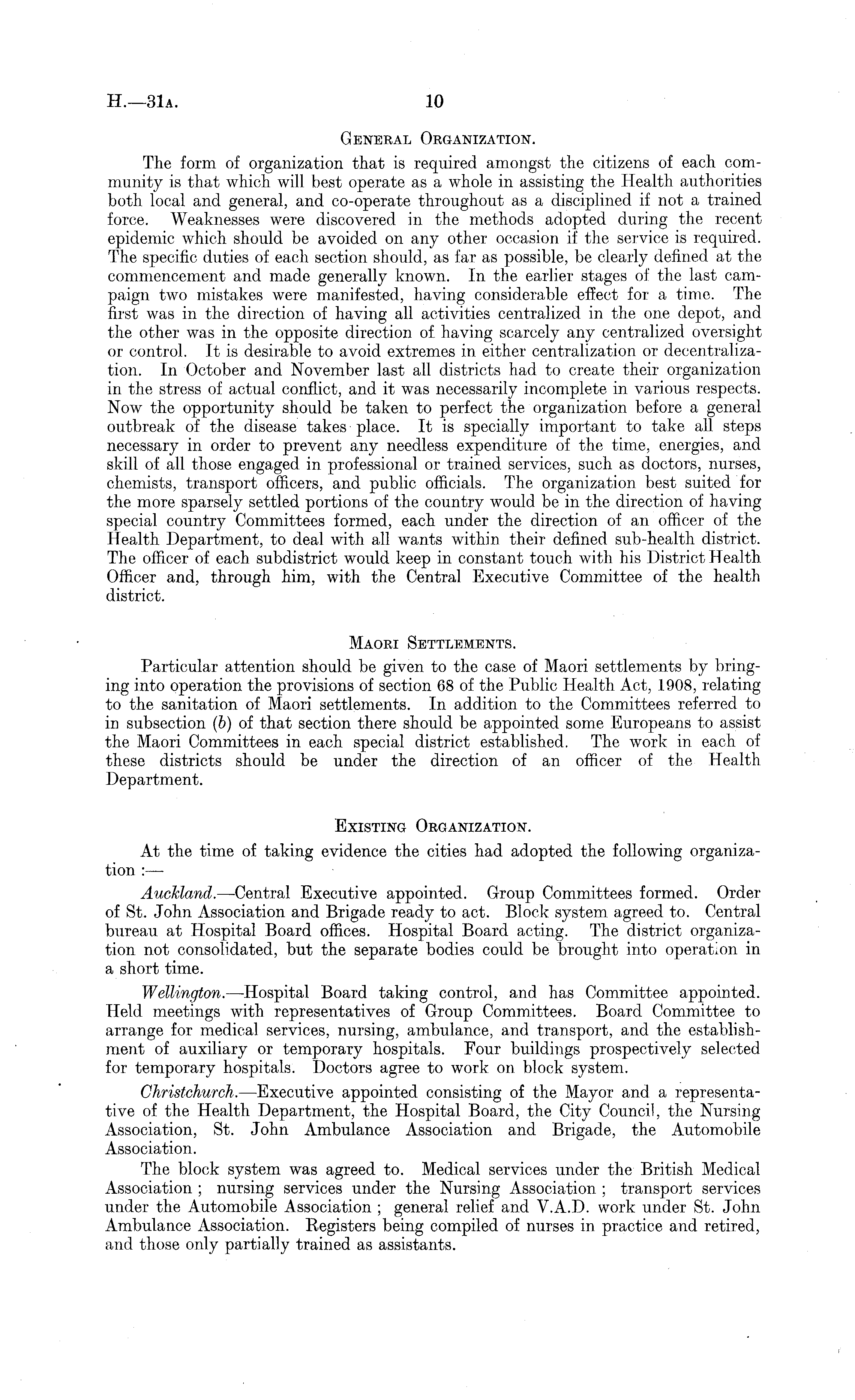 General Organization. The form of organization that is required amongst the citizens of each community is that which will best operate as a whole in assisting the Health authorities both local and general, and co-operate throughout as a disciplined if not a trained force. Weaknesses were discovered in the methods adopted during the recent epidemic which should be avoided on any other occasion if the service is required. The specific dirties of each section should, as far as possible, be clearly defined at the commencement and made generally known. In the earlier stages of the last campaign two mistakes were manifested, having considerable effect for a time. The first was in the direction of having all activities centralized in the one depot, and the other was in the opposite direction of having scarcely any centralized oversight or control. It is desirable to avoid extremes in either centralization or decentralization. In October and November last all districts had to create their organization in the stress of actual conflict, and it was necessarily incomplete in various respects. Now the opportunity should be taken to perfect the organization before a general outbreak of the disease takes place. It is specially important to take all steps necessary in order to prevent any needless expenditure of the time, energies, and skill of all those engaged in professional or trained services, such as doctors, nurses, chemists, transport officers, and public officials. The organization best suited for the more sparsely settled portions of the country would be in the direction of having special country Committees formed, each under the direction of an officer of the Health Department, to deal with all wants within their defined sub-health district. The officer of each subdistrict would keep in constant touch with his District Health Officer and, through him, with the Central Executive Committee of the health district. Maori Settlements. Particular attention should be given to the case of Maori settlements by bringing into operation the provisions of section 68 of the Public Health Act, 1908, relating to the sanitation of Maori settlements. In. addition to the Committees referred to in subsection (b) of that section there should be appointed some Europeans to assist the Maori Committees in each special district established. The work in each of these districts should be under the direction of an officer of the Health Department. Existing Organization. At the time of taking evidence the cities had adopted the following organization :— Auckland. —Central Executive appointed. Group Committees formed. Order of St. John Association and Brigade ready to act. Block system agreed to. Central bureau at Hospital Board offices. Hospital Board acting. The district organization not consolidated, but the separate bodies could be brought into operation in a short time. Wellington. —Hospital Board taking control, and has Committee appointed. Held meetings with representatives of Group Committees. Board Committee to arrange for medical services, nursing, ambulance, and transport, and the establishment of auxiliary or temporary hospitals. Four buildings prospectively selected for temporary hospitals. Doctors agree to work on block system. Christchurch. —Executive appointed consisting of the Mayor and a representative of the Health Department, the Hospital Board, the City Council, the Nursing Association, St. John Ambulance Association and Brigade, the Automobile Association. The block system was agreed to. Medical services under the British Medical Association ; nursing services under the Nursing Association ; transport services under the Automobile Association ; general relief and V.A.D. work under St. John Ambulance Association. Registers being compiled of nurses in practice and retired, and those only partially trained as assistants.