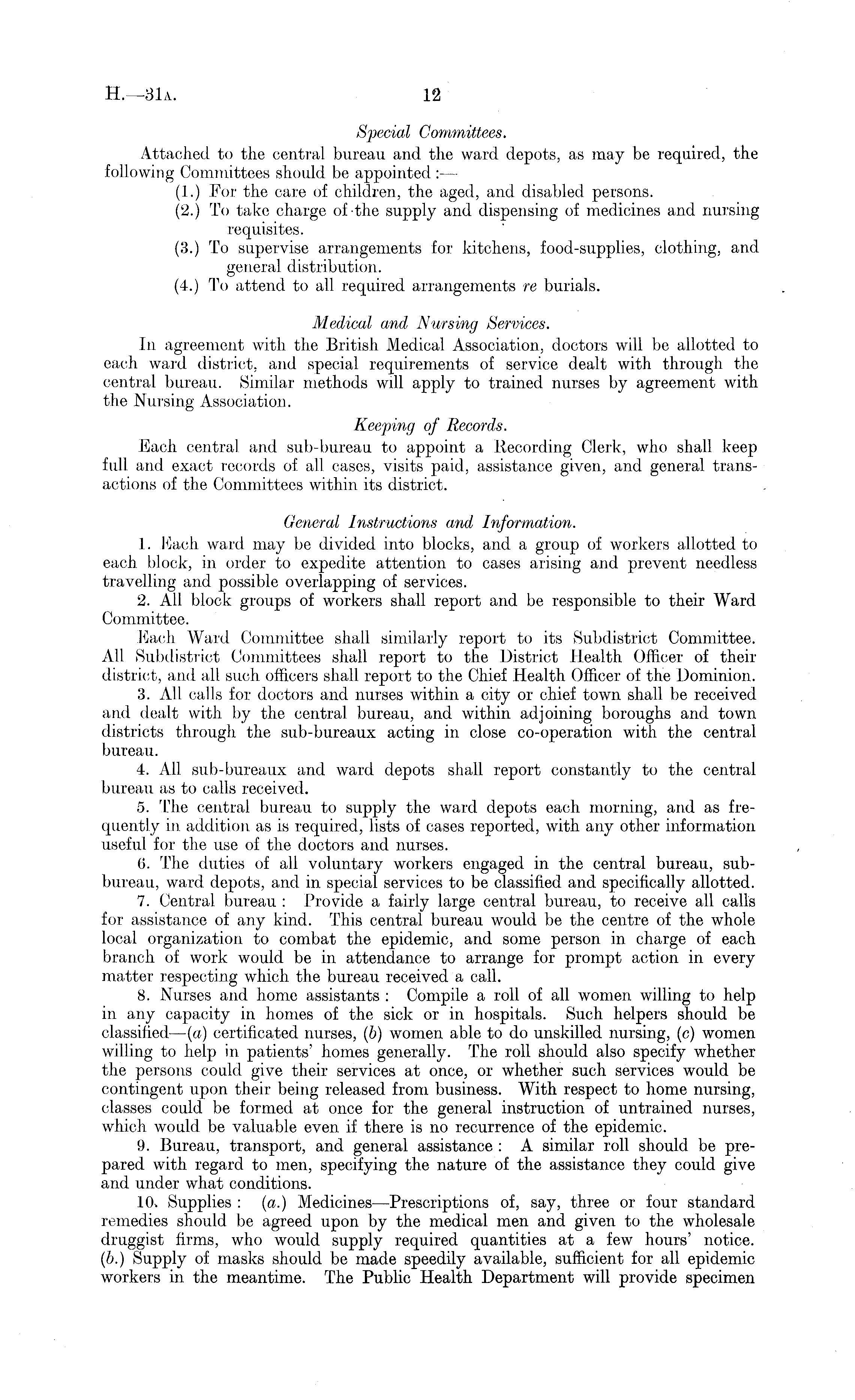 Special Committees. Attached to the central bureau and the ward depots, as may be required, the following Committees should be appointed : — (I.) For the care of children, the aged, and disabled persons. (2.) To take charge of the supply and dispensing of medicines and nursing requisites. (3.) To supervise arrangements for kitchens, food-supplies, clothing, and general distribution. (4.) To attend to all required arrangements re burials. Medical and Nursing Services. In agreement with the British Medical Association, doctors will be allotted to each ward district, and special requirements of service dealt with through the central bureau. Similar methods will apply to trained nurses by agreement with the Nursing Association. Keeping of Records. Each central and sub-bureau to appoint a Recording Clerk, who shall keep full and exact records of all cases, visits paid, assistance given, and general transactions of the Committees within its district. General Instructions and Information. 1. Each ward may be divided into blocks, and a group of workers allotted to each block, in order to expedite attention, to cases arising and prevent needless travelling and possible overlapping of services. 2. All block groups of workers shall report and be responsible to their Ward Committee. Each Ward Committee shall similarly report to its Subdistrict Committee. All Subdistrict Committees shall report to the District Health Officer of their district, and all such officers shall report to the Chief Health Officer of the Dominion. 3. All calls for doctors and nurses within a city or chief town shall be received and dealt with by the central bureau, and within adjoining boroughs and town districts through the sub-bureaux acting in close co-operation with the central bureau. 4. All sub-bureaux and ward depots shall report constantly to the central bureau as to calls received. 5. The central bureau to supply the ward depots each morning, and as frequently in addition as is required, lists of cases reported, with any other information useful for the use of the doctors and nurses. 6. The duties of all voluntary workers engaged in the central bureau, subbureau, ward depots, and in special services to be classified and specifically allotted. 7. Central bureau : Provide a fairly large central bureau, to receive all calls for assistance of any kind. This central bureau would be the centre of the whole local organization to combat the epidemic, and some person in charge of each branch of work would be in attendance to arrange for prompt action in every matter respecting which the bureau received a call. 8. Nurses and home assistants : Compile a roll of all women willing to help in any capacity in homes of the sick or in hospitals. Such helpers should be classified — (a) certificated nurses, (6) women able to do unskilled nursing, (c) women willing to help in patients' homes generally. The roll should also specify whether the persons could give their services at once, or whether such services would be contingent upon their being released from business. With respect to home nursing, classes could be formed at once for the general instruction of untrained nurses, which would be valuable even if there is no recurrence of the epidemic. 9. Bureau, transport, and general assistance : A similar roll should be prepared with regard to men, specifying the nature of the assistance they could give and under what conditions. 10. Supplies : (a.) Medicines—Prescriptions of, say, three or four standard remedies should be agreed upon by the medical men and given to the wholesale druggist firms, who would supply required quantities at a few hours' notice. (b.) Supply of masks should be made speedily available, sufficient for all epidemic workers in the meantime. The Public Health Department will provide specimen