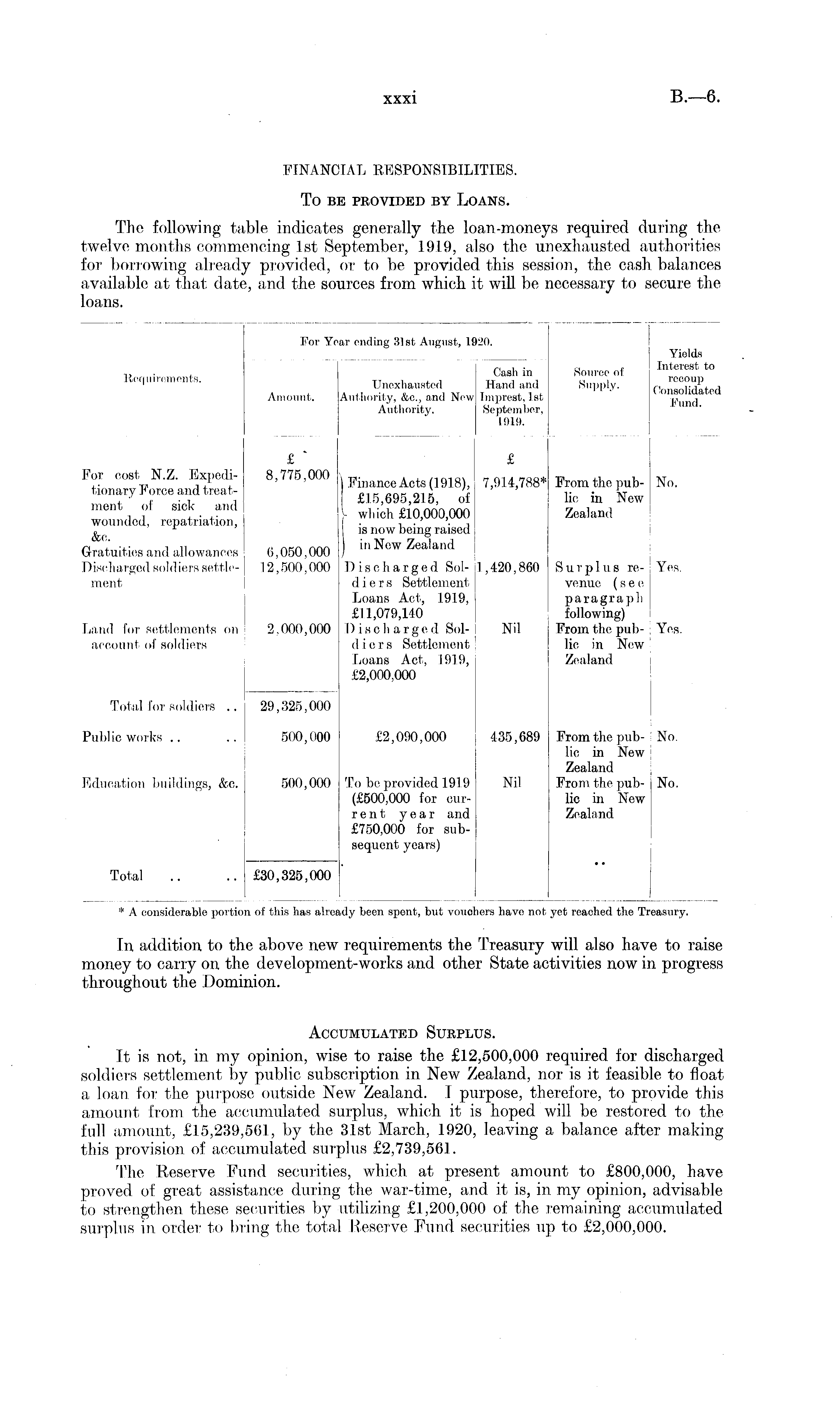 For Y. iar ending 31st August, 1920. Requirements. Yields Interest to Amount. Cash in Unexhausted Hand and Authority, &c., and New Imprest, 1st Authority. September, 1919. Cash in Source of Hand and Supply. Imprest, 1st September, recoup Consolidated Fund. For cost N.Z. Expeditionary Force and treatment of sick and wounded, repatriation, &c. 1919. £ 8,775,000 £ £ 7,914,788* From the public in New Zealand No. Gratuities and allowances Discharged soldiers settlement 6,050,000 12,500,000 Finance Acts (191.8), 7,914,788* £15,695,215, of I which £10,000,000 is now being raised in New Zealand Discharged Sol- 1,420,860 d i e r s Settlement Loans Act, 1919, £11,079,140 Discharged Sol- Nil d i e r s Settlement Loans Act, 1919, £2,000,000 1,420,860 1,420,860 Surplus revenue (see paragraph following) Nil From the public in New Zealand Yes. Land for settlements on account of soldiers 2,000,000 Nil Yes. Total for soldiers .. 29,325,000 Public works Education buildings, &c. 500,000 500,000 £2,090,000 435,689 To be provided 1919 Nil (£500,000 for current year and £750,000 for subsequent years) 435,689 From the public in New Zealand Nil From the public in New Zealand 435,689 Nil No. No. Total £30,325,000 * A considerable portio: iers have not yet reached the Tr of this has alrci ,dy been spent, but vouol ■easury.