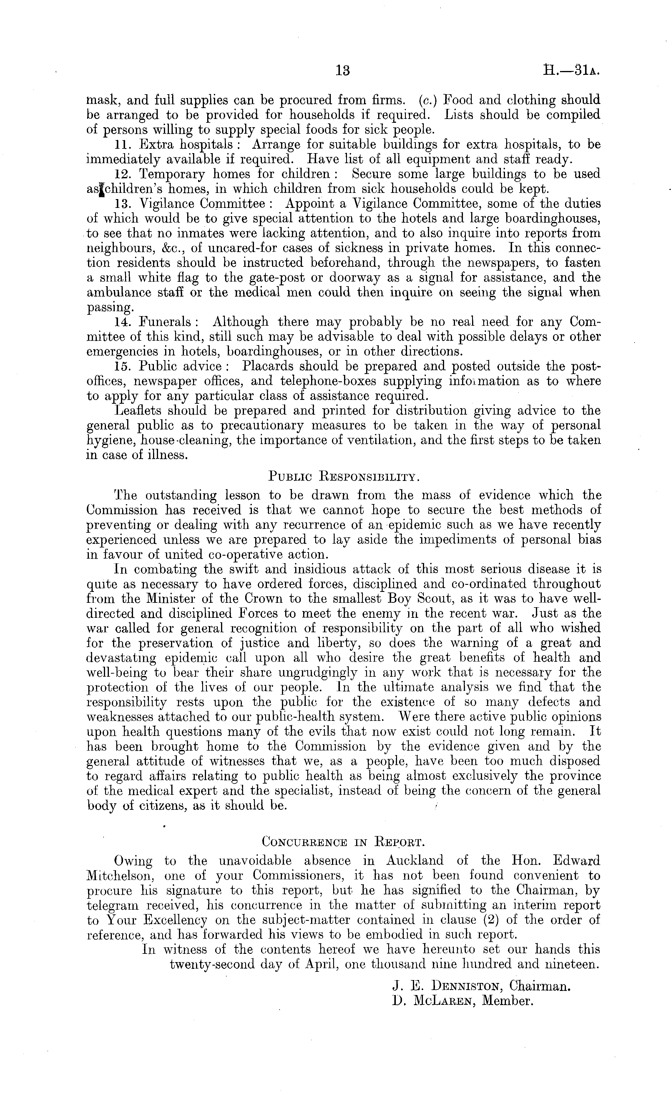 mask, and full supplies can be procured from firms, (c.) Food and clothing should be arranged to be provided for households if required. Lists should be compiled of persons willing to supply special foods for sick people. 11. Extra hospitals : Arrange for suitable buildings for extra hospitals, to be immediately available if required. Have list of all equipment and staff ready. 12. Temporary homes for children : Secure some large buildings to be used as|children's homes, in which children from sick households could be kept. 13. Vigilance Committee : Appoint a Vigilance Committee, some of the duties of which would be to give special attention to the hotels and large boardinghouses, to see that no inmates were lacking attention, and to also inquire into reports from neighbours, &c, of uncared-for cases of sickness in private homes. In this connection residents should be instructed beforehand, through the newspapers, to fasten a small white flag to the gate-post or doorway as a signal for assistance, and the ambulance staff or the medical men could then inquire on seeing the signal when passing. 14. Funerals : Although there may probably be no real need for any Committee of this kind, still such may be advisable to deal with possible delays or other emergencies in hotels, boardinghouses, or in other directions. 15. Public advice : Placards should be prepared and posted outside the postoffices, newspaper offices, and telephone-boxes supplying information as to where to apply for any particular class of assistance required. Leaflets should be prepared and printed for distribution giving advice to the general public as to precautionary measures to be taken in the way of personal hygiene, house cleaning, the importance of ventilation, and the first steps to be taken in case of illness. Public Responsibility. The outstanding lesson to be drawn from the mass of evidence which the Commission has received is that we cannot hope to secure the best methods of preventing or dealing with any recurrence of an epidemic such as we have recently experienced unless we are prepared to lay aside the impediments of personal bias in favour of united co-operative action. In combating the swift and insidious attack of this most serious disease it is quite as necessary to have ordered forces, disciplined and co-ordinated throughout from the Minister of the Crown to the smallest Boy Scout, as it was to have welldirected and disciplined Forces to meet the enemy in the recent war. Just as the war called for general recognition of responsibility on the part of all who wished for the preservation of justice and liberty, so does the warning of a great and devastating epidemic call upon all who desire the great benefits of health and well-being to bear their share ungrudgingly in any work that is necessary for the protection of the lives of our people. In the ultimate analysis we find that the responsibility rests upon the public for the existence of so many defects and weaknesses attached to our public-health system. Were there active public opinions upon health questions many of the evils that now exist could not long remain. It has been brought home to the Commission by the evidence given and by the general attitude of witnesses that we, as a people, have been too much disposed to regard affairs relating to public health as being almost exclusively the province of the medical expert and the specialist, instead of being the concern of the general body of citizens, as it should be. Concurrence in Report. Owing to the unavoidable absence in Auckland of the Hon. Edward Mitchelson, one of your Commissioners, it has not been found convenient to procure his signature to this report, but he has signified to the Chairman, by telegram received, his concurrence in the matter of submitting an interim report to Your Excellency on the subject-matter contained in clause (2) of the order of reference, and has forwarded his views to be embodied in such report. In witness of the contents hereof we have hereunto set our hands this twenty-second day of April, one thousand nine hundred and nineteen. J. E. Denniston, Chairman. D. McLaren, Member.