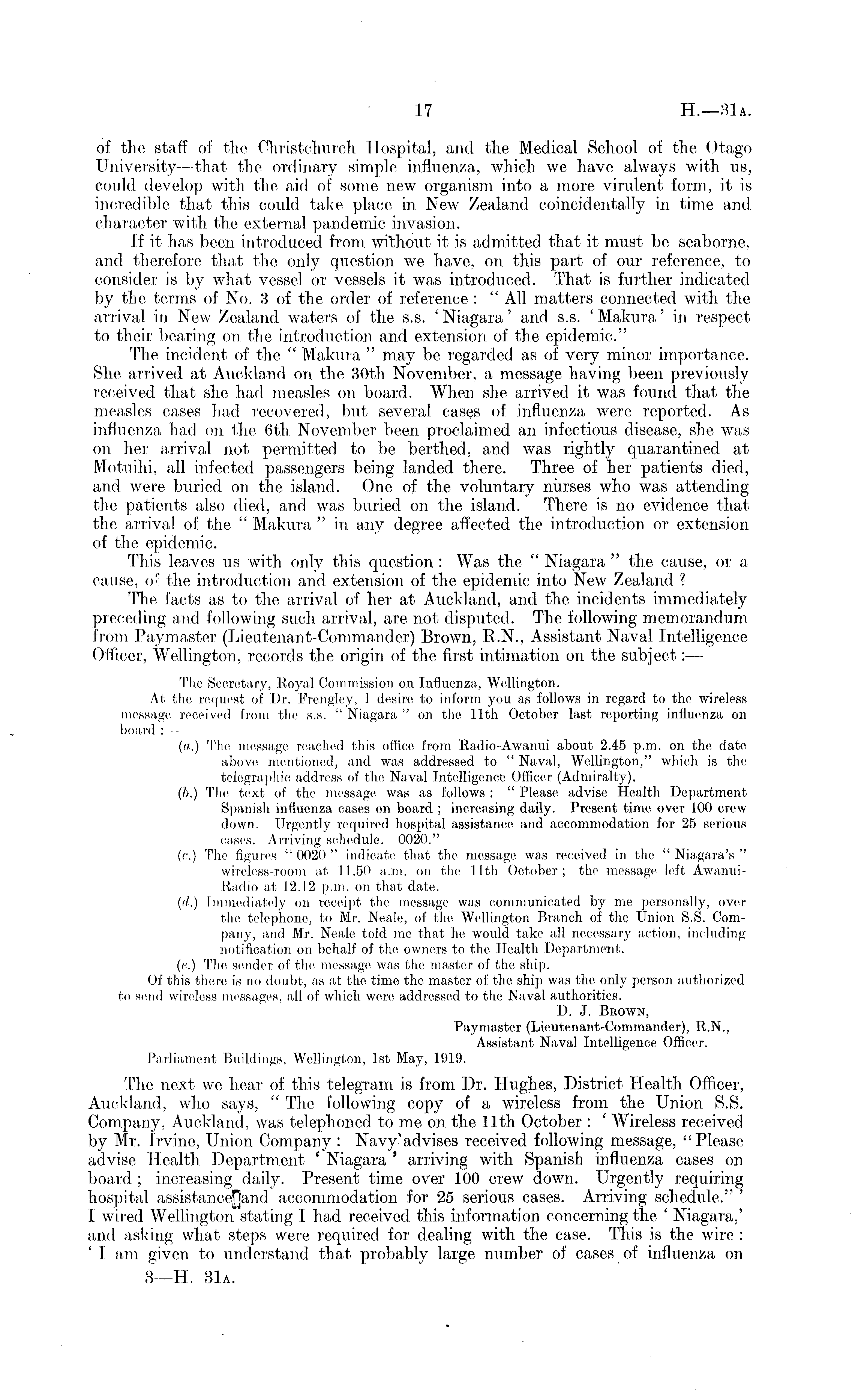 of the staff of the Christchurch Hospital, and the Medical School of the Otago University —that the ordinary simple influenza, which we have always with us, could develop with the aid of some new organism into a more virulent form, it is incredible that this could take place in New Zealand coincidentally in time and character with the external pandemic invasion. If it has been introduced from without it is admitted that it must be seaborne, and therefore that the only question we have, on this part of our reference, to consider is by what vessel or vessels it was introduced. That is further indicated by the terms of No. 3 of the order of reference : " All matters connected with the arrival in New Zealand waters of the s.s. ' Niagara' and s.s. ' Makura' in respect to their bearing on the introduction and extension of the epidemic." The incident of the " Makura " may be regarded as of very minor importance. She arrived at Auckland on the 30th November, a message having been previously received that she had measles on board. When she arrived it was found that the measles cases had recovered, but several cases of influenza were reported. As influenza had on the 6th November been proclaimed an infectious disease, she was on her arrival not permitted to be berthed, and was rightly quarantined at Motuihi, all infected passengers being landed there. Three of her patients died, and were buried on the island. One of the voluntary nurses who was attending the patients also died, and was buried on the island. There is no evidence that the arrival of the " Makura " in any degree affected the introduction or extension of the epidemic. This leaves us with only this question : Was the " Niagara " the cause, or a cause, of the introduction and extension of the epidemic into New Zealand ? The facts as to the arrival of her at Auckland, and the incidents immediately preceding and following such arrival, are not disputed. The following memorandum from Paymaster (Lieutenant-Commander) Brown, R.N., Assistant Naval Intelligence Officer, Wellington, records the origin of the first intimation on the subject: — The Secretary, Royal Commission on Influenza, Wellington. At the request of Dr. Frengley, I desire to inform you as follows in regard to the wireless message received from the s.s. " Niagara " on the 11th October last reporting influenza on board :— (a.) The message reached this office from Radio-Awanui about 2.45 p.m. on the date above mentioned, and was addressed to "Naval, Wellington," which is the telegraphic address of the Naval Intelligence Officer (Admiralty). (b.) The text of the message was as follows : " Please advise Health Department Spanish influenza cases on board ; increasing daily. Present time over 100 crew down. Urgently required hospital assistance and accommodation for 25 serious cases. Arriving schedule. 0020." (c.) The figures " 0020 " indicate that the message was received in the " Niagara's " wireless-room at 11.50 a.m. on the 11th October; the message left AwanuiRadio at 12.12 p.m. on that date. (d.) Immediately on receipt the message was communicated by me personally, over the telephone, to Mr. Neale, of the Wellington Branch of the Union S.S. Company, and Mr. Neale told me that he would take all necessary action, including notification on behalf of the owners to the Health Department. (c.) The sender of the message was the. master of the ship. Of this there is no doubt, as at the time the master of the ship was the only person authorized to send wireless messages, all of which were, addressed to the Naval authorities. D. J. Brown, Paymaster (Lieutenant-Commander), R.N., Assistant Naval Intelligence Officer. Parliament Buildings, Wellington, Ist May, 1919. The next we hear of this telegram is from Dr. Hughes, District Health Officer, Auckland, who says, " The following copy of a wireless from the Union S.S. Company, Auckland, was telephoned to me on the 11th October : ' Wireless received by Mr. Irvine, Union Company : Navy'advises received following message, "Please advise Health Department ' Niagara ' arriving with Spanish influenza cases on board ; increasing daily. Present time over 100 crew down. Urgently requiring hospital assistance Hand accommodation for 25 serious cases. Arriving schedule." I wired Wellington stating I had received this information concerning the ' Niagara,' and asking what steps were required for dealing with the case. This is the wire : 'I am given to understand that probably large number of cases of influenza on