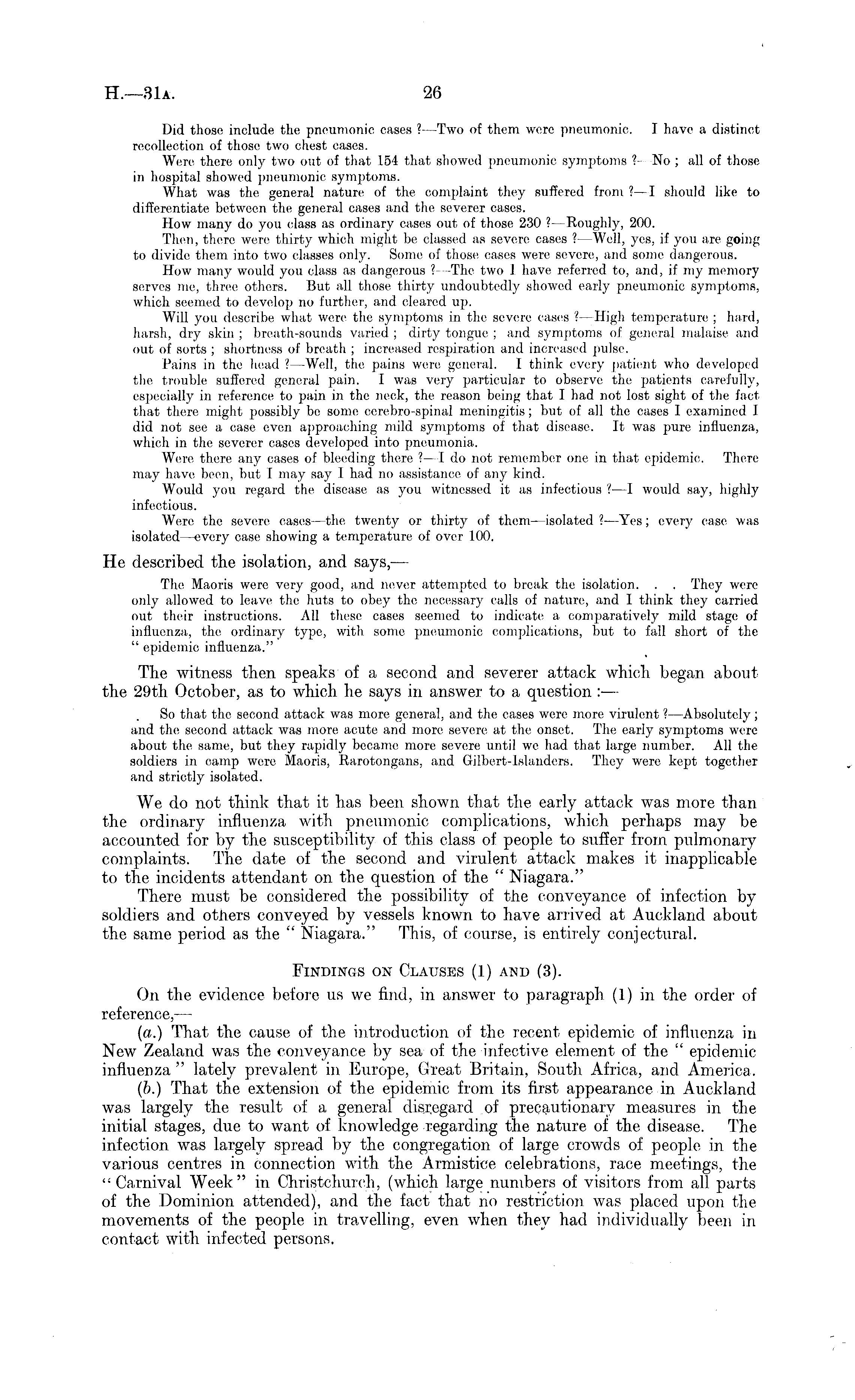 Did those include the pneumonic cases ? —Two of them were pneumonic. I have a distinct recollection of those two chest cases. Were there only two out of that 154 that showed pneumonic symptoms ?- No ; all of those in hospital showed pneumonic symptoms. What was the general nature of the complaint they suffered from ? —I should like to differentiate between the general cases and the severer cases. How many do you class as ordinary cases out of those, 230 ?— Roughly, 200. Then, there were thirty which might be classed as severe cases ? —Well, yes, if you are going to divide them into two classes only. Some of those cases were severe, and some dangerous. How many would you class as dangerous ? —The two I have referred to, and, if my memory serves me, three others. But all those thirty undoubtedly showed early pneumonic symptoms, which seemed to develop no further, and cleared up. Will you describe what were the symptoms in the severe cases ?—High temperature ; hard, harsh, dry skin ; breath-sounds varied ; dirty tongue ; and symptoms of general malaise and out of sorts ; shortness of breath ; increased respiration and increased pulse. Pains in the head ? —Well, the pains were general. I think every patient who developed the trouble suffered general pain. I was very particular to observe the patients carefully, especially in reference to pain in the neck, the reason being that I had not lost sight of the fact that there might possibly be some cerebro-spinal meningitis; but of all the cases I examined I did not see a case even approaching mild symptoms of that disease. It was pure influenza, which in the severer cases developed into pneumonia. Were there any cases of bleeding there ? —I do not remember one in that epidemic. There may have been, but I may say I had no assistance, of any kind. Would you regard the disease as you witnessed it as infectious ?—I would say, highly infectious. Were the severe cases —the twenty or thirty of them —isolated ? —Yes; every case was isolated —every case showing a temperature of over 100. He described the isolation, and says, — The Maoris were very good, and never attempted to break the isolation. . . They were only allowed to leave the huts to obey the necessary calls of nature, and I think they carried out their instructions. All these cases seemed to indicate a comparatively mild stage of influenza, the ordinary type, with some pneumonic complications, but to fall short of the " epidemic influenza." The witness then speaks of a second and severer attack which began about the 29th October, as to which he says in answer to a question : — So that the second attack was more general, and the cases were more virulent ? —Absolutely; and the second attack was more acute and more severe at the onset. The early symptoms were about the same, but they rapidly became more severe until we had that large number. All the soldiers in camp wore Maoris, Rarotongans, and Gilbert-Islanders. They were kept together and strictly isolated. We do not think that it has been shown that the early attack was more than the ordinary influenza with pneumonic complications, which perhaps may be accounted for by the susceptibility of this class of people to suffer from pulmonary complaints. The date of the second and virulent attack makes it inapplicable to the incidents attendant on the question of the " Niagara." There must be considered the possibility of the conveyance of infection by soldiers and others conveyed by vessels known to have arrived at Auckland about the same period as the " Niagara." This, of course, is entirely conjectural. Findings on Clauses (1) and (3). On the evidence before us we find, in answer to paragraph (1) in the order of reference, — (a.) That the cause of the introduction of the recent epidemic of influenza in New Zealand was the conveyance by sea of the infective element of the " epidemic influenza " lately prevalent in Europe, Great Britain, South Africa, and America. (b.) That the extension of the epidemic from its first appearance in Auckland was largely the result of a general disregard of precautionary measures in the initial stages, due to want of knowledge regarding the nature of the disease. The infection was largely spread by the congregation of large crowds of people in the various centres in connection with the Armistice celebrations, race meetings, the "Carnival Week" in Christchurch, (which large numbers of visitors from all parts of the Dominion attended), and the fact that no restriction was placed upon the movements of the people in travelling, even when they had individually been in contact with infected persons.